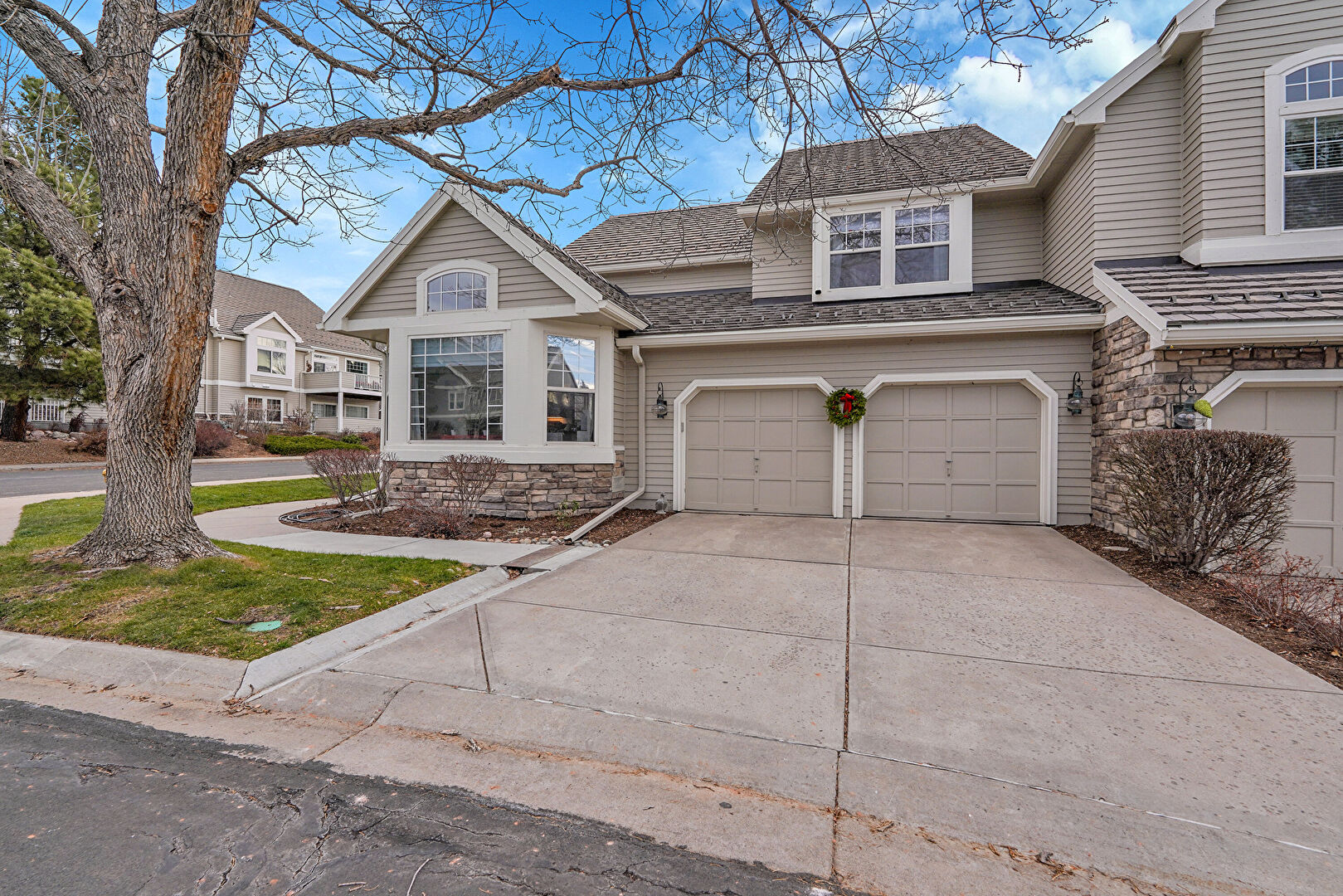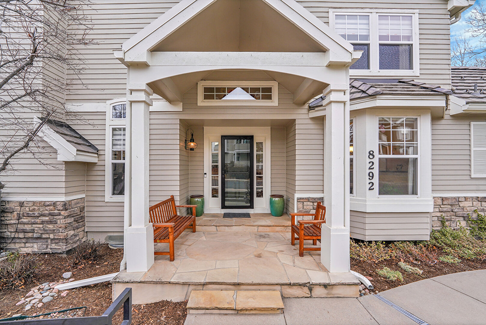 Built In Garage, Chimney, Downspout, Driveway, Fence, Garage, Gate, Gutters, Horizontal Siding, Lawn, Porch, Shingle Roof, Stone Siding, Downspout, Lawn, Shingle Roof, Stoop