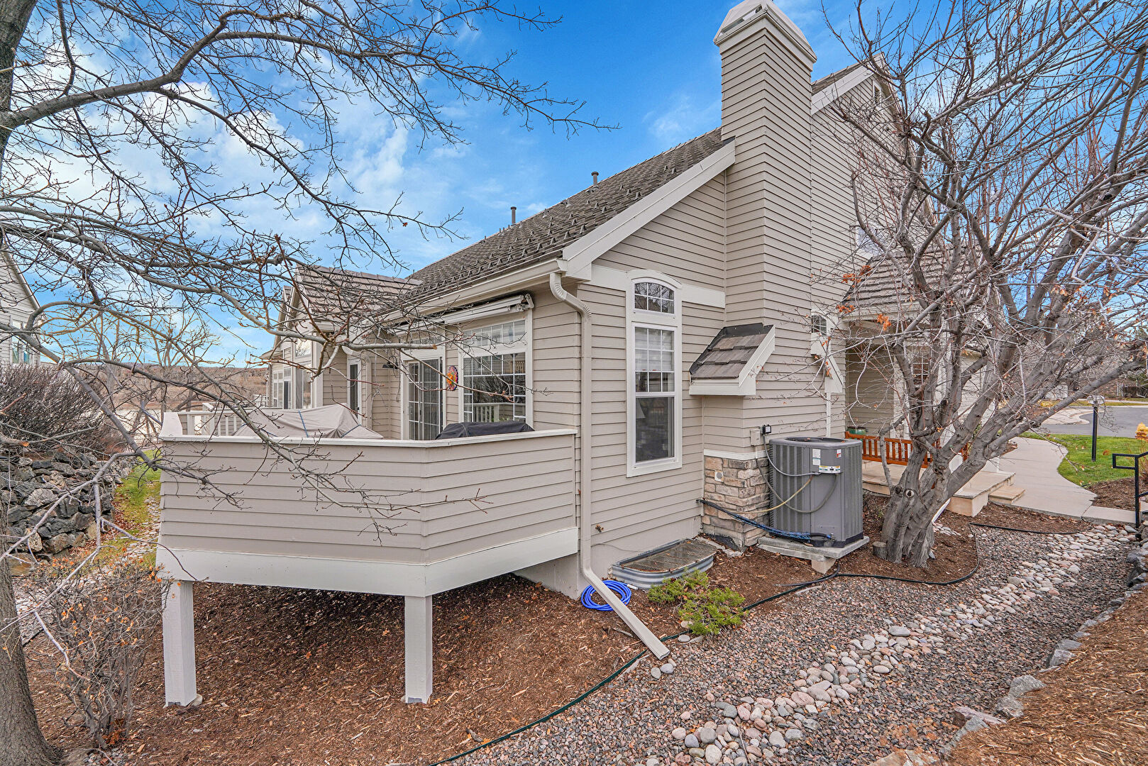 Central Ac, Chimney, Concrete Foundation, Downspout, Gutters, Horizontal Siding, Shingle Roof, Patio