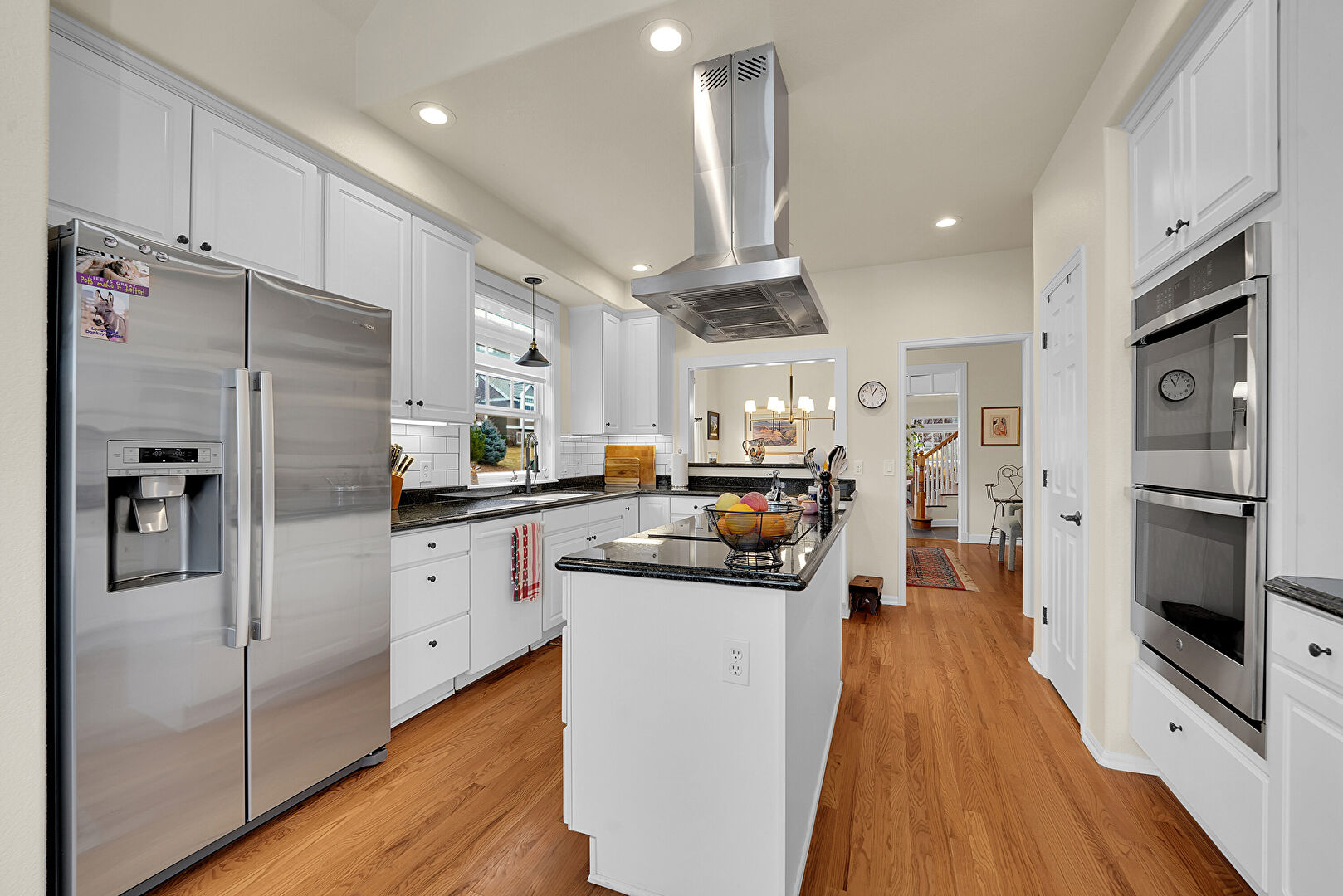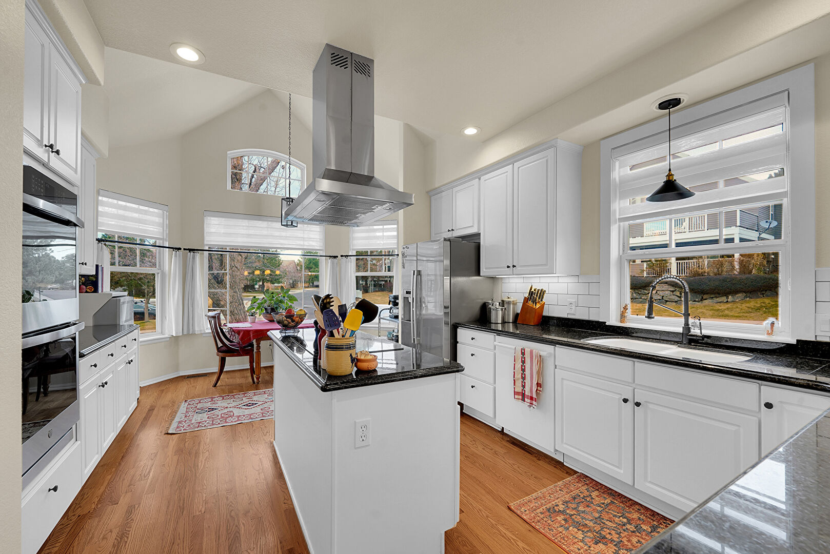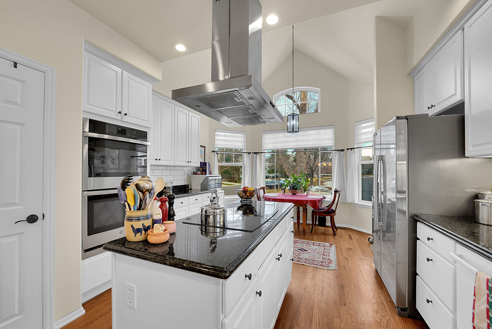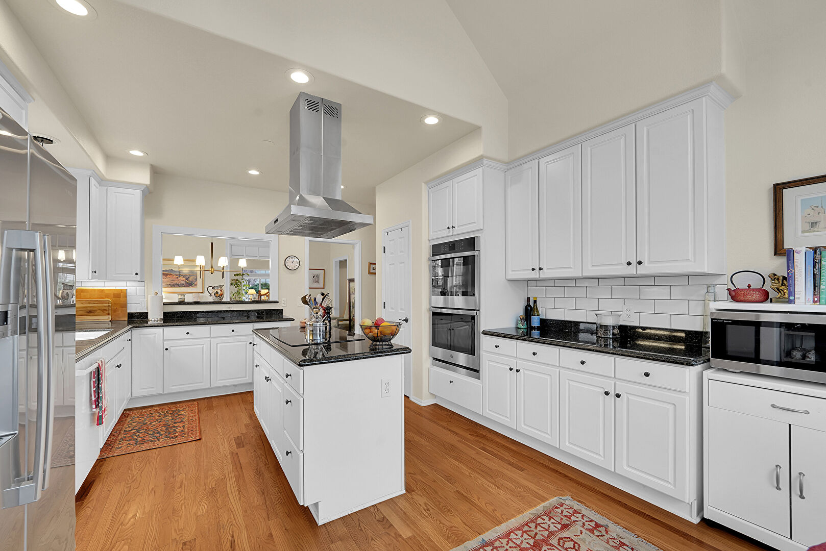Baseboards Wall, Crown Molding Cabinets, Double Oven, Drywall, High Ceiling, Kitchen Island, Kitchen Peninsula, Natural Light, Notable Chandelier, Pass Through Window, Pendant Lighting, Raised Cabinets, Recessed Lighting, Stone Countertops, Vaulted Ceiling, Wood Finish Floor, Crown Molding Cabinets, Pendant Lighting, Recessed Lighting, Stone Countertops
