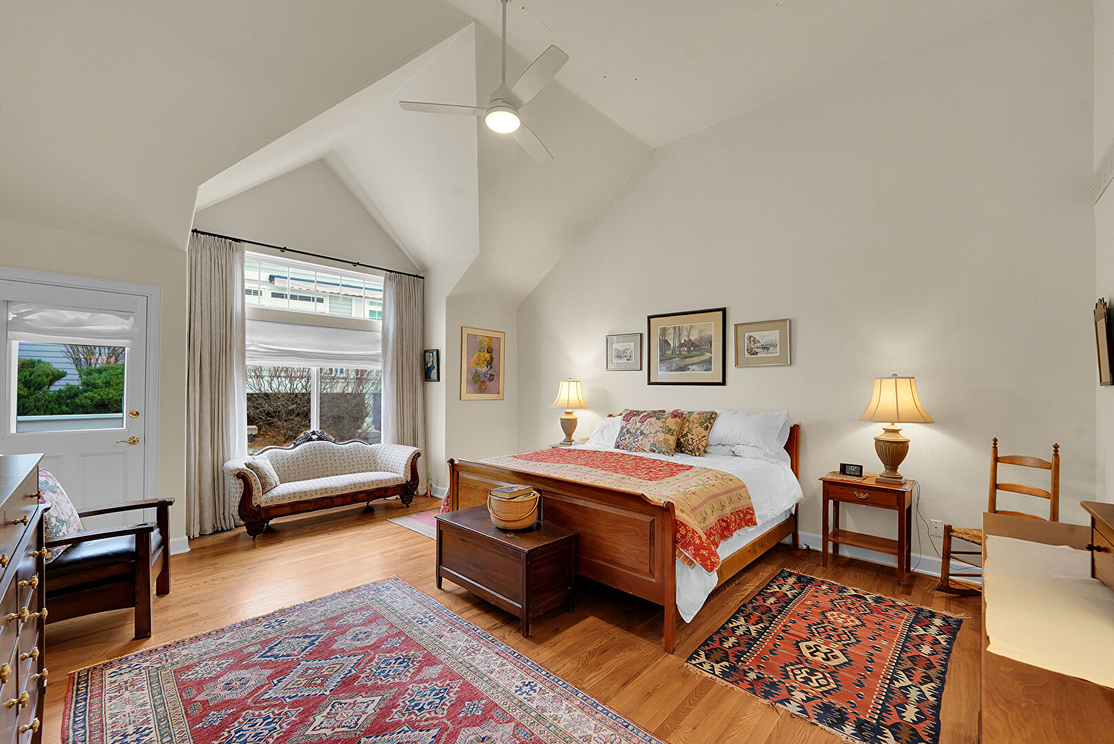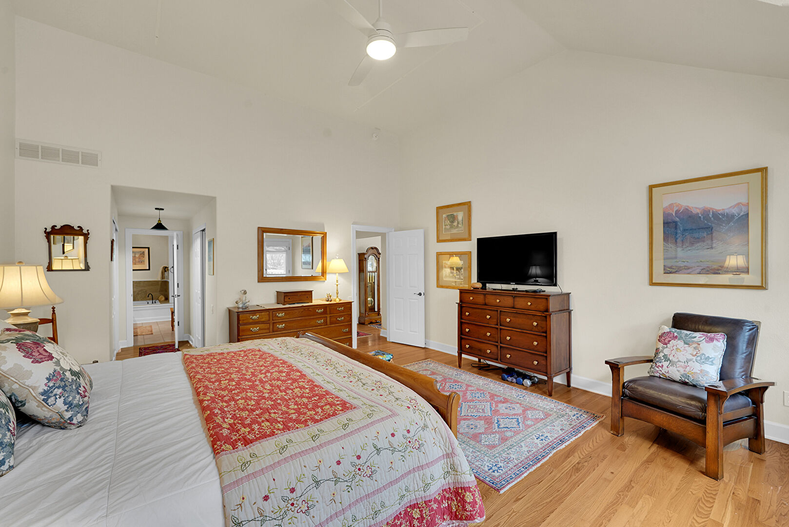Baseboards Wall, Cathedral Ceiling, Ceiling Fan, Drywall, High Ceiling, Natural Light, Vaulted Ceiling, Vent, Wood Finish Floor, Ceiling Fan, Vaulted Ceiling, Wood Finish Floor