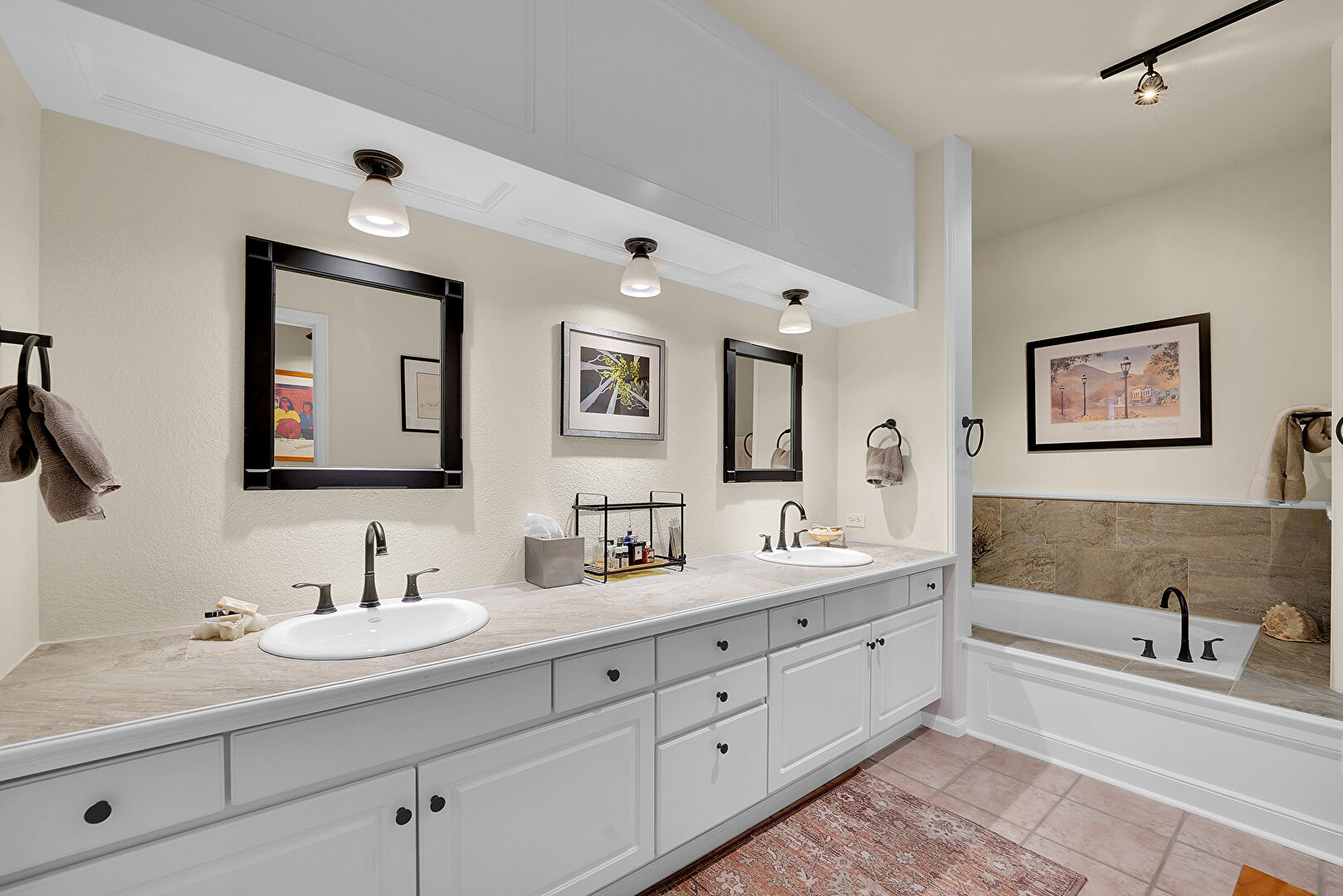 Double Vanity, Drywall, Full Bathroom, Tile Floor, Vanity, Full Bathroom, Tile Floor, Track Lighting