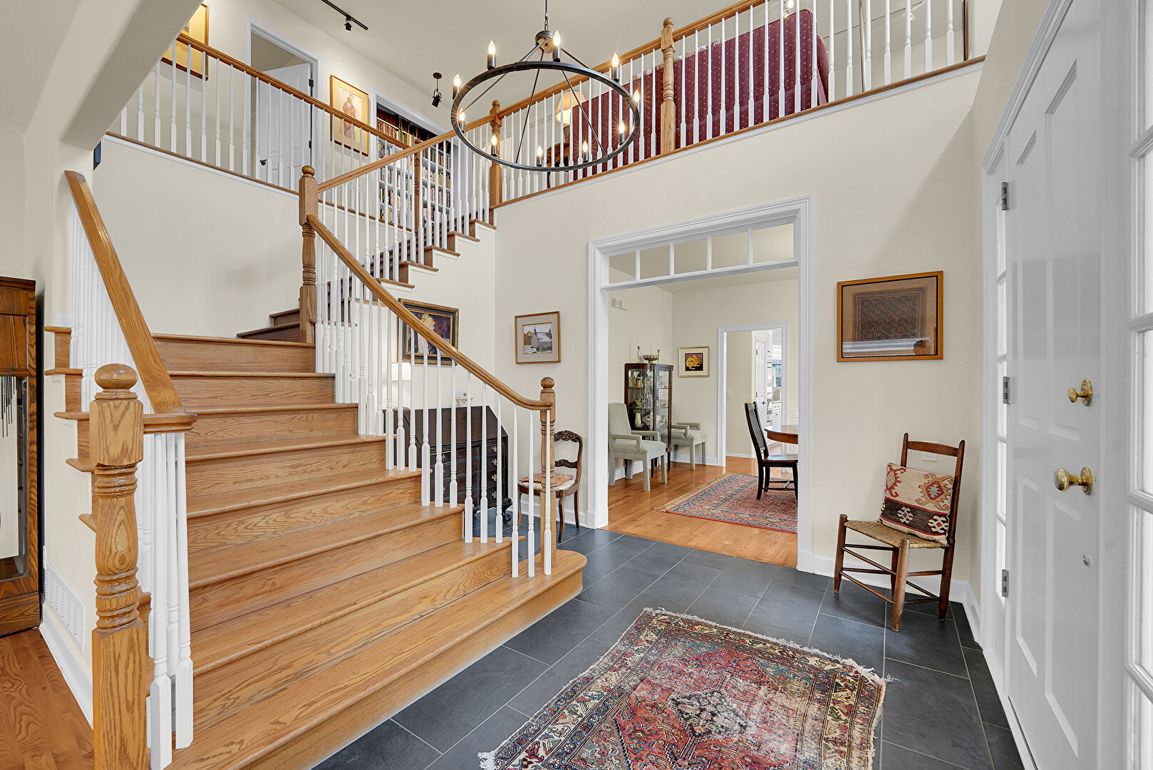 Baseboards Wall, Drywall, High Ceiling, Notable Chandelier, Tile Floor, Vent, Stairs