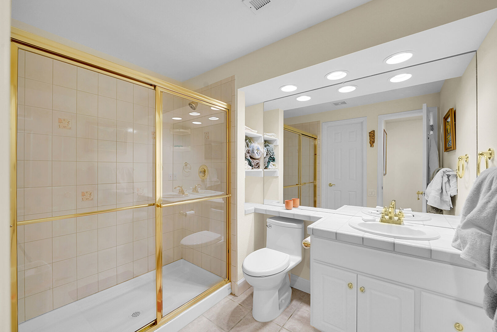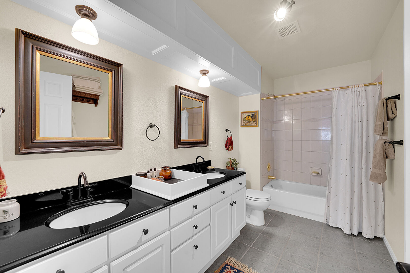 Combined Bath Shower, Double Vanity, Drywall, Full Bathroom, Recessed Lighting, Textured Wall, Vanity, Vent, Half Bathroom, Tile Floor