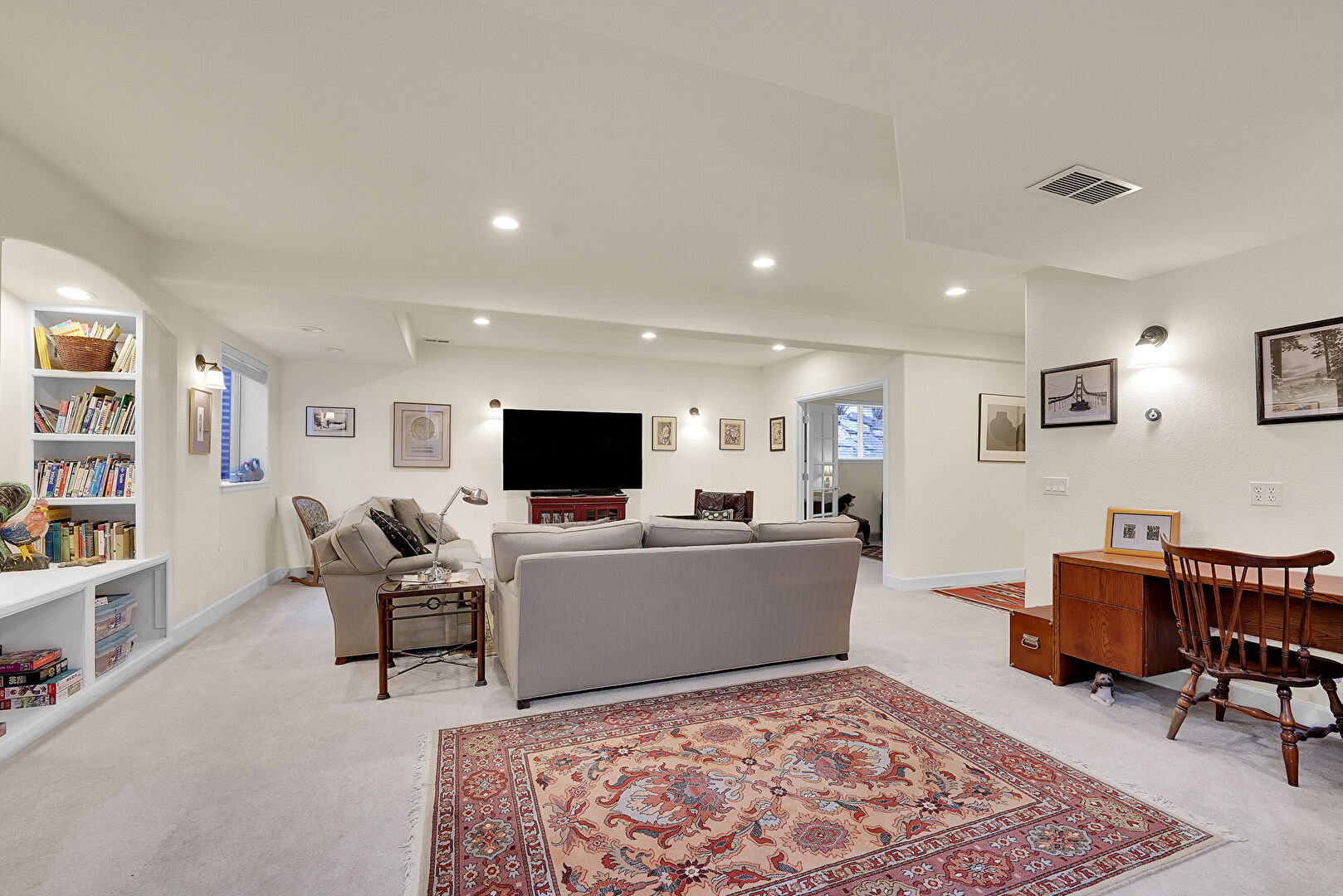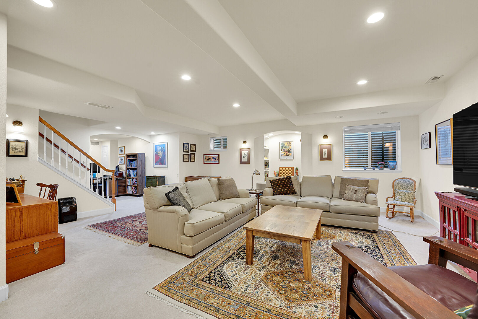 Arched Walkways, Baseboards Wall, Built In Shelves, Carpet, Cathedral Ceiling, Drywall, Fireplace, Natural Light, Notable Chandelier, Office Area, Recessed Lighting, Stairs, Track Lighting, Vaulted Ceiling, Vent, Wood Finish Floor, Baseboards Wall, Carpet, Natural Light, Track Lighting