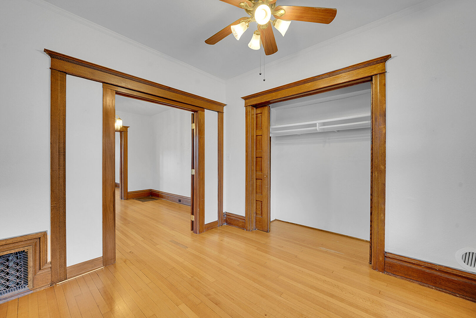 Baseboards Wall, Ceiling Fan, Closet, Crown Molding, Drywall, Natural Light, Vent, Wood Finish Floor, Ceiling Fan, Drywall