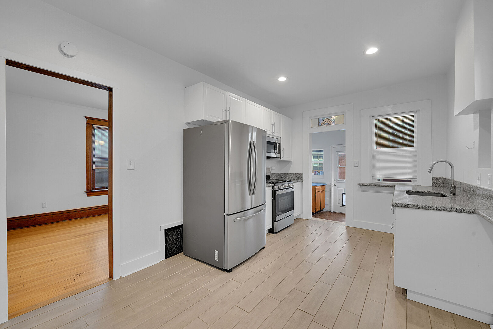 Baseboards Wall, Drywall, Natural Light, Raised Cabinets, Recessed Lighting, Smoke Carbon Monoxide Detector, Stone Countertops, U Shaped Kitchen, Wood Finish Floor, Baseboards Wall, Natural Light, Vent, Wood Finish Floor