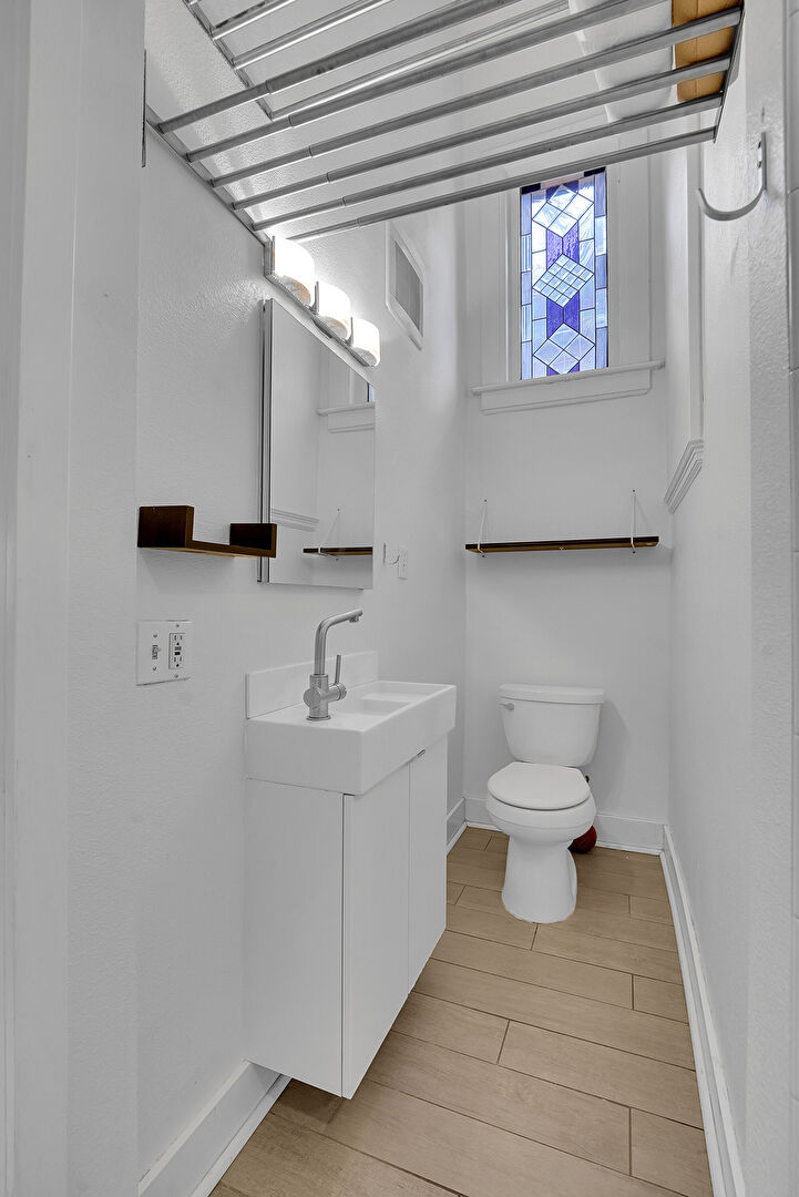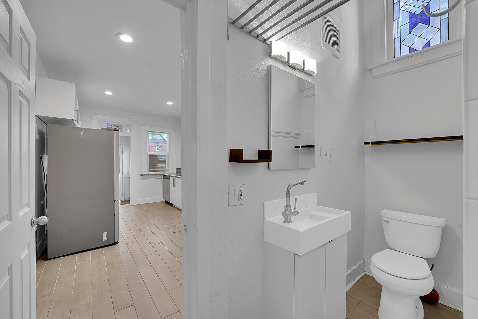 Baseboards Wall, Drywall, Half Bathroom, Natural Light, Recessed Lighting, Textured Wall, Vanity, Vent, Wood Finish Floor, Baseboards Wall, Drywall, Full Bathroom