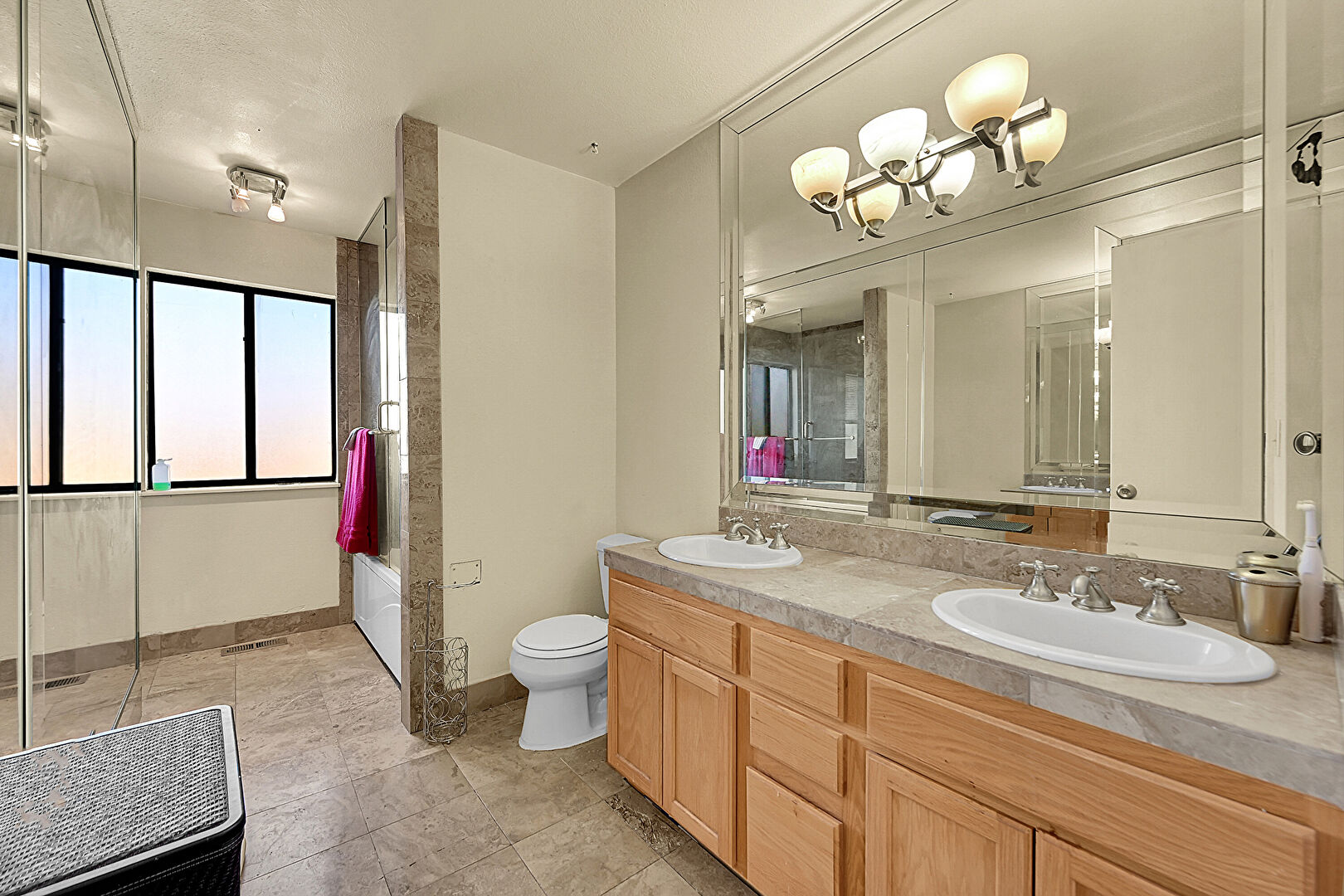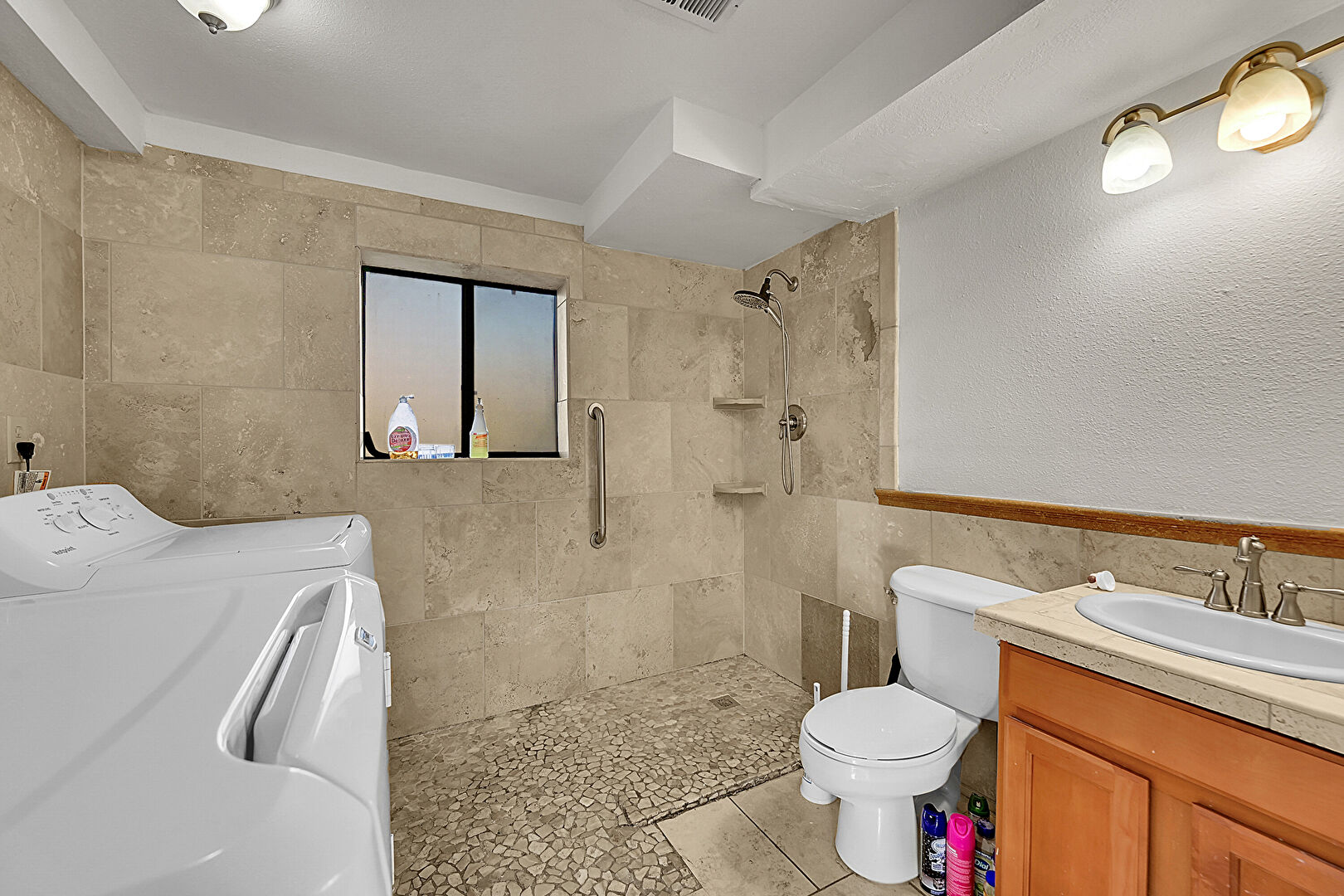 Baseboards Wall, Double Vanity, Full Bathroom, Laundry, Natural Light, Notable Chandelier, Textured Wall, Tile Floor, Tile Wall, Vanity, Vent, Wainscot Wall, Drywall, Vent
