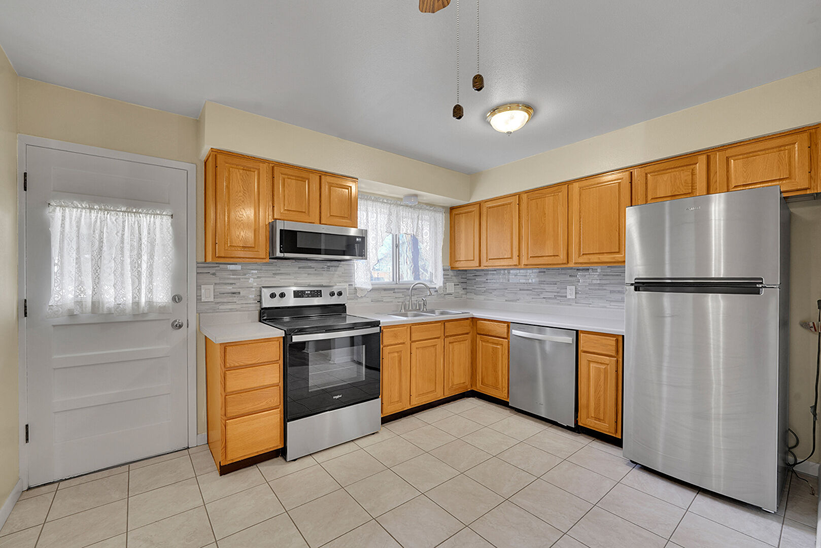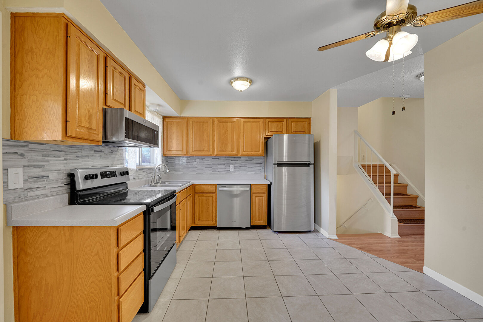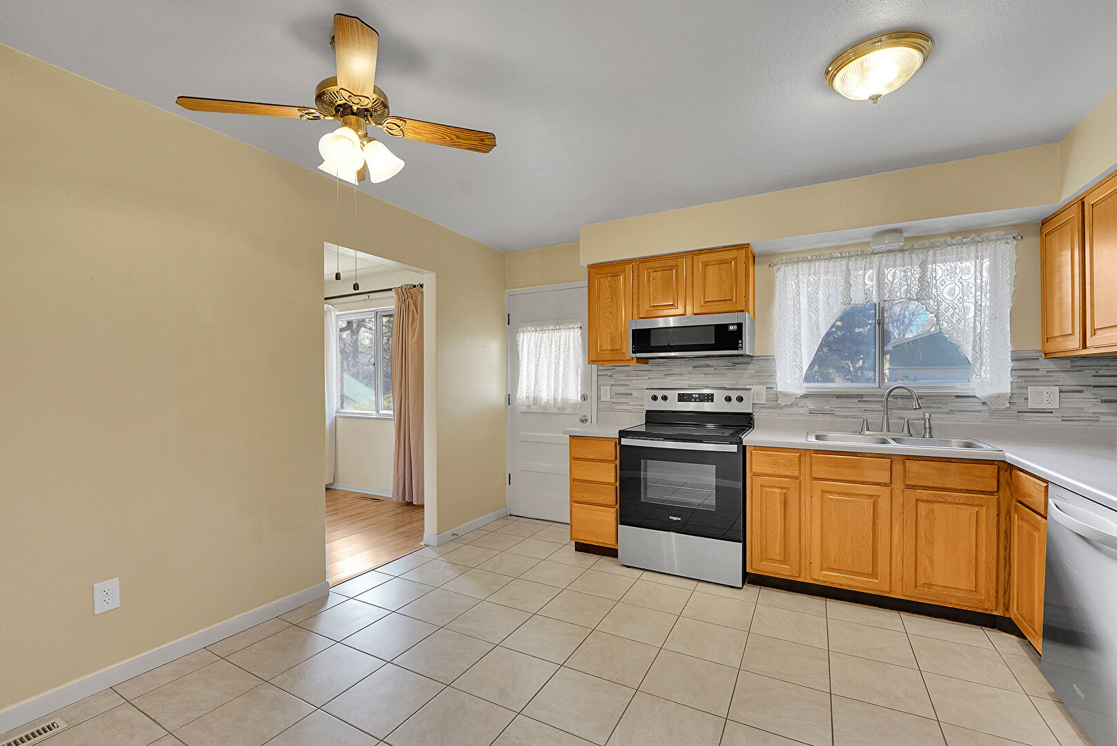 Baseboards Wall, Ceiling Fan, Drywall, L Shaped Kitchen, Medium Brown Cabinets, Natural Light, Raised Cabinets, Tile Floor, Medium Brown Cabinets, Natural Light, Vent
