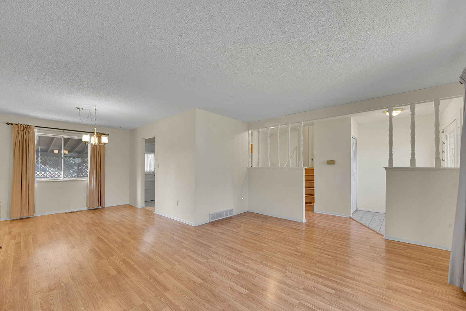 Baseboards Wall, Drywall, Natural Light, Notable Chandelier, Scuttle, Textured Ceiling, Vent, Wood Finish Floor, Natural Light, Textured Ceiling, Wood Finish Floor