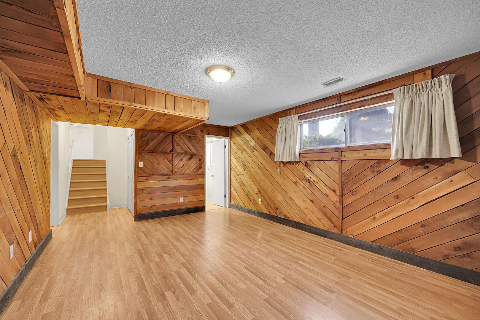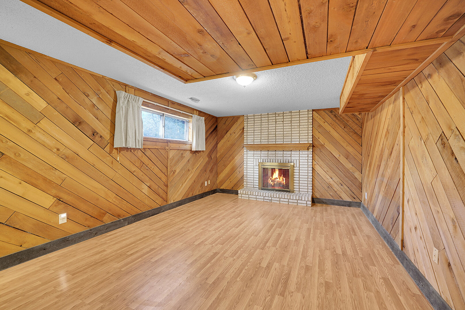 Baseboards Wall, Drywall, Fireplace, Natural Light, Notable Chandelier, Textured Ceiling, Vent, Wood Ceiling, Wood Finish Floor, Wood Wall, Basement, Natural Light