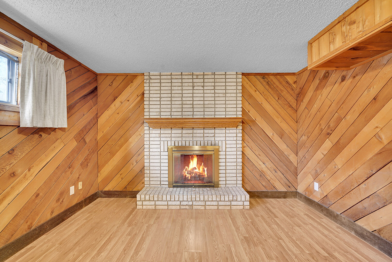 Fireplace, Textured Ceiling, Wood Wall, Pad Mount Transformer, Wood Finish Floor