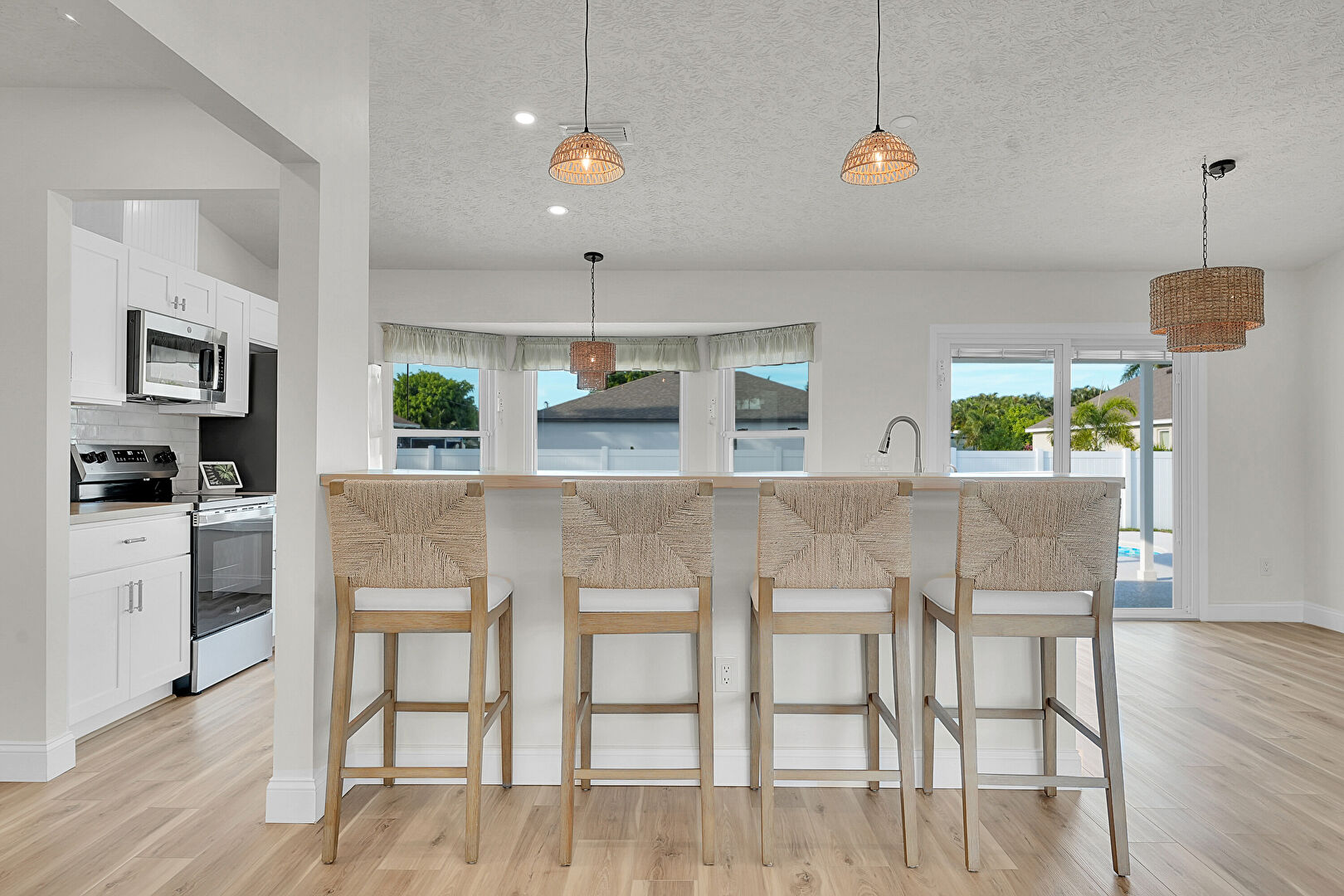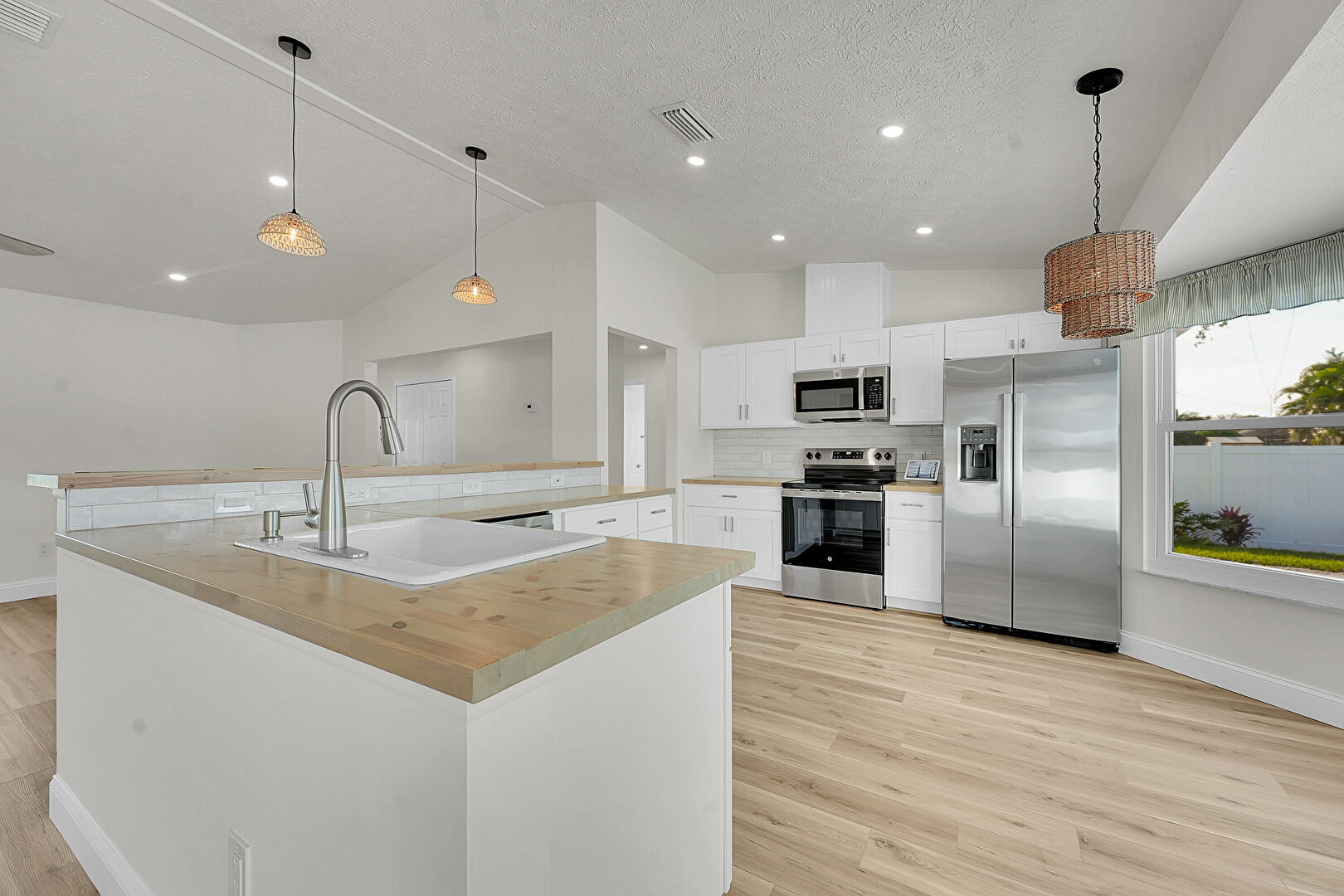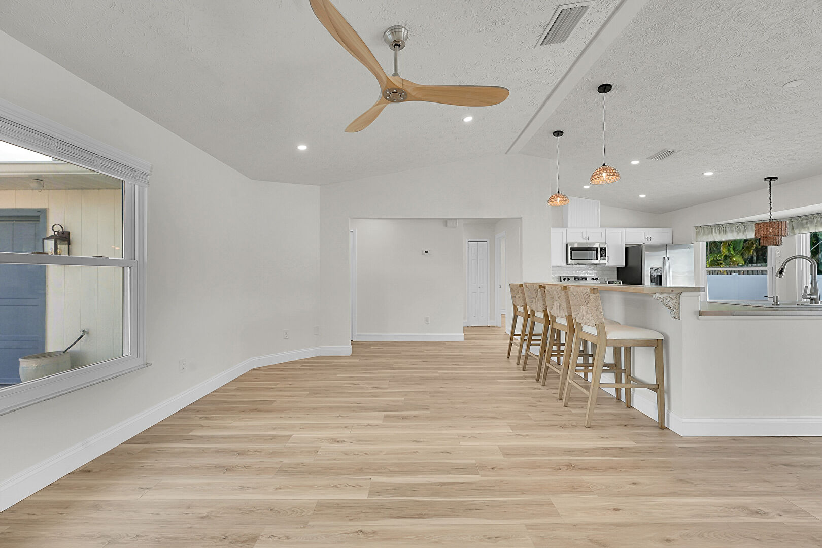 Baseboards Wall, Butcher Block Countertops, Ceiling Fan, Drywall, High Ceiling, Kitchen Bar, Kitchen Island, Natural Light, One Wall Kitchen, Pendant Lighting, Recessed Lighting, Shaker Cabinets, Stone Countertops, Textured Ceiling, Vaulted Ceiling, Vent, Wood Finish Floor, Baseboards Wall, Drywall, Kitchen Island, Vaulted Ceiling