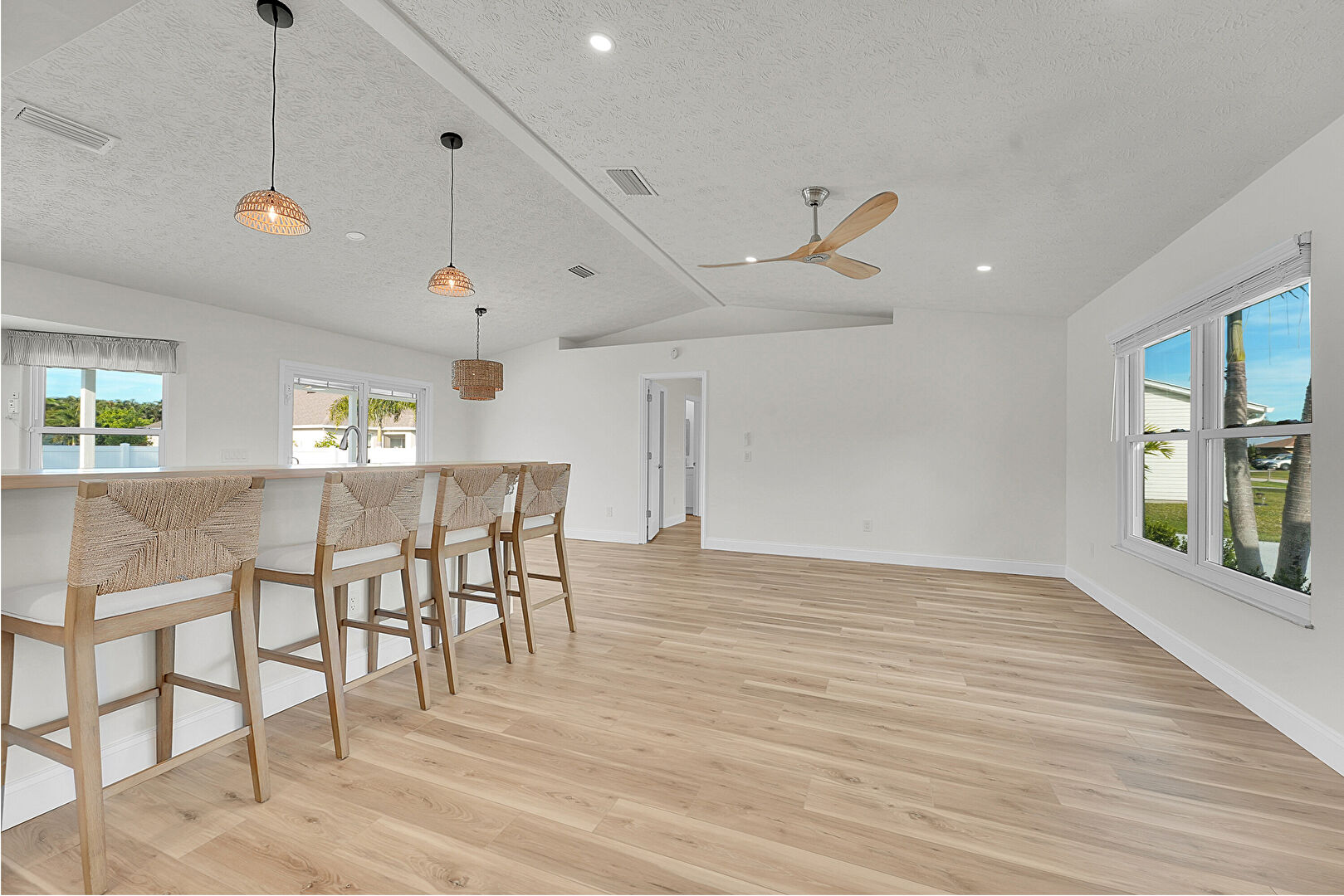 Baseboards Wall, Cathedral Ceiling, Ceiling Fan, Drywall, Kitchen Bar, Kitchen Peninsula, Natural Light, Opens To Living Area, Pendant Lighting, Recessed Lighting, Stone Countertops, Textured Ceiling, Vaulted Ceiling, Vent, Wood Finish Floor, Natural Light, Shaker Cabinets, Textured Ceiling