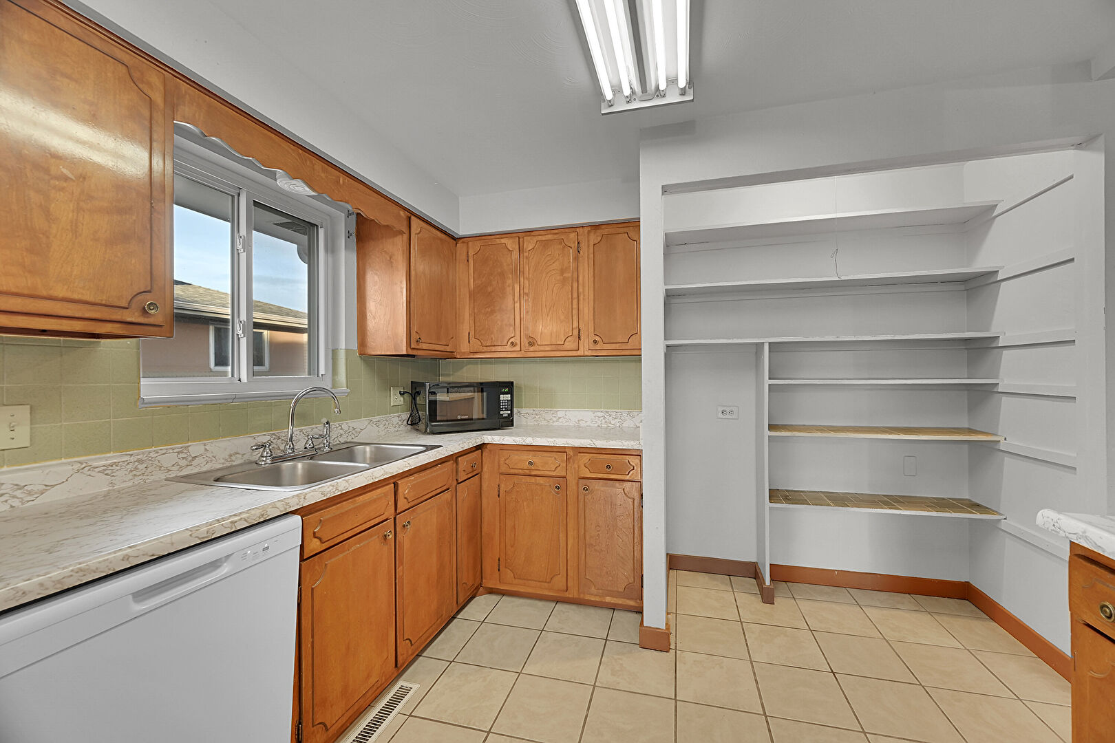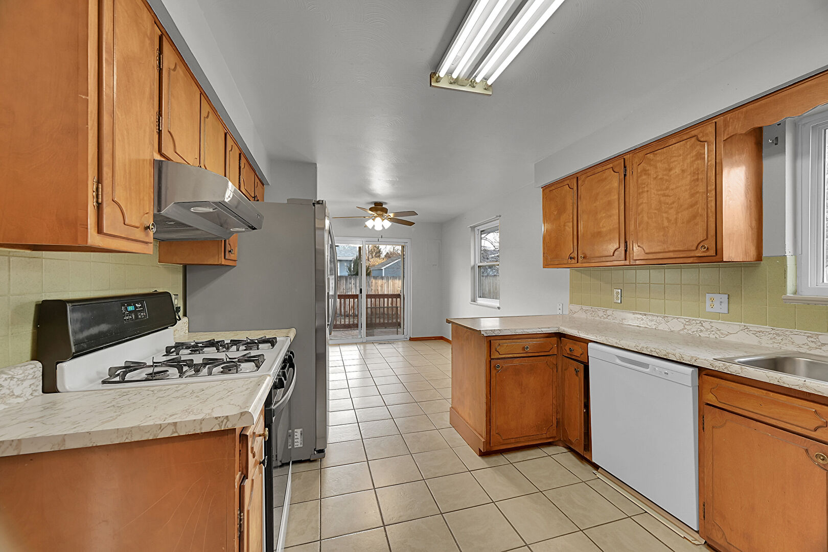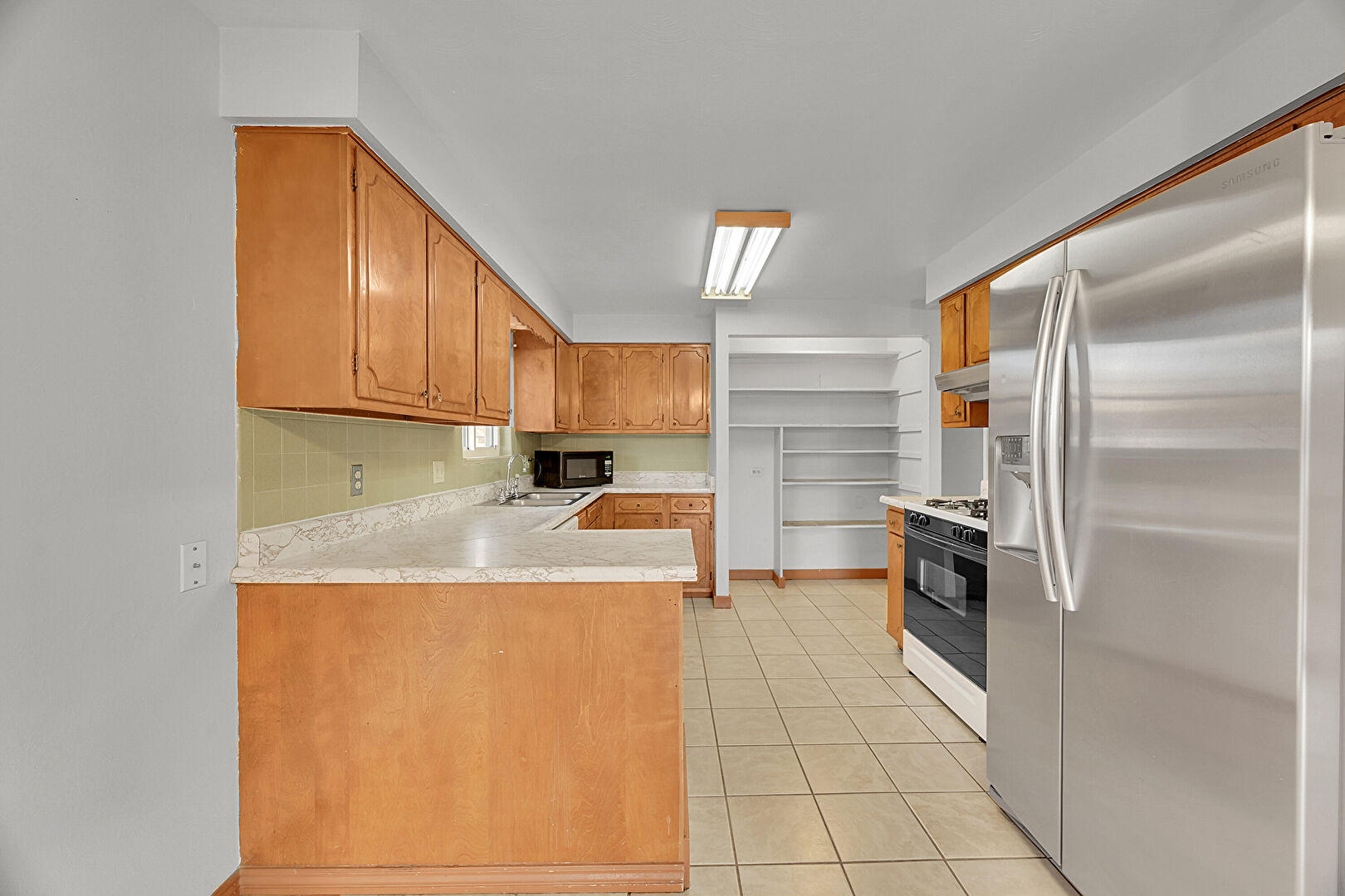 Arched Cabinets, Baseboards Wall, Drywall, G Shaped Kitchen, Kitchen Peninsula, Medium Brown Cabinets, Natural Light, Raised Cabinets, Tile Floor, Vent, Visible Hinge Cabinets, Ceiling Fan, Drywall, Stone Countertops