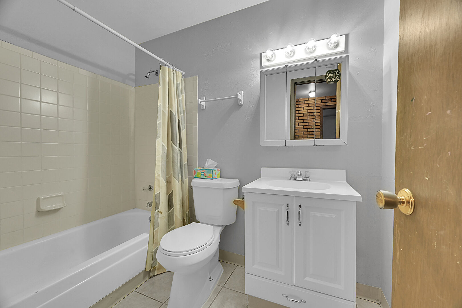 Baseboards Wall, Drywall, Full Bathroom, Tile Floor, Vanity, Combined Bath Shower
