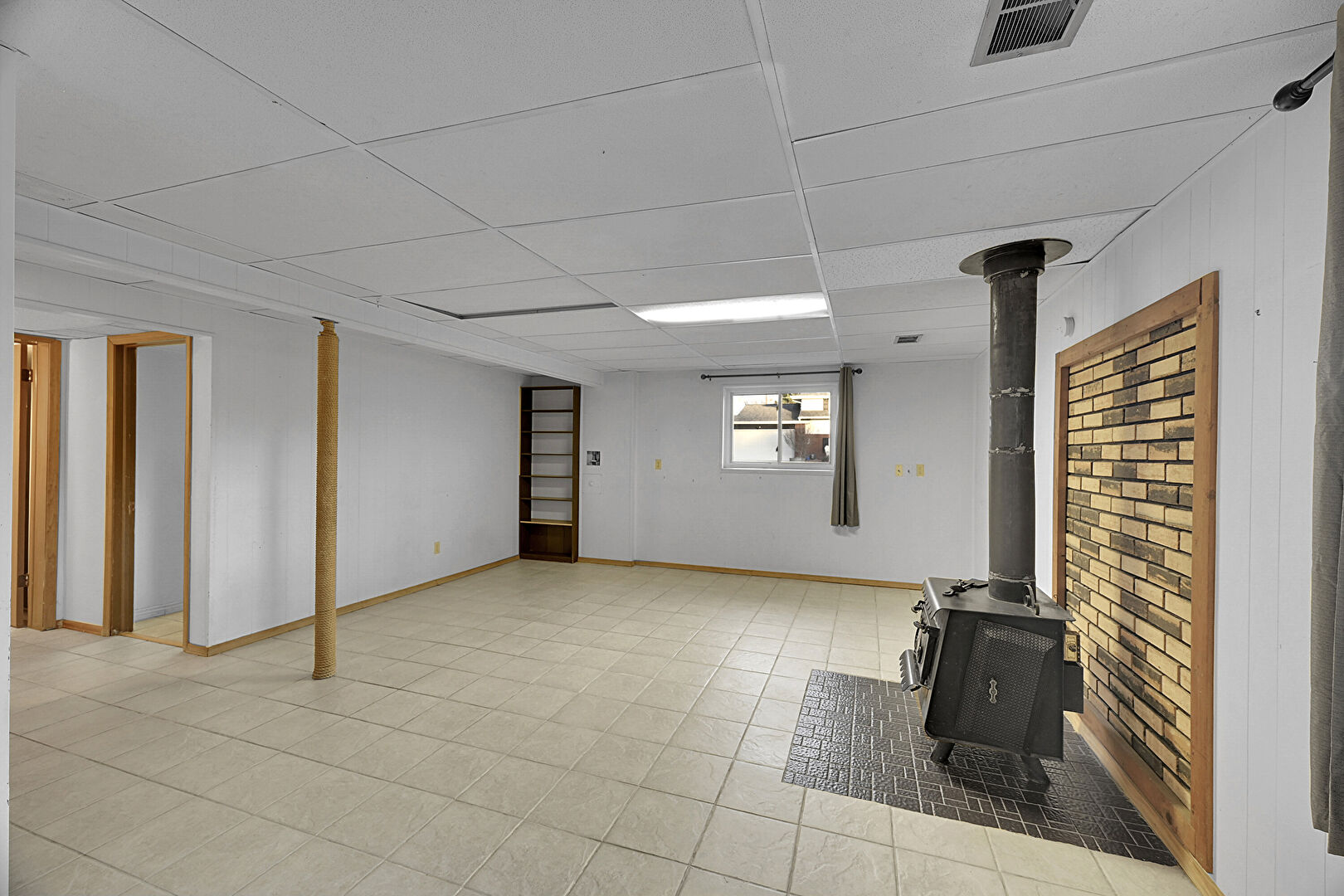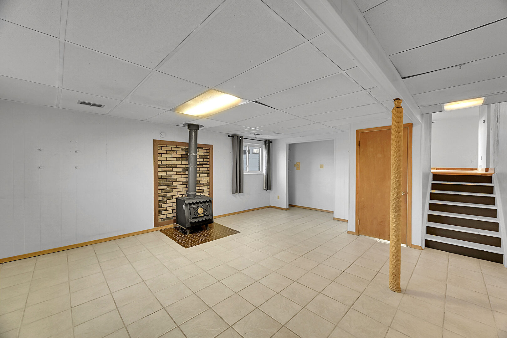 Baseboards Wall, Basement, Drop Ceiling, Drywall, Natural Light, Stairs, Tile Floor, Vent, Vinyl Floor, Wood Stove, Basement, Wood Stove
