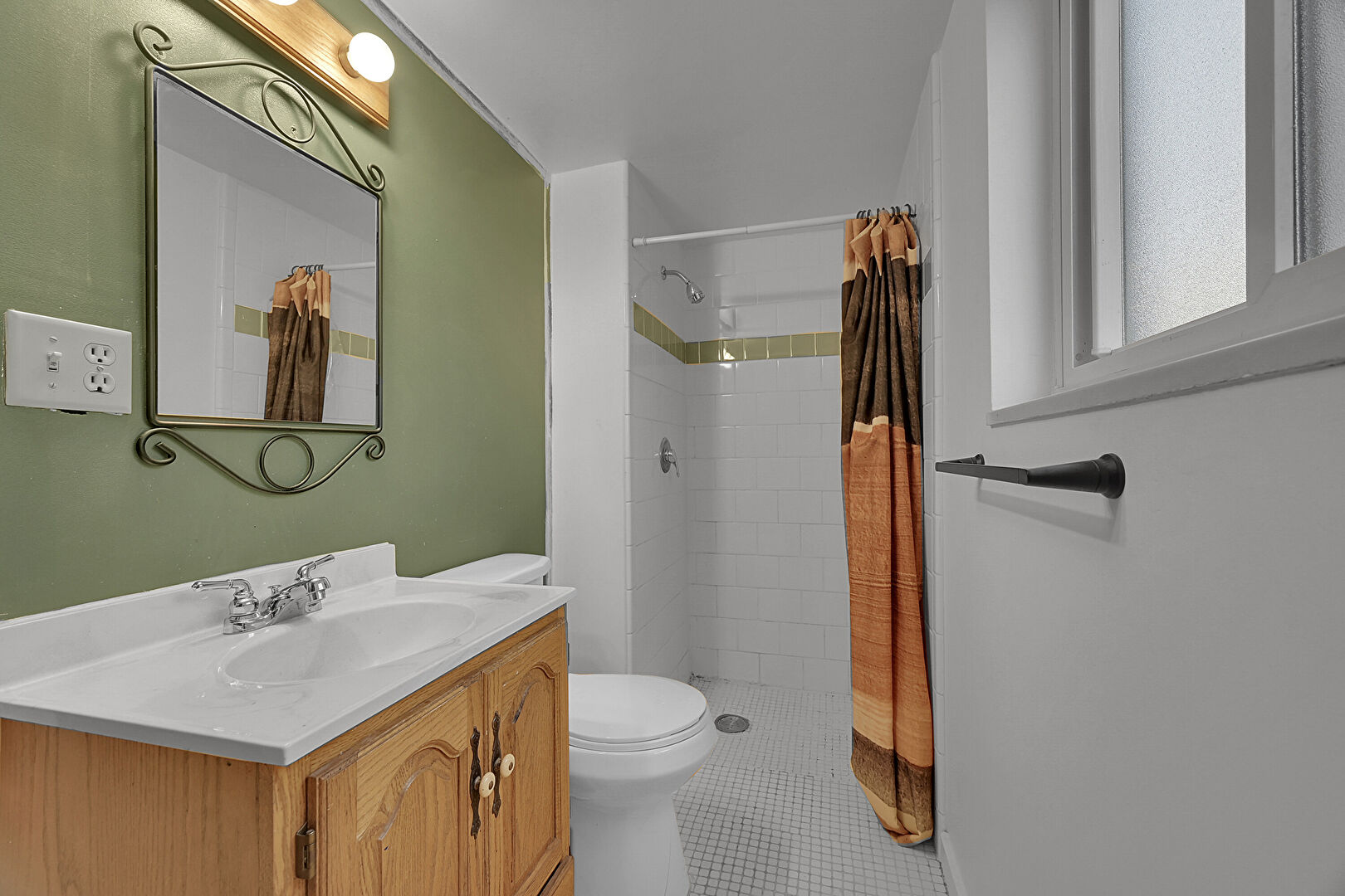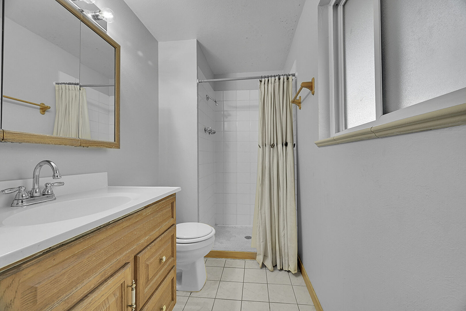 Baseboards Wall, Drywall, Natural Light, Textured Ceiling, Tile Floor, Vanity, Full Bathroom