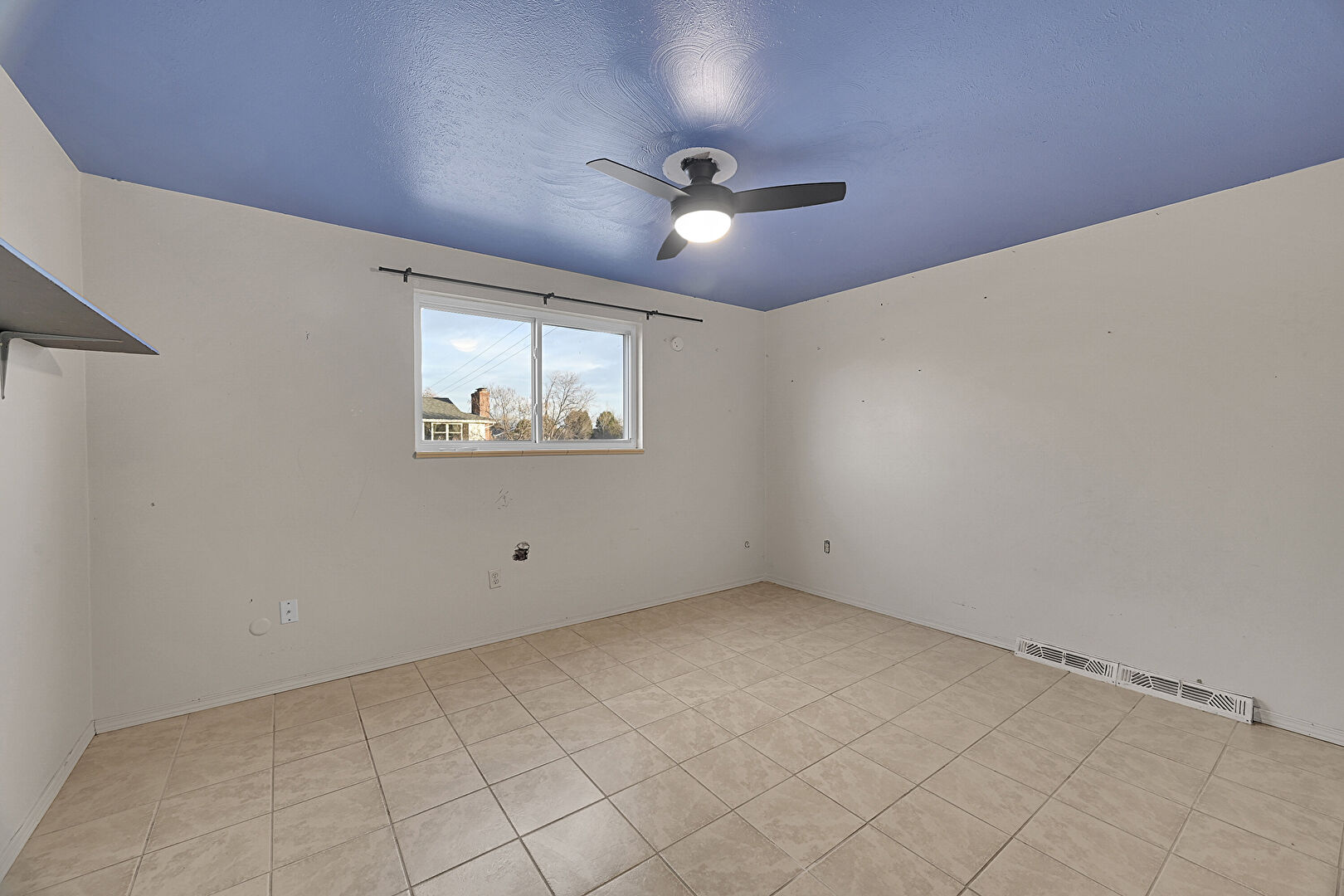Baseboards Wall, Ceiling Fan, Drywall, Natural Light, Textured Ceiling, Vent, Tile Floor