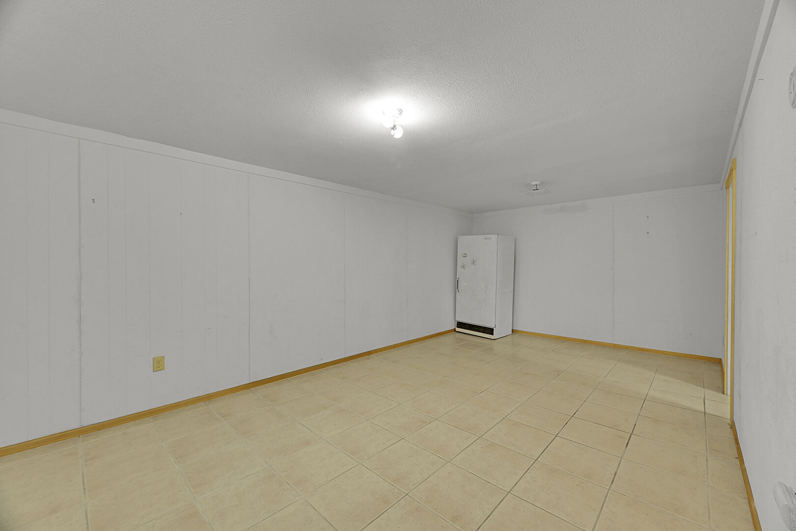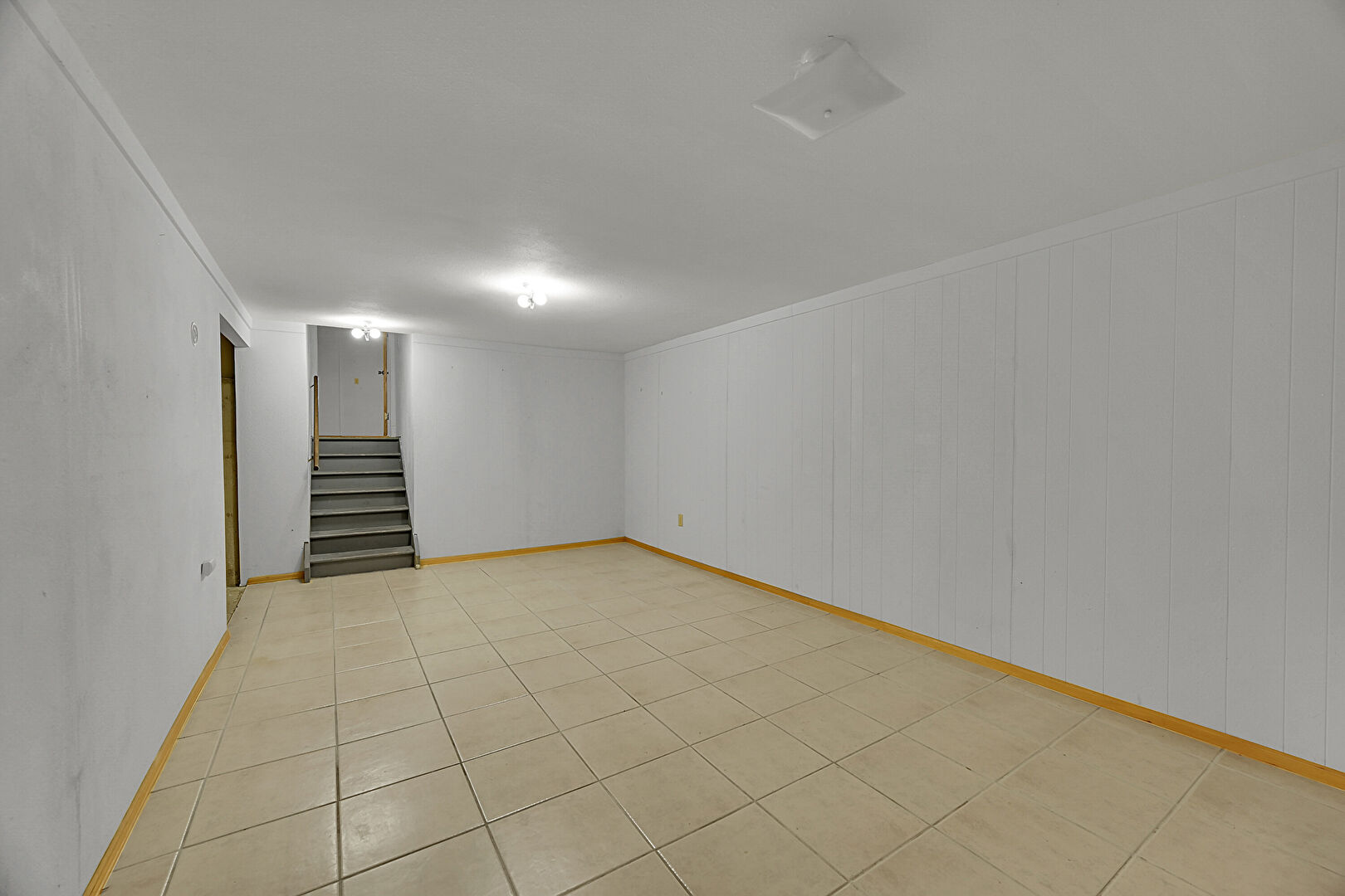 Baseboards Wall, Basement, Crown Molding, Paneling Wall, Textured Ceiling, Tile Floor, Vinyl Floor, Wood Wall, Basement, Stairs