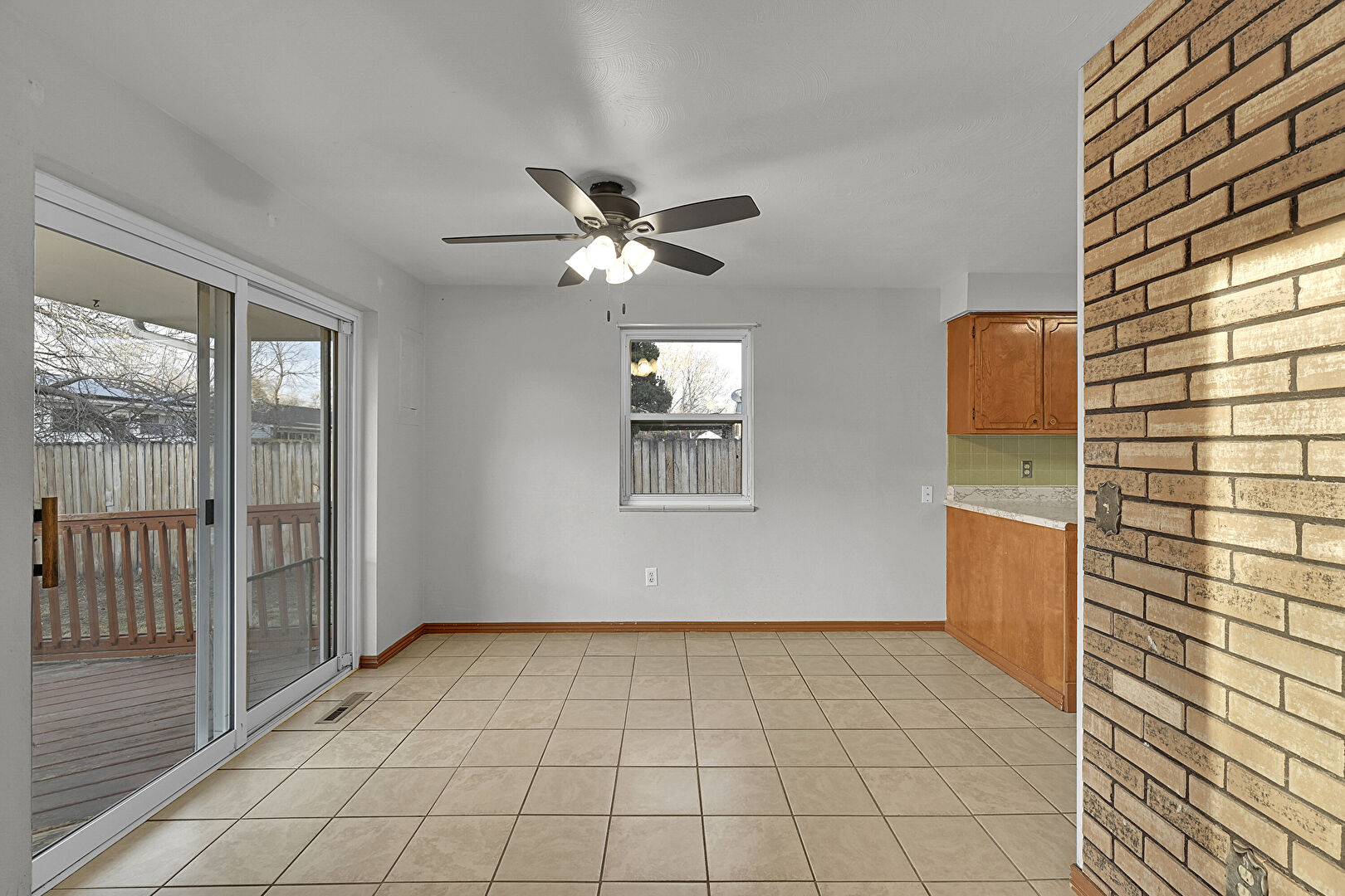 Baseboards Wall, Ceiling Fan, Drywall, Natural Light, Tile Floor, Vent, Brick Wall