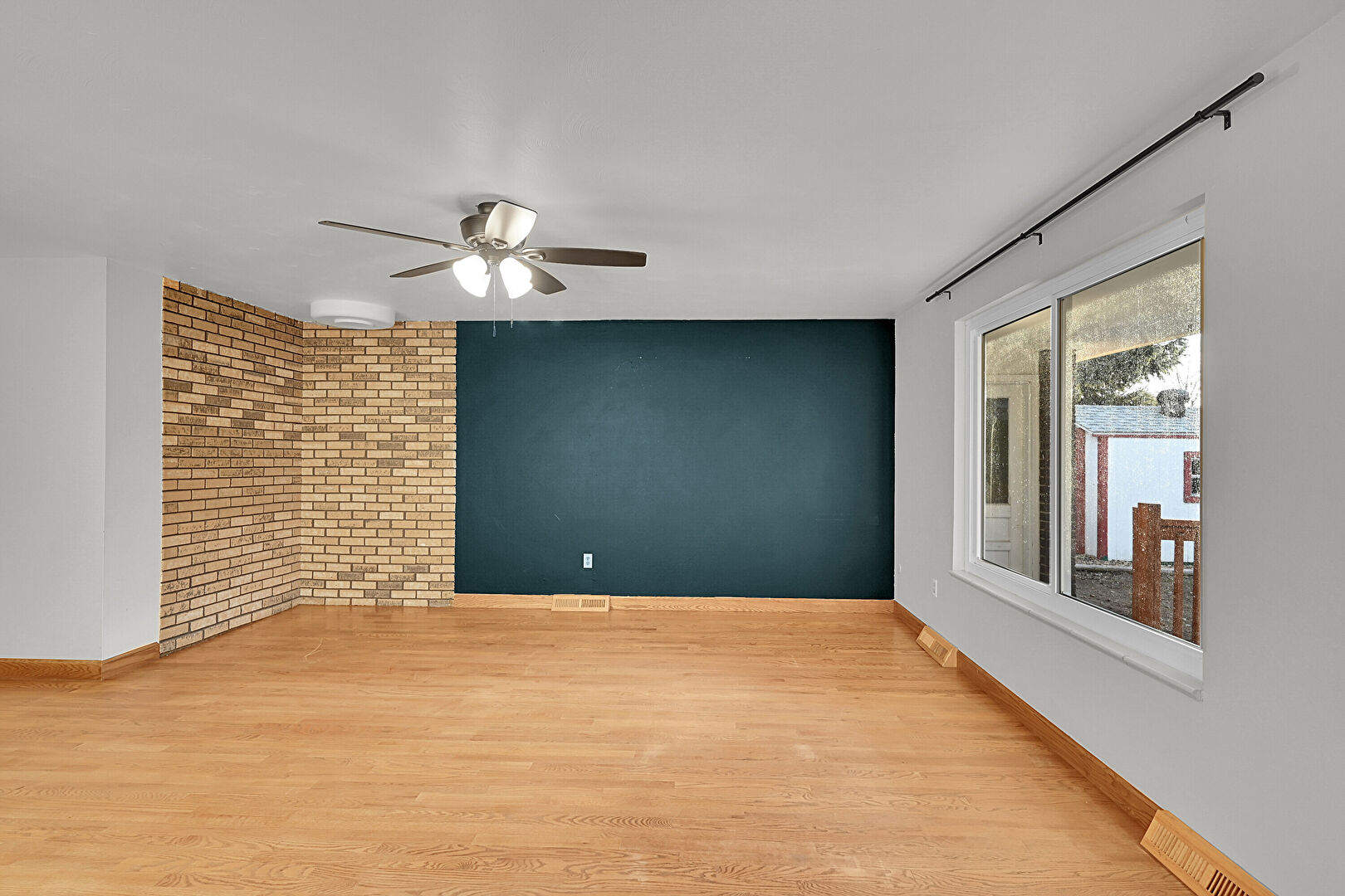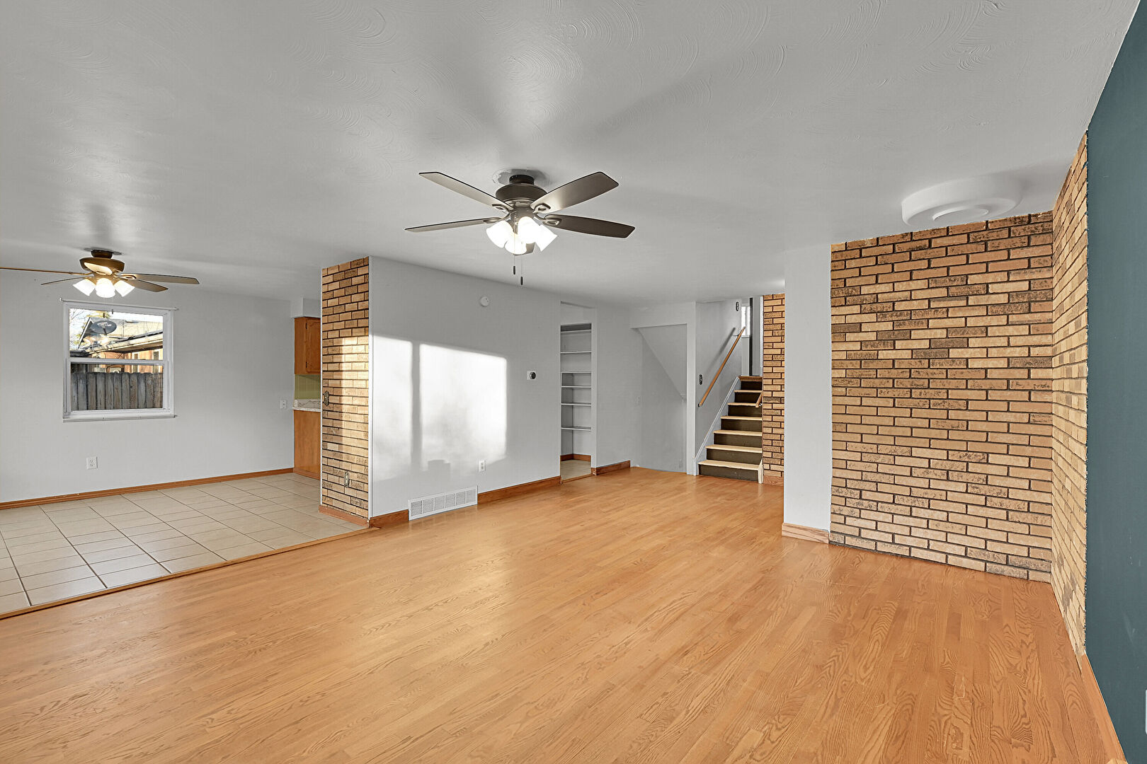 Accent Wall, Baseboards Wall, Brick Wall, Ceiling Fan, Drywall, Natural Light, Stairs, Vent, Wood Finish Floor, Drywall, Natural Light, Tile Floor