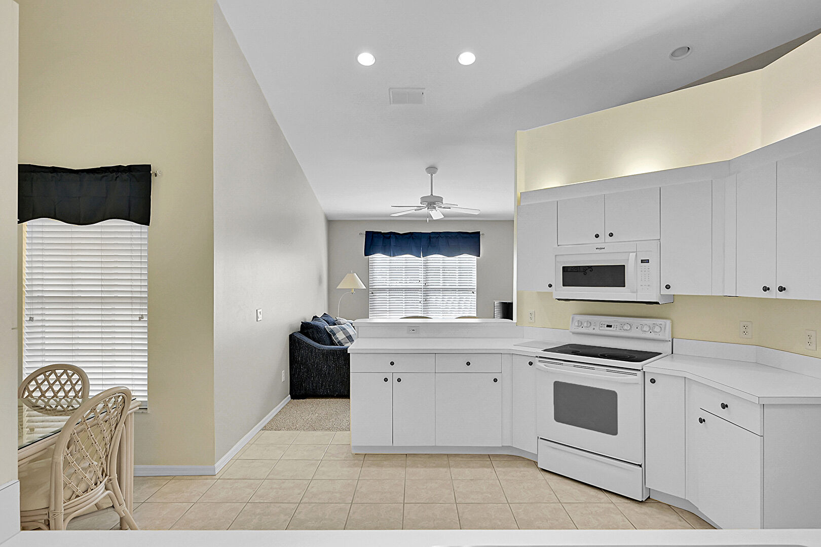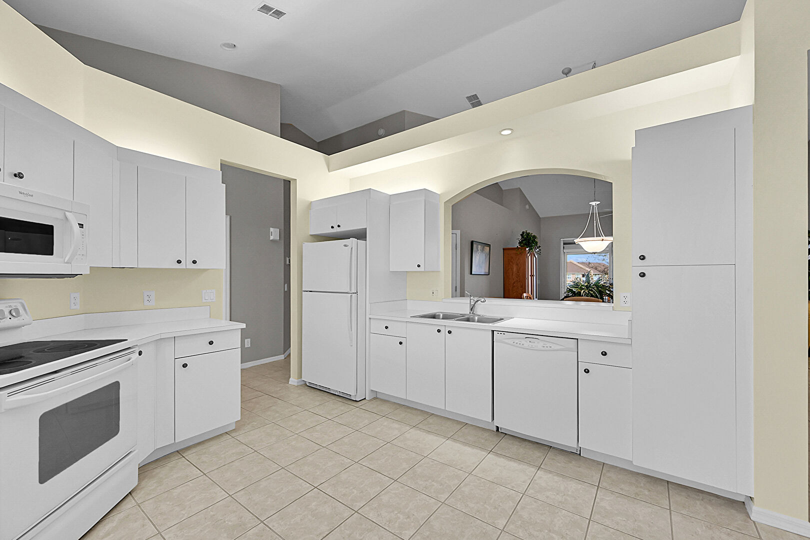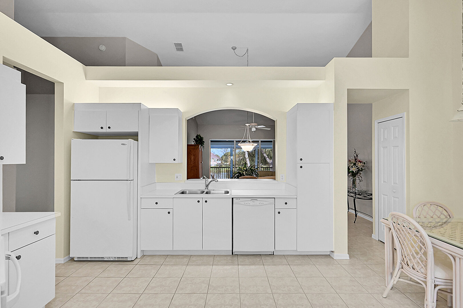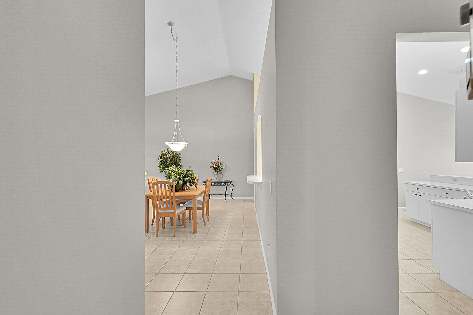 Arched Walkways, Baseboards Wall, Carpet, Ceiling Fan, Drywall, High Ceiling, Kitchen Bar, Kitchen Peninsula, Natural Light, Opens To Living Area, Pass Through Window, Pendant Lighting, Recessed Lighting, Tile Floor, Vaulted Ceiling, Vent, Ceiling Fan, Drywall, Natural Light, Tile Floor, Vaulted Ceiling