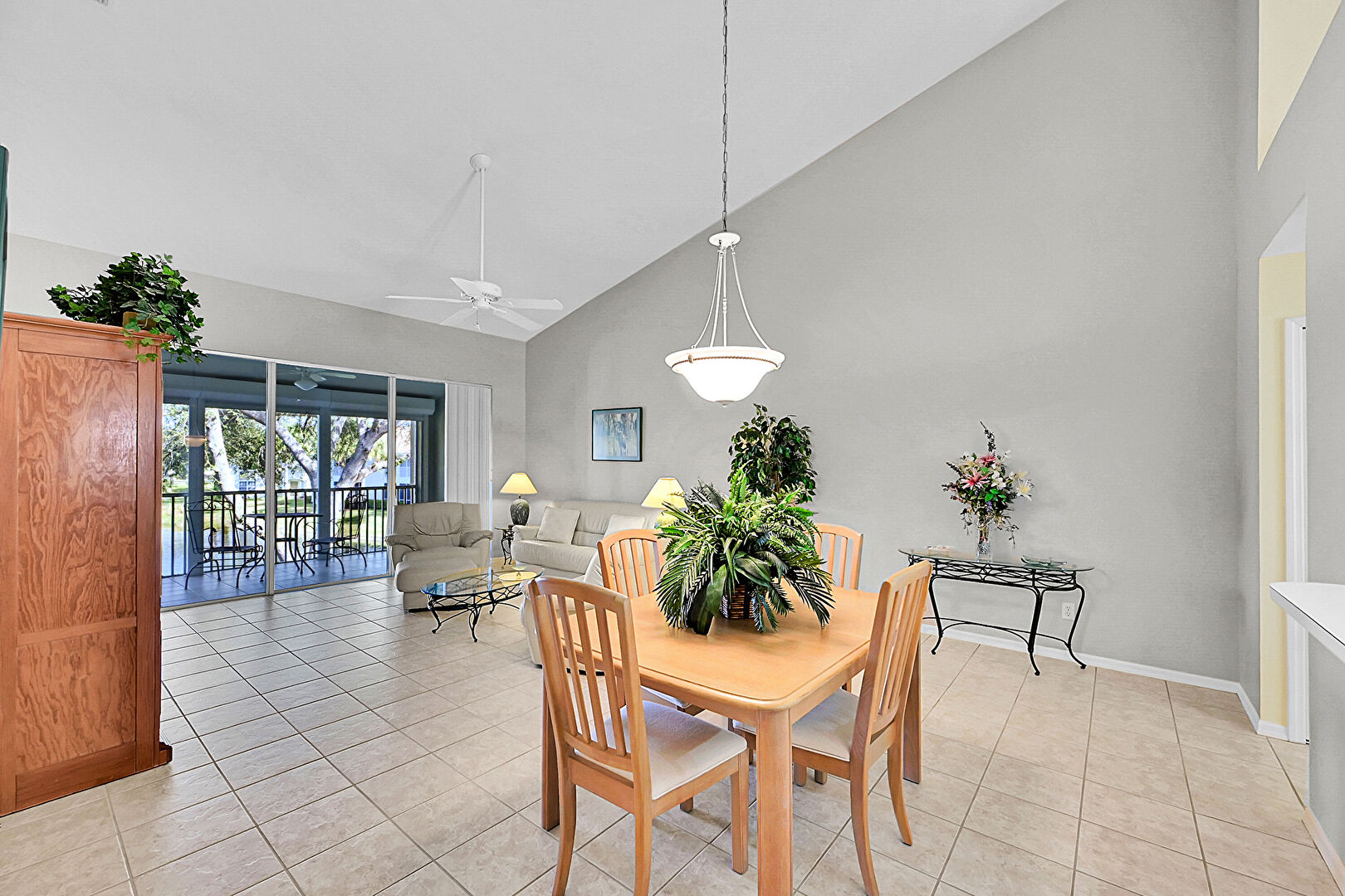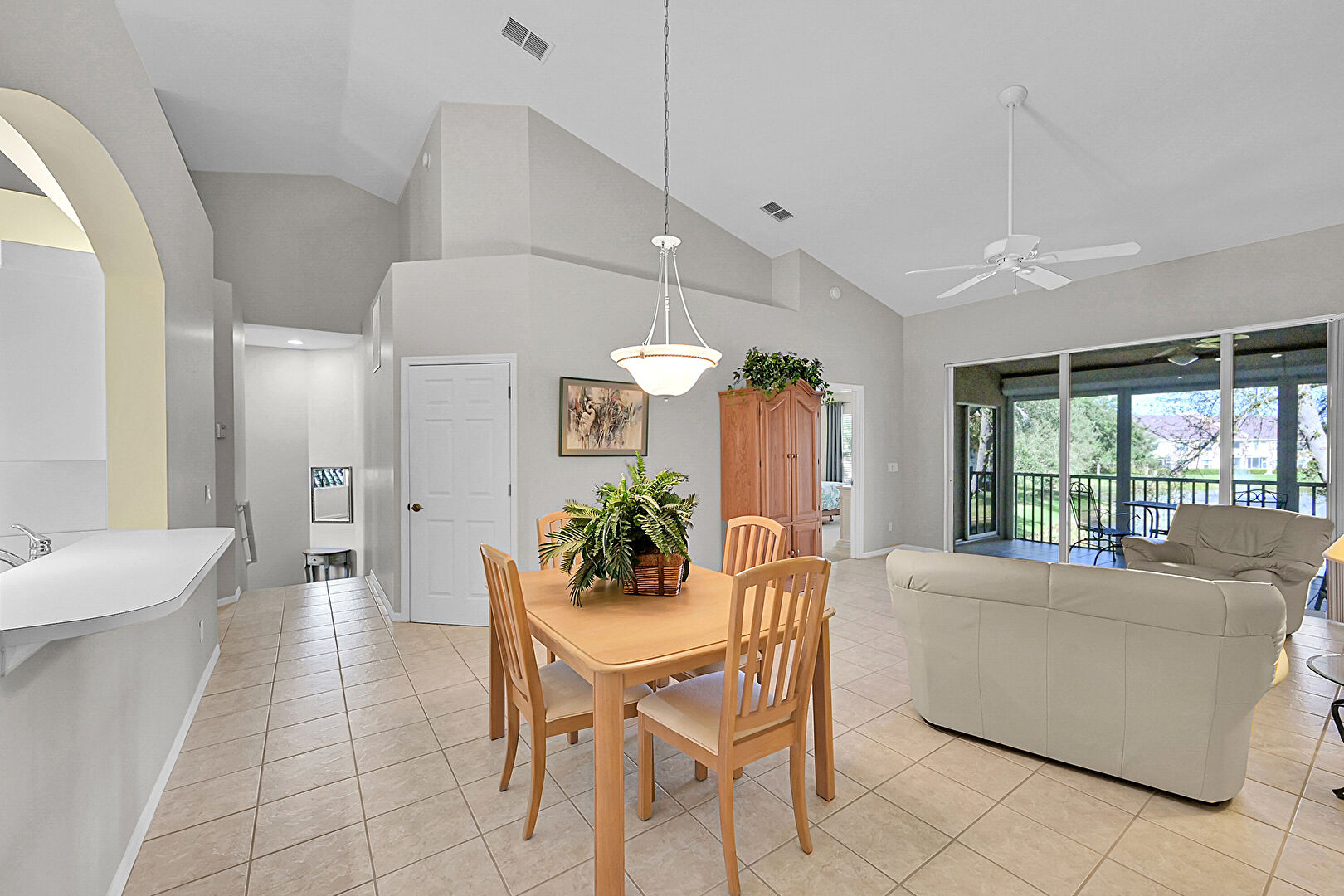 Baseboards Wall, Ceiling Fan, Drywall, High Ceiling, Natural Light, Smoke Carbon Monoxide Detector, Sunroom, Tile Floor, Vaulted Ceiling, Vent, Water View, Waterfront, Baseboards Wall, Drywall, Sunroom, Vaulted Ceiling, Vent