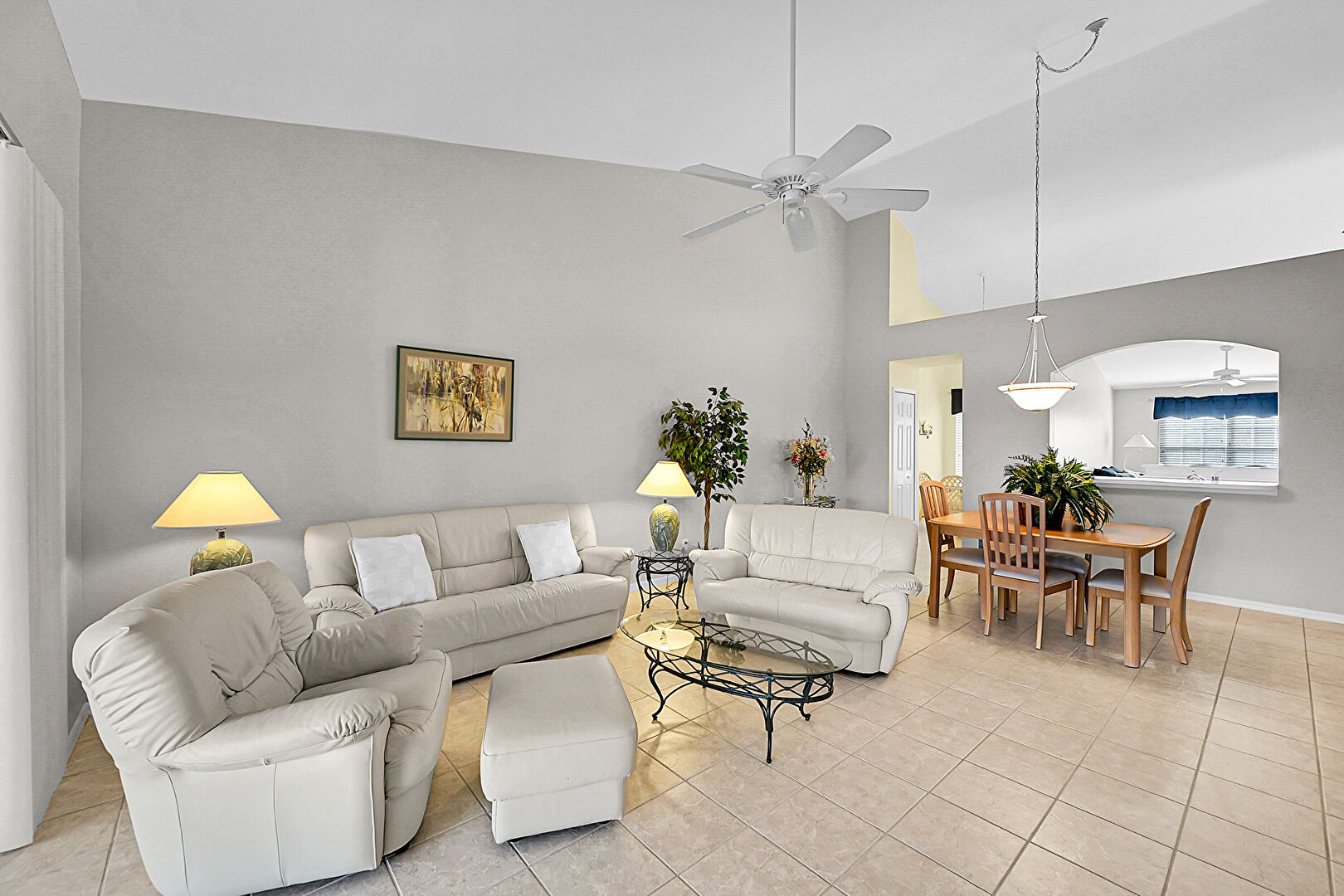 Baseboards Wall, Ceiling Fan, Drywall, High Ceiling, Natural Light, Tile Floor, Vaulted Ceiling, Vent, High Ceiling, Natural Light
