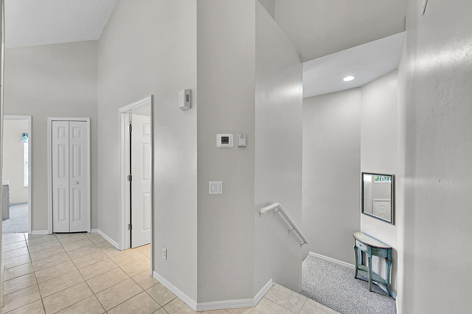 Baseboards Wall, Drywall, High Ceiling, Tile Floor, Baseboards Wall, Stairs