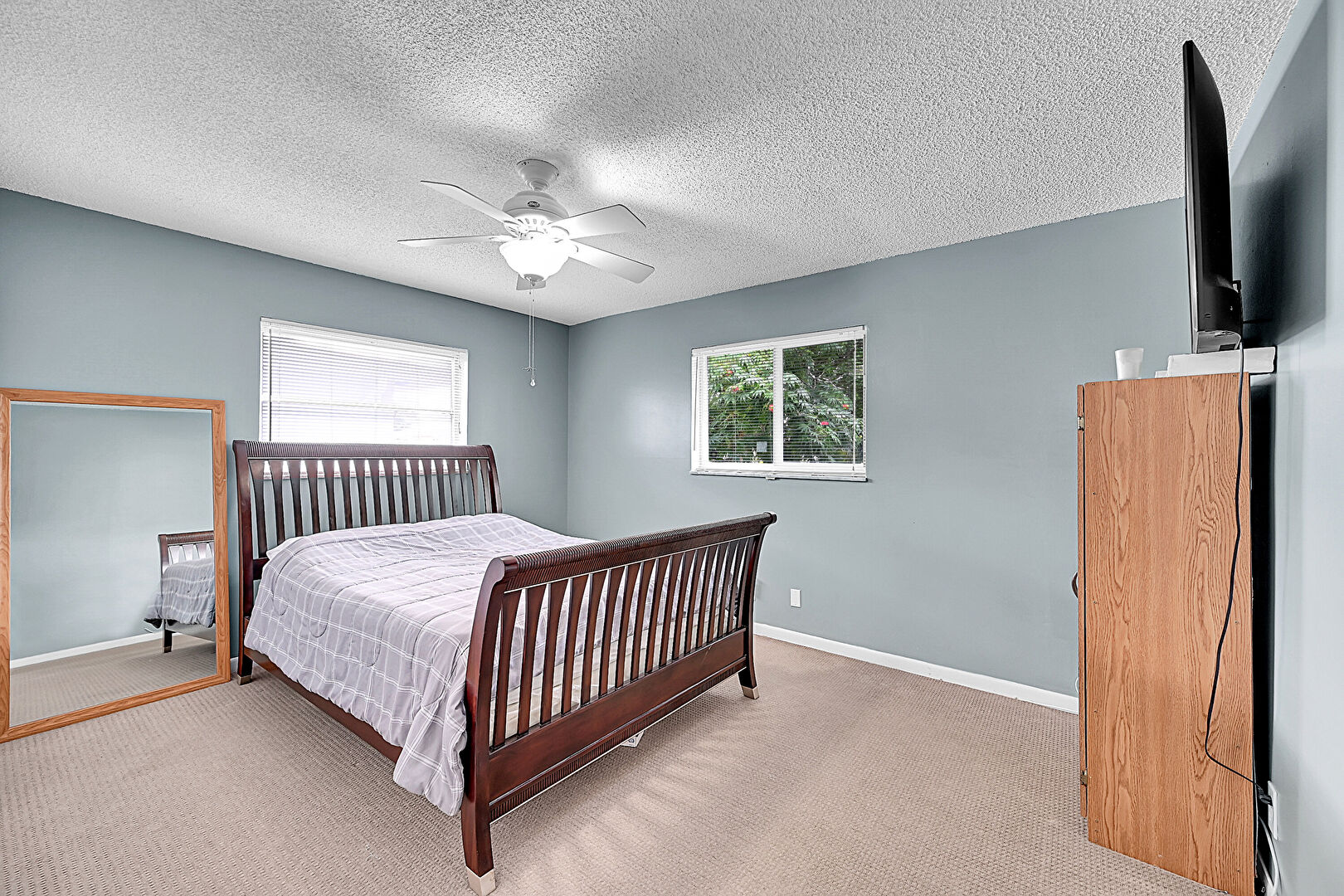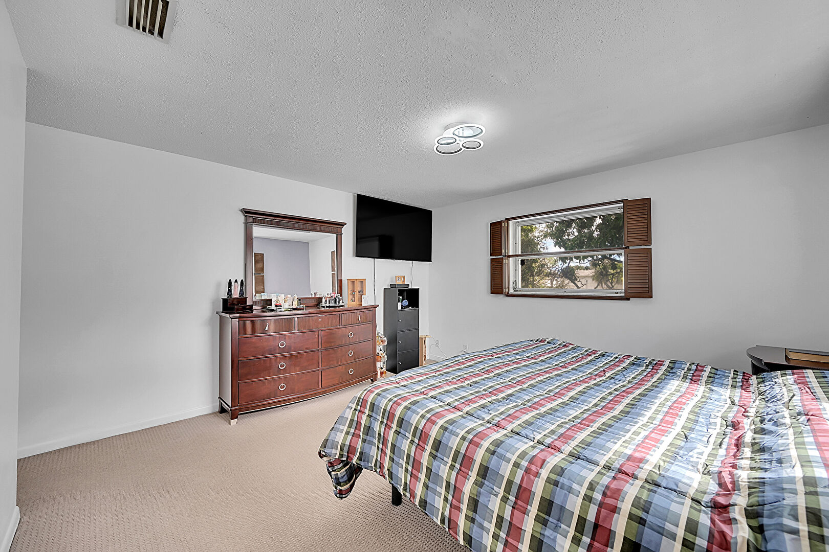 Carpet, Ceiling Fan, Drywall, Natural Light, Textured Ceiling, Vent, Baseboards Wall, Two Closets