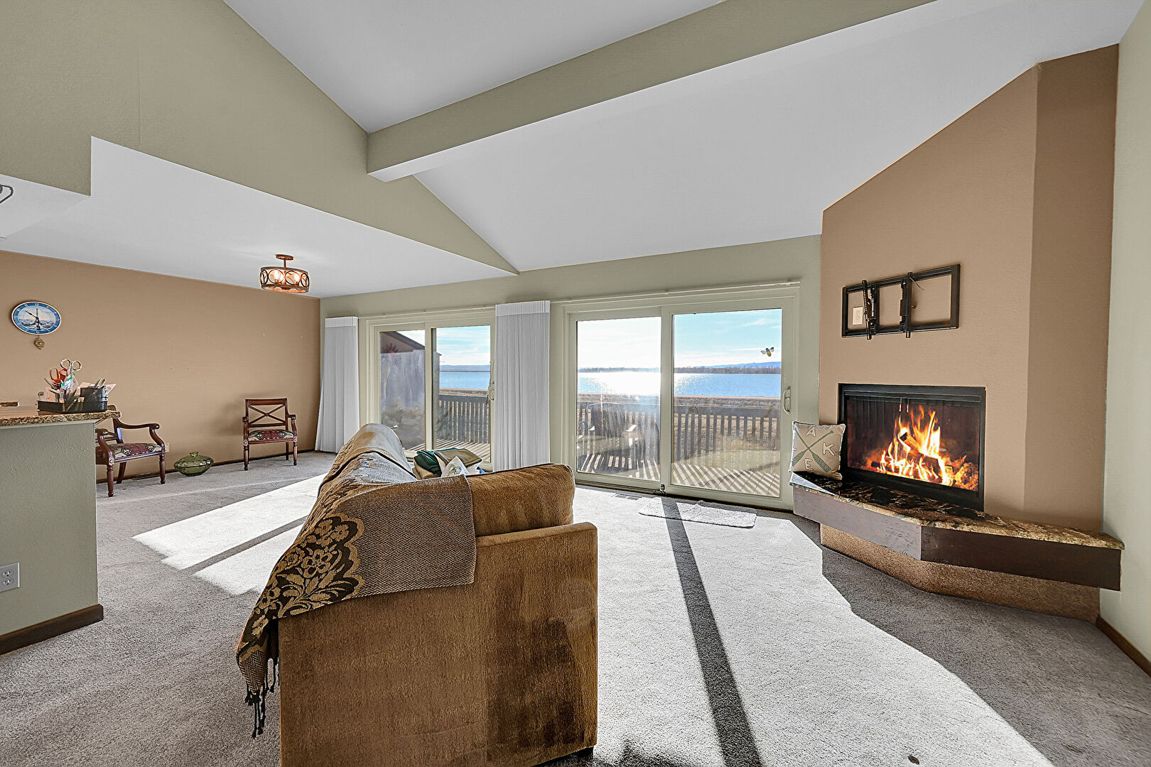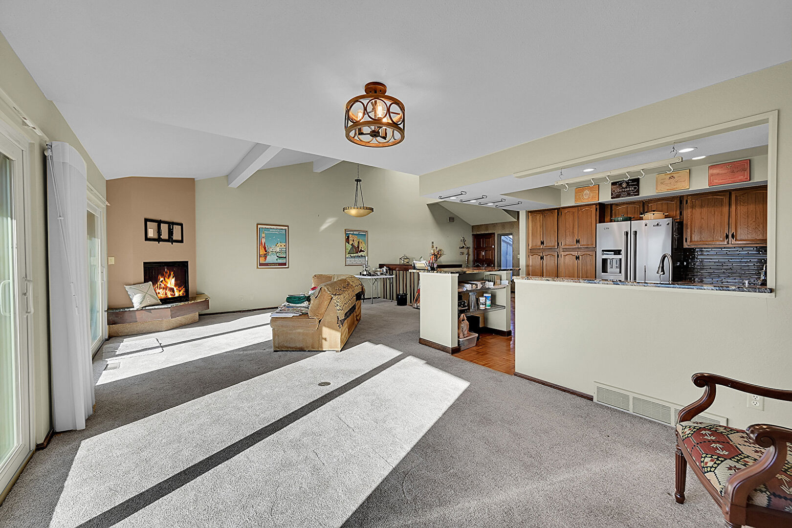 Baseboards Wall, Beamed Ceiling, Carpet, Drywall, Fireplace, High Ceiling, Natural Light, Track Lighting, Vaulted Ceiling, Vent, High Ceiling, Natural Light, Textured Ceiling, Track Lighting, Vaulted Ceiling
