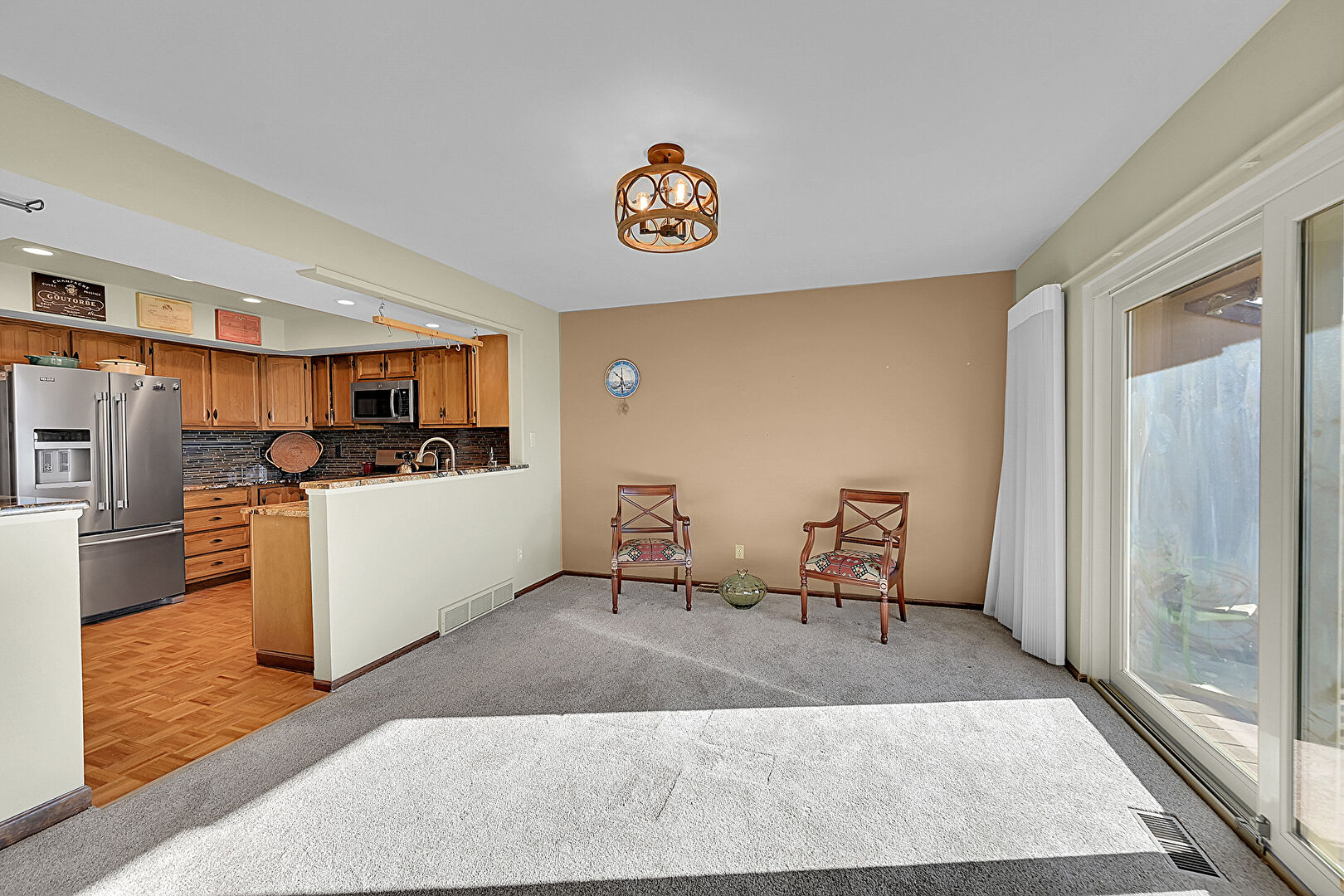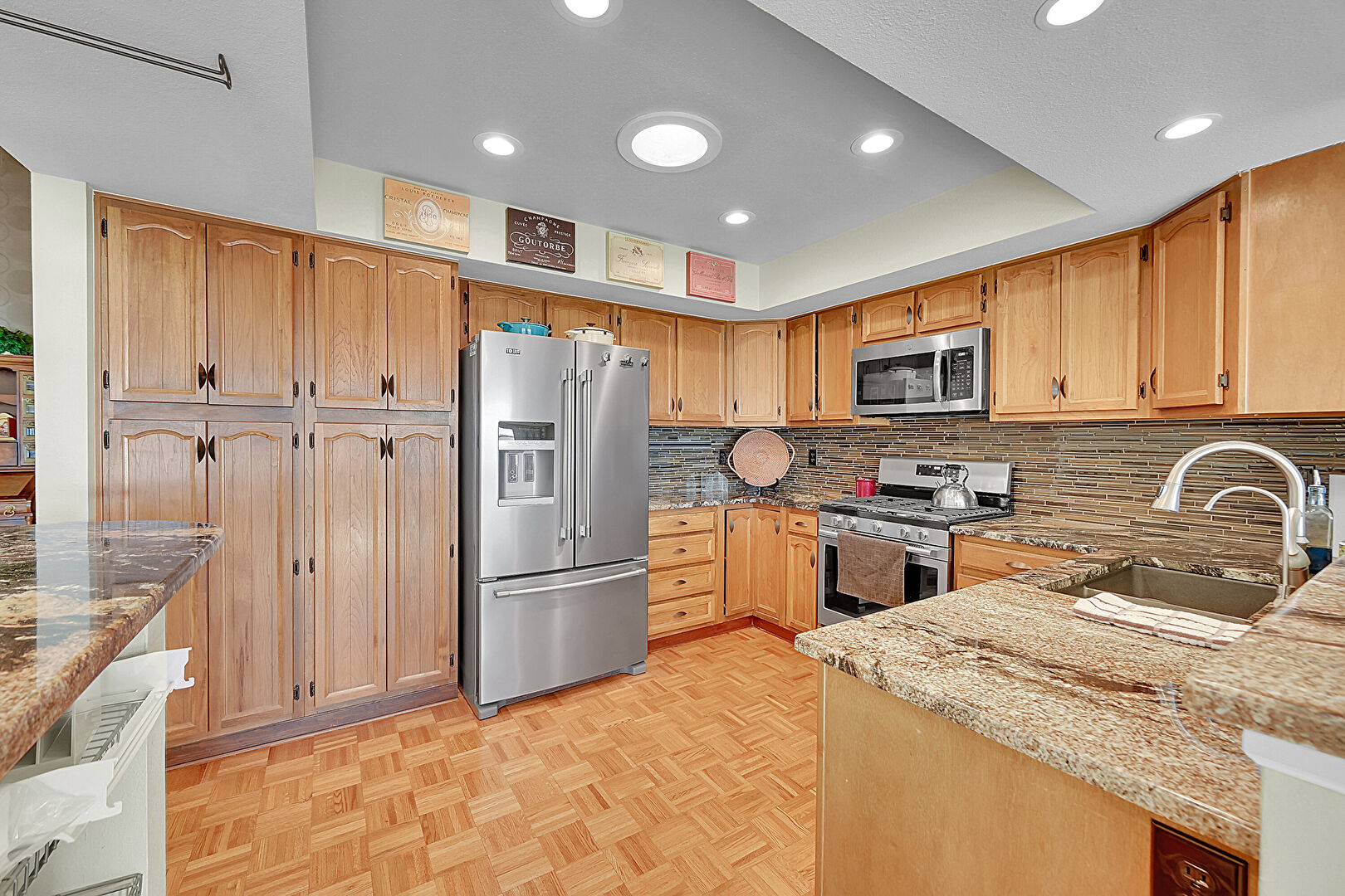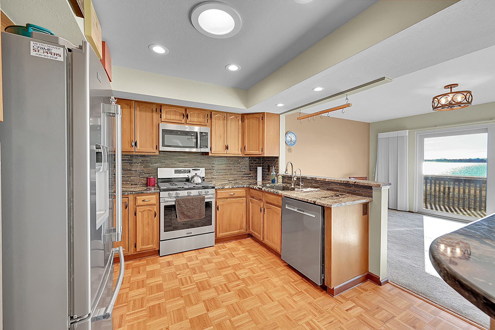 Arched Cabinets, Baseboards Wall, Carpet, Drywall, G Shaped Kitchen, Kitchen Bar, Kitchen Peninsula, Medium Brown Cabinets, Natural Light, Open Shelves, Opens To Living Area, Pendant Lighting, Recessed Lighting, Shaker Cabinets, Stone Countertops, Tray Ceiling, U Shaped Kitchen, Vent, Vinyl Floor, Visible Hinge Cabinets, Wallpaper Wall, Water View, Wood Finish Floor, Arched Cabinets, Medium Brown Cabinets, Natural Light, Stone Countertops