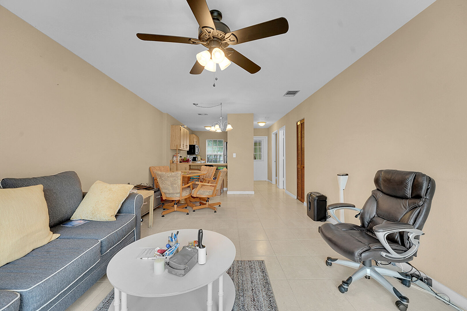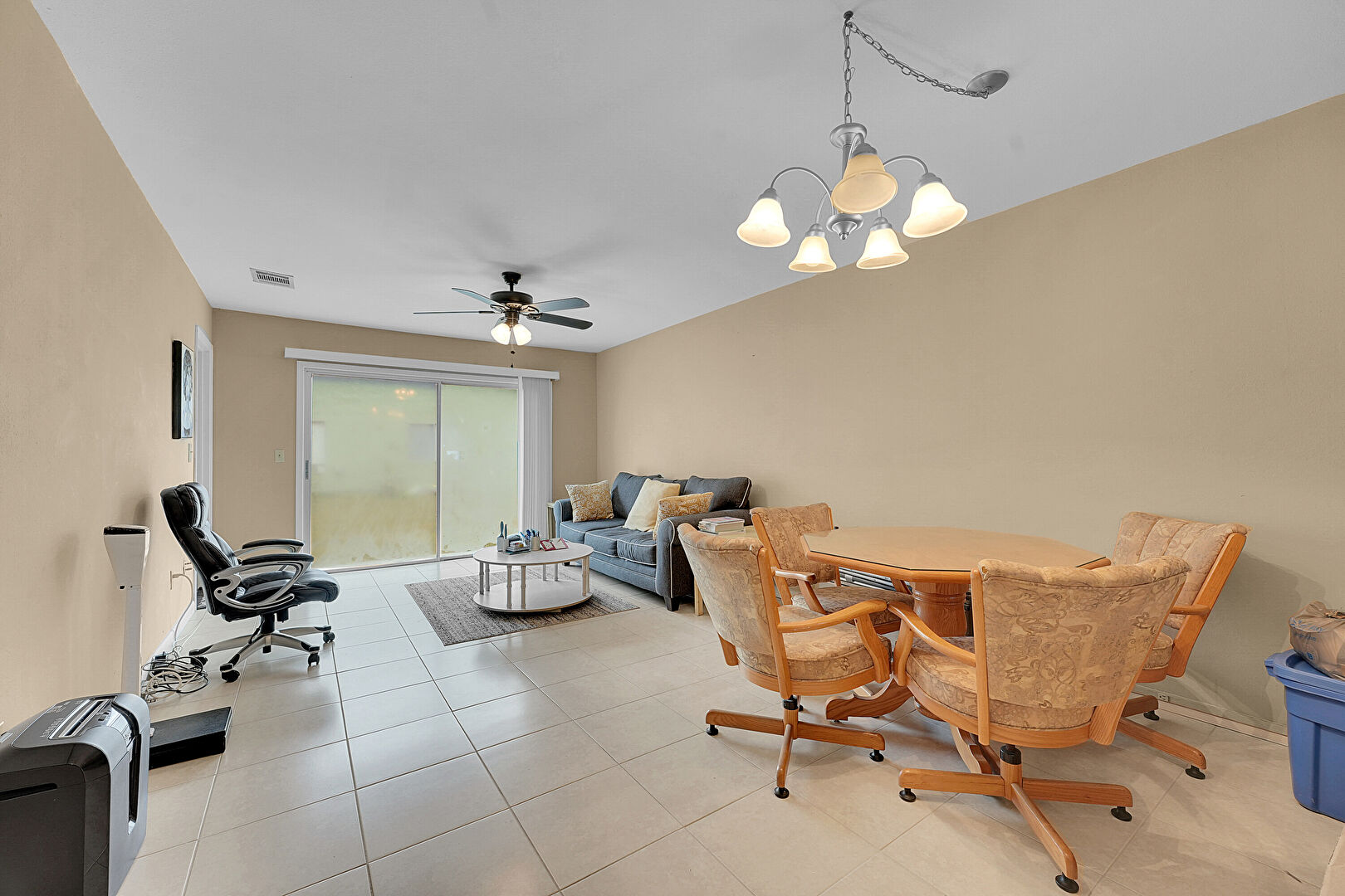 Baseboards Wall, Ceiling Fan, Drywall, Notable Chandelier, Tile Floor, Vent, Ceiling Fan, Natural Light