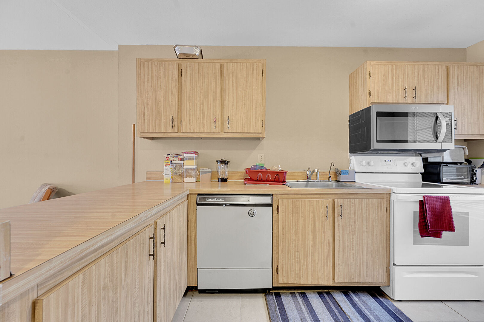 Drywall, Kitchen Peninsula, Toaster, Visible Hinge Cabinets, Tile Floor