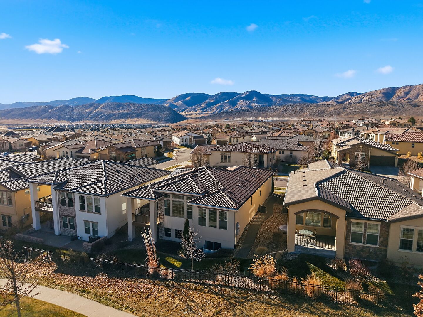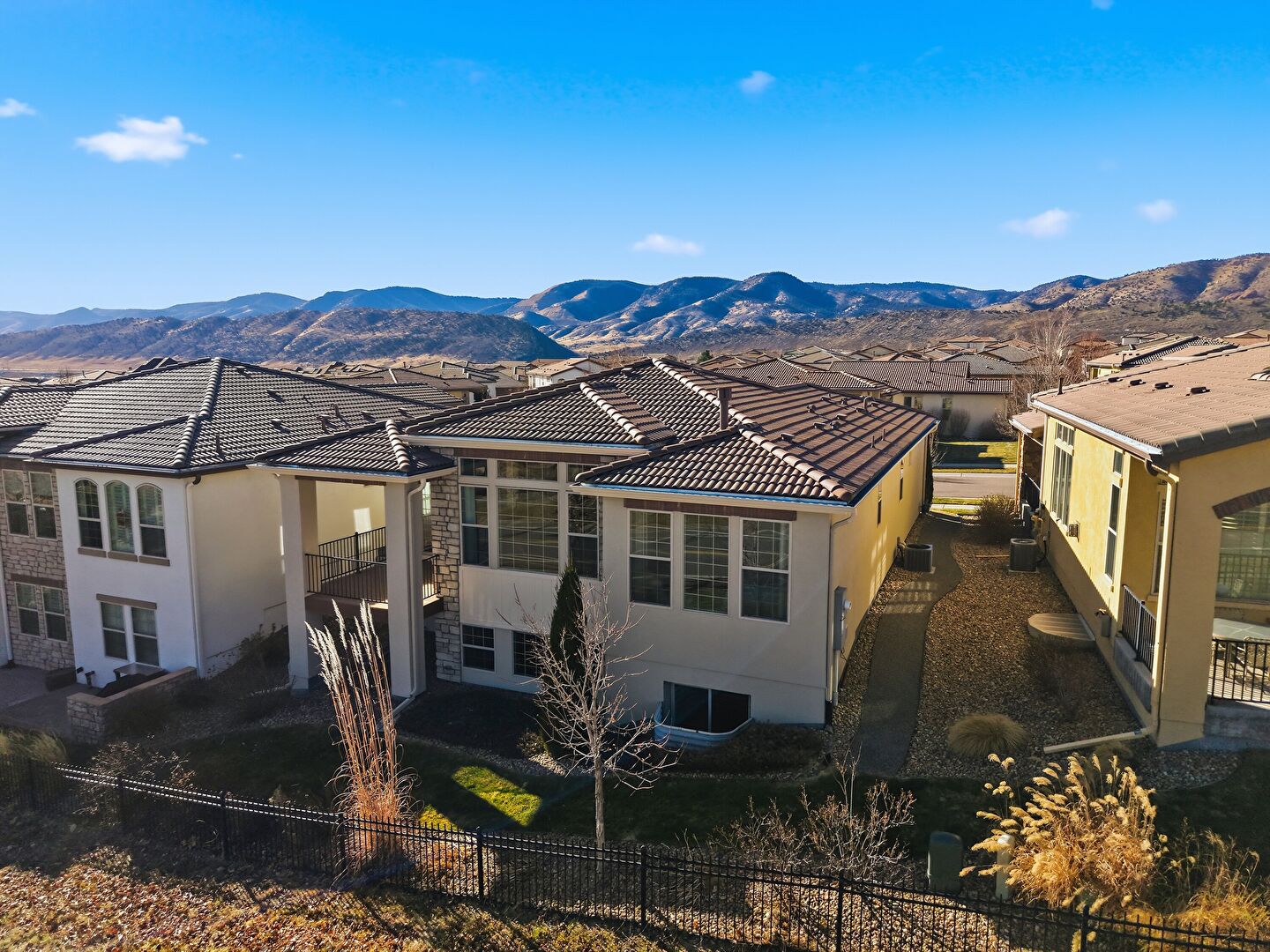 Central Ac, Concrete Foundation, Downspout, Driveway, Fence, Gas Meter, Gutters, Lawn, Mountain View, Residential View, Stone Siding, Stoop, Stucco Siding, Tile Roof, Downspout, Gutters, Patio, Stucco Siding, Tile Roof