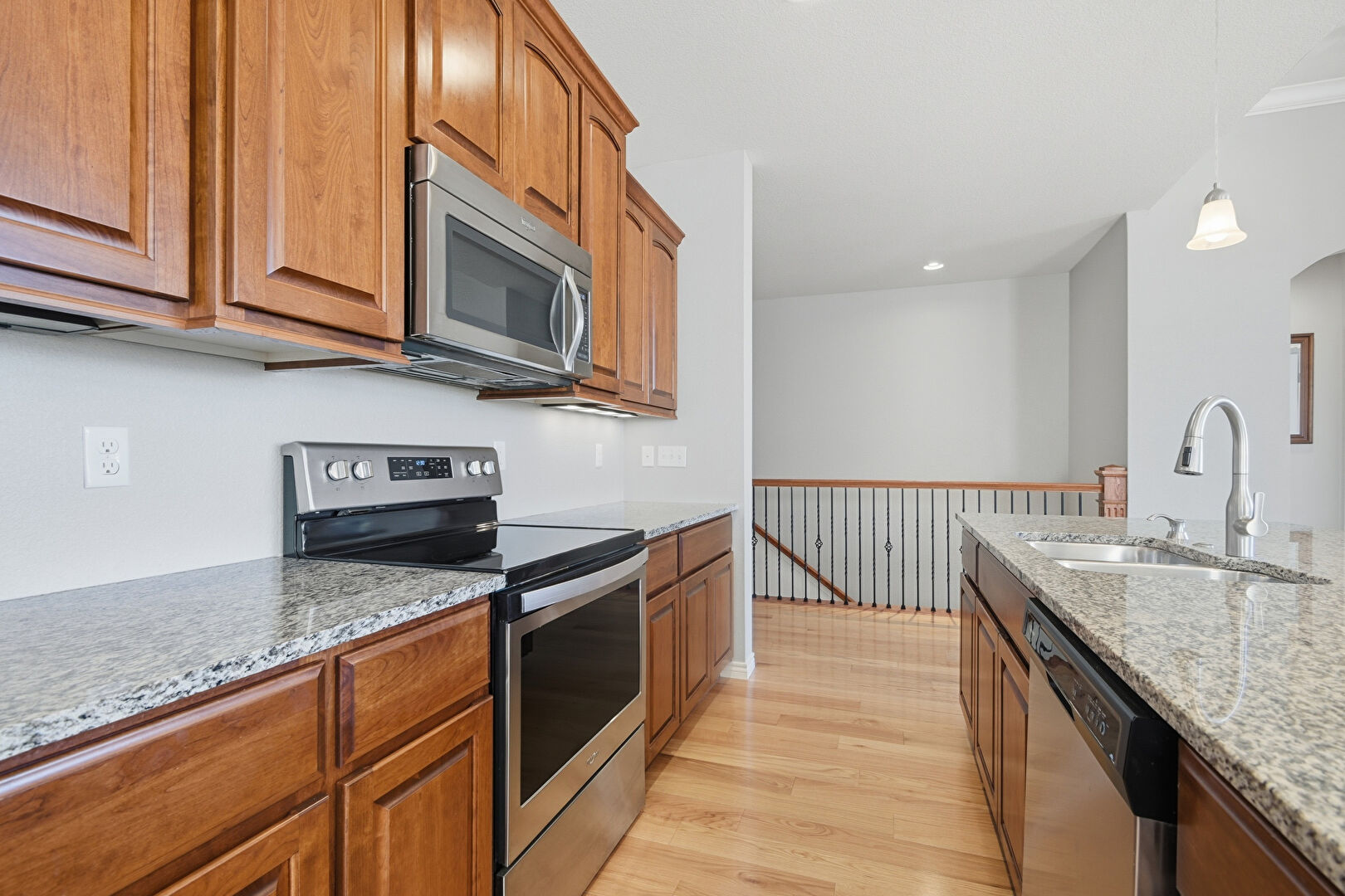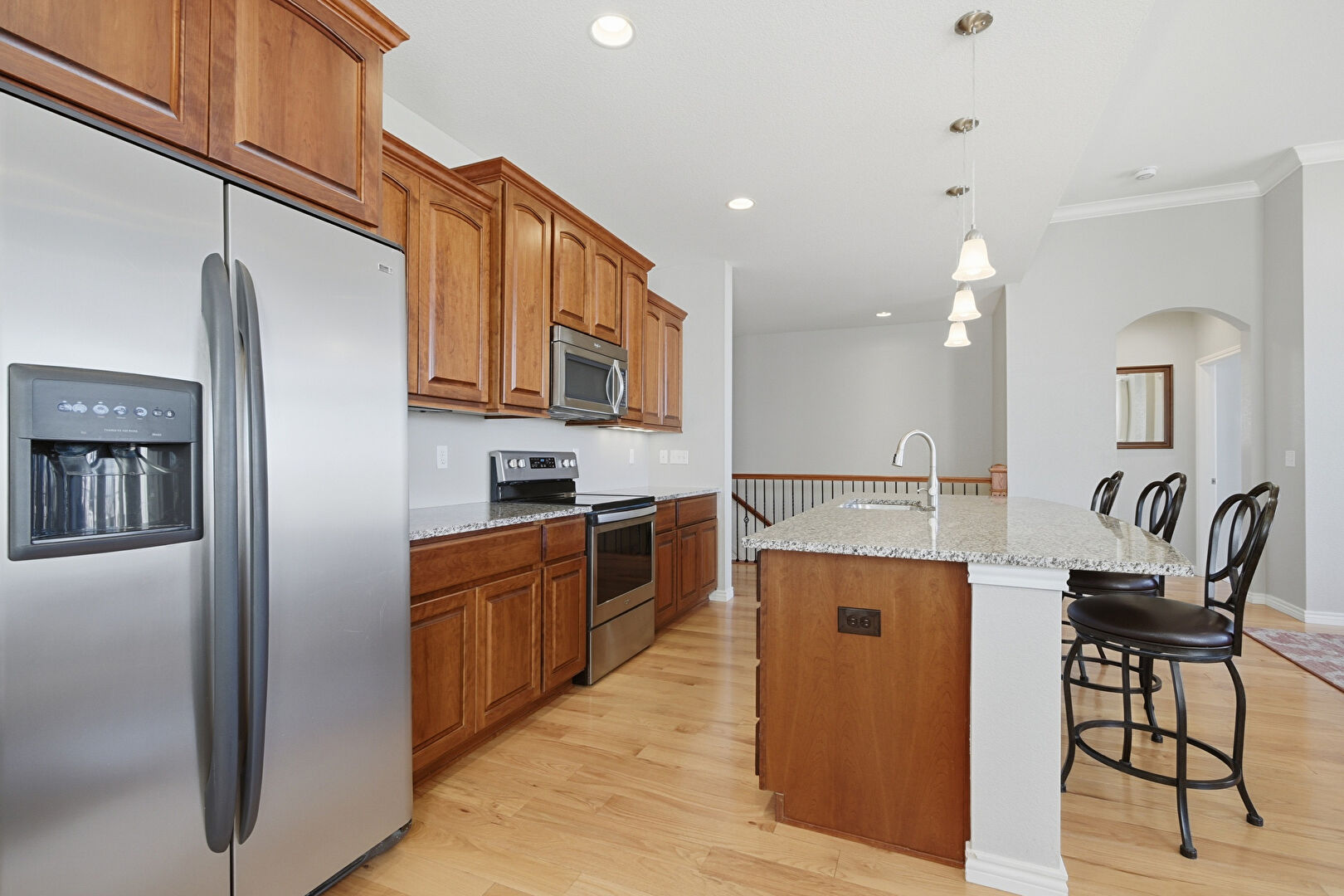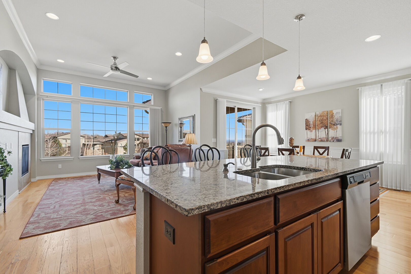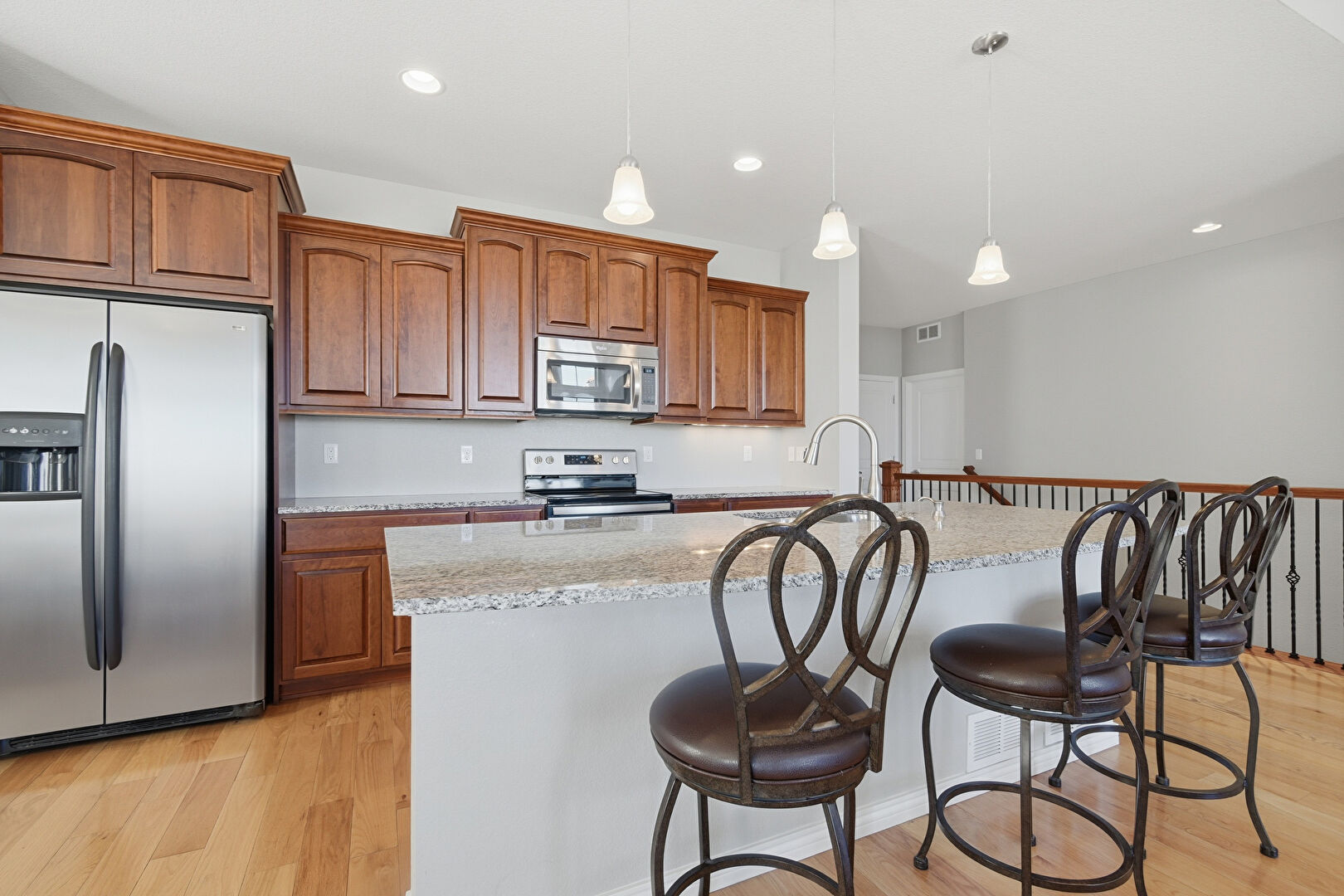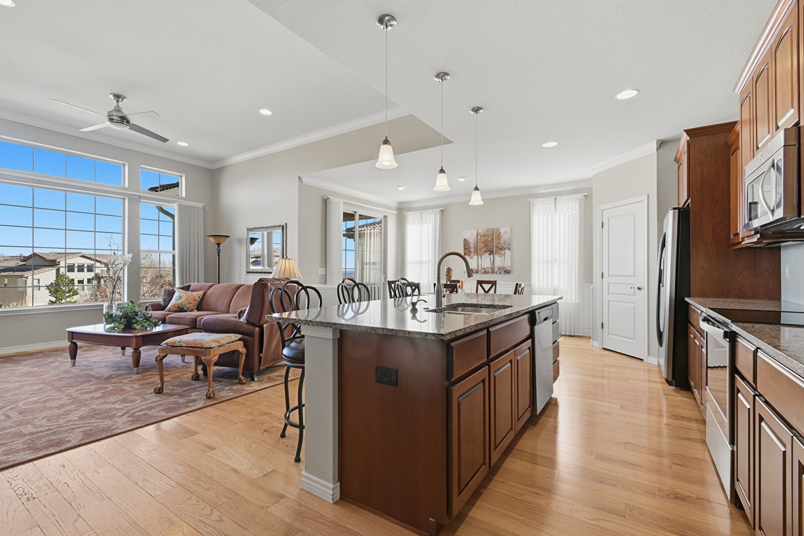 Arched Cabinets, Arched Walkways, Baseboards Wall, Ceiling Fan, Crown Molding, Crown Molding Cabinets, Dark Brown Cabinets, Drywall, Kitchen Bar, Kitchen Island, Medium Brown Cabinets, Natural Light, One Wall Kitchen, Opens To Living Area, Pendant Lighting, Raised Cabinets, Recessed Lighting, Stone Countertops, Vent, Wood Finish Floor, Arched Cabinets, Crown Molding Cabinets, Kitchen Bar, Recessed Lighting, Stone Countertops, Wood Finish Floor
