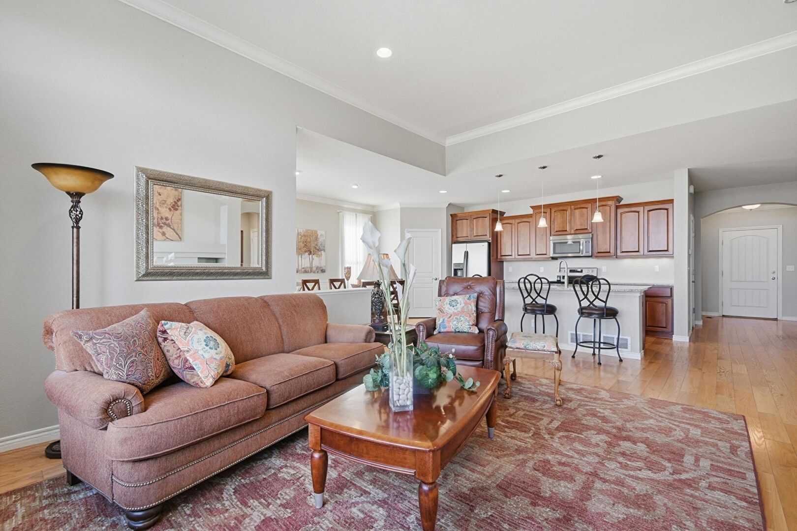 Arched Walkways, Baseboards Wall, Carpet, Ceiling Fan, Crown Molding, Drywall, Fireplace, French Doors, High Ceiling, Natural Light, One Wall Kitchen, Recessed Lighting, Vent, Wood Finish Floor, Baseboards Wall, Fireplace, Recessed Lighting, Wood Finish Floor