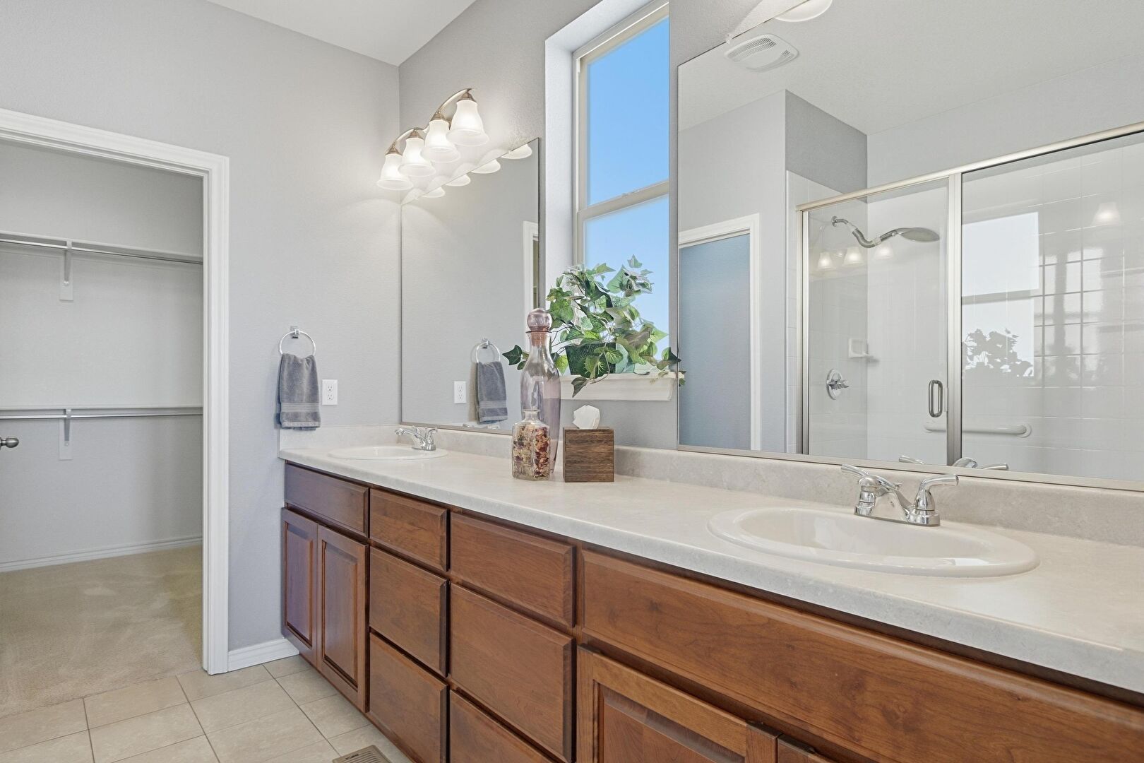 Baseboards Wall, Carpet, Combined Bath Shower, Crown Molding, Double Vanity, Drywall, Ensuite Bathroom, Full Bathroom, Natural Light, Textured Wall, Tile Floor, Vanity, Vent, Walk In Closet, Water Closet, Carpet, Drywall, Natural Light, Vanity