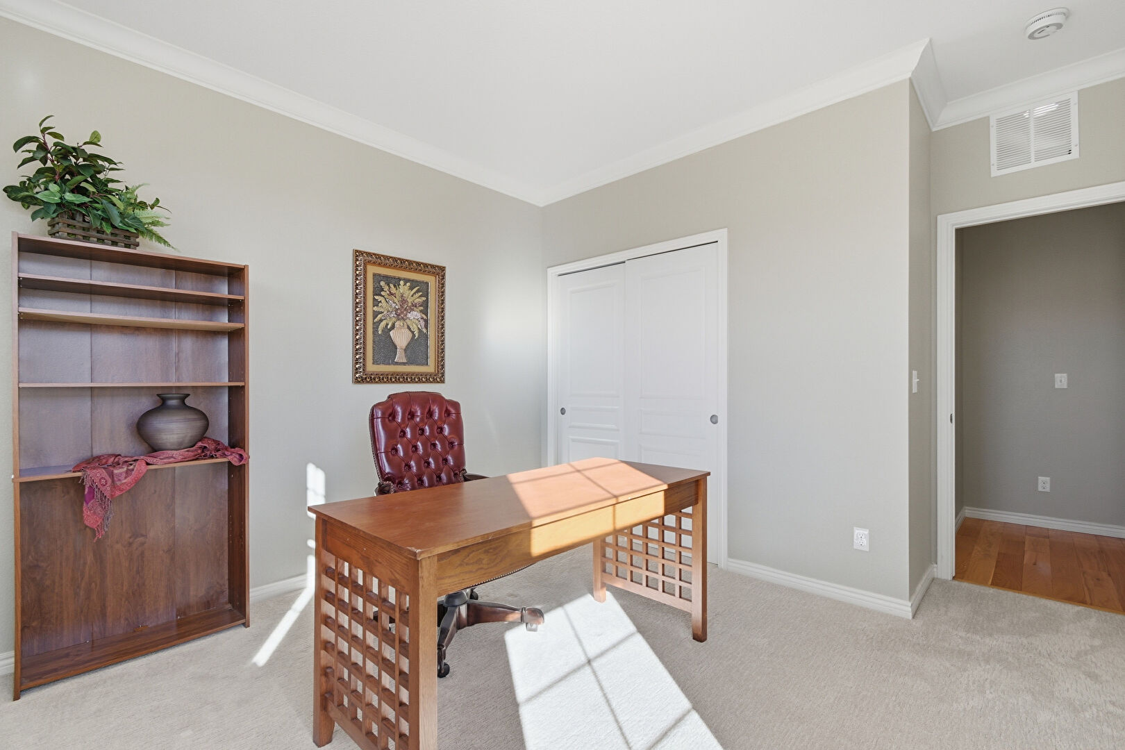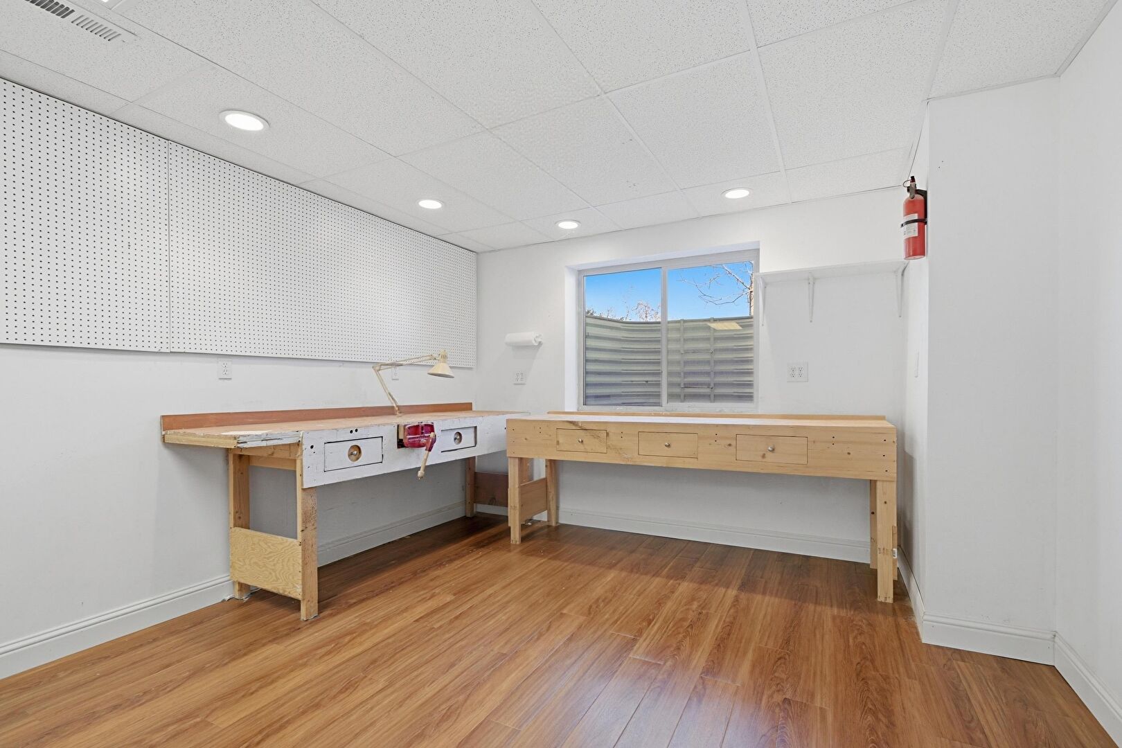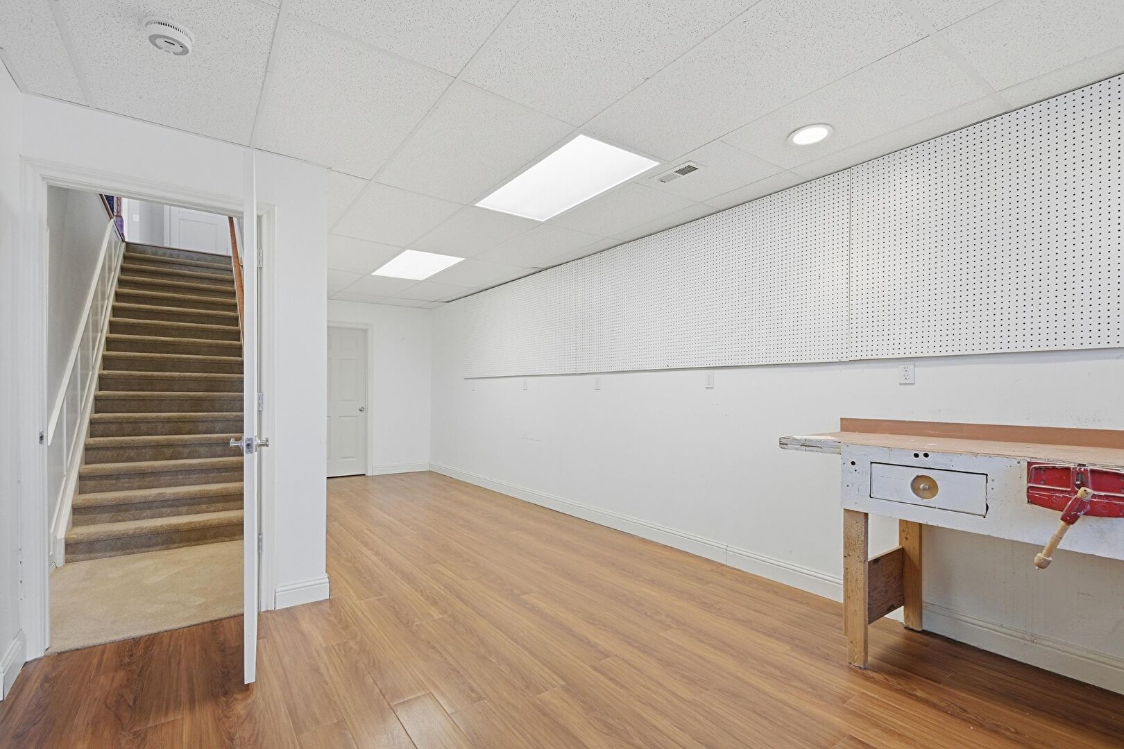 Baseboards Wall, Basement, Carpet, Crown Molding, Drop Ceiling, Drywall, Fire Extinguisher, Natural Light, Office Area, Recessed Lighting, Stairs, Vent, Wood Finish Floor, Baseboards Wall, Carpet, Office Area, Vent