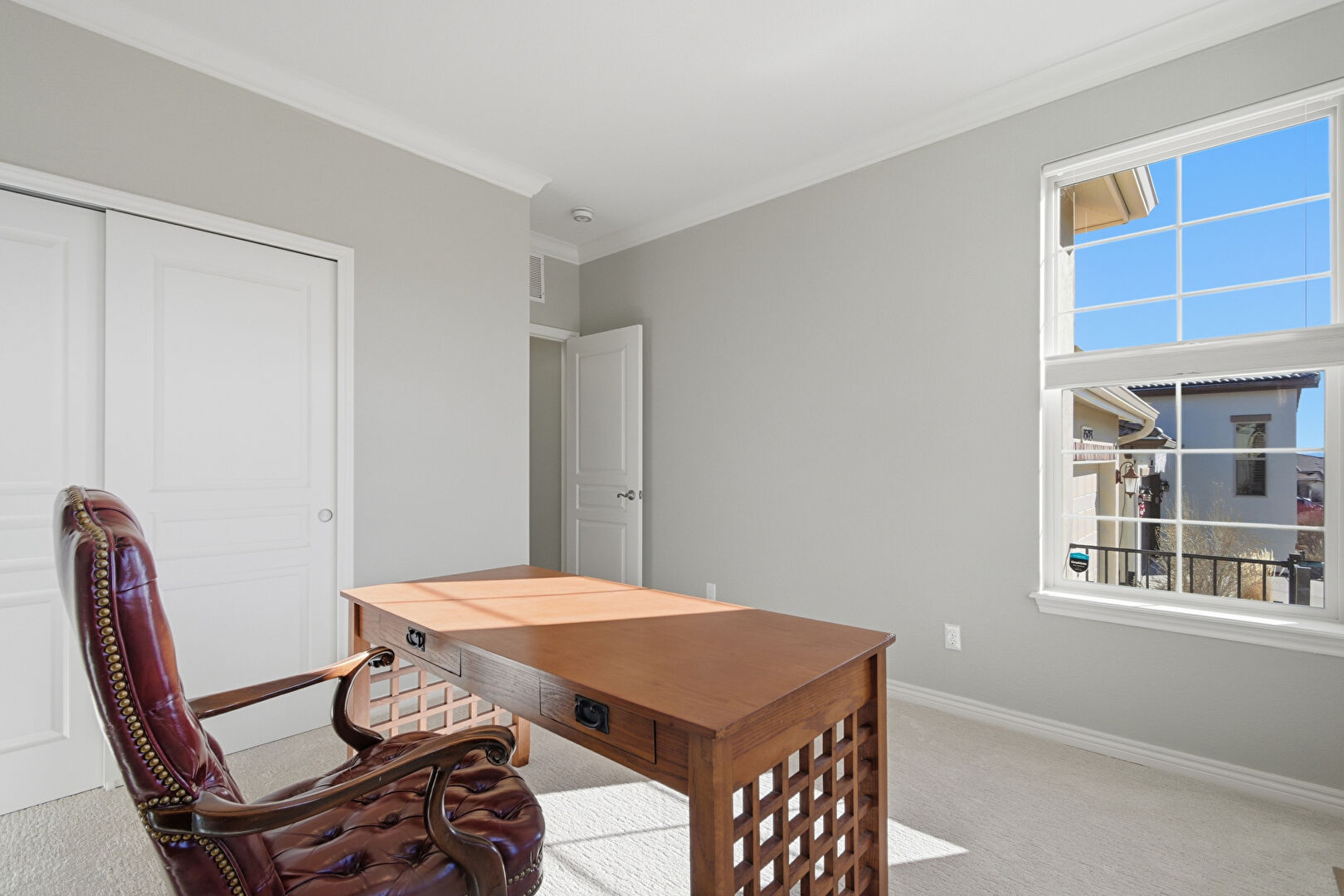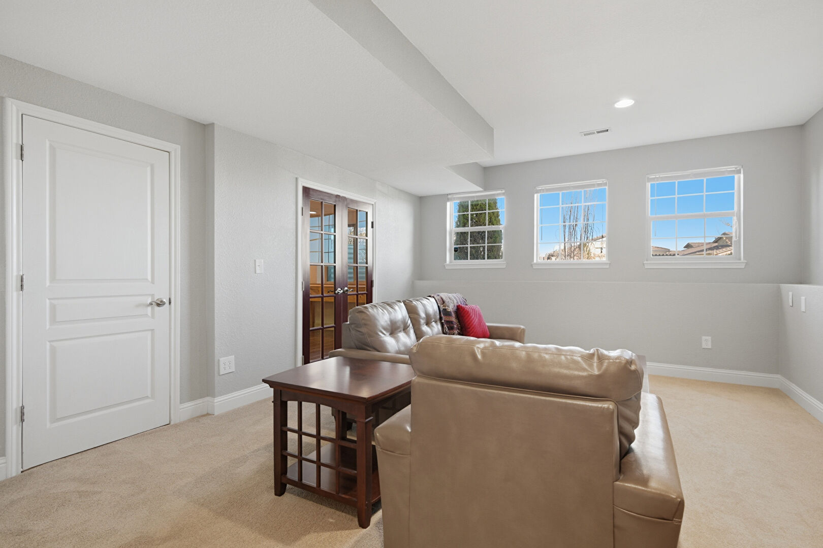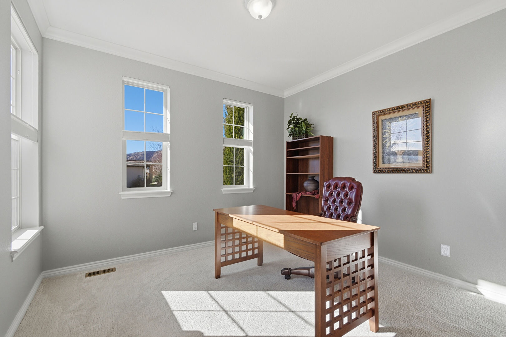 Baseboards Wall, Basement, Carpet, Crown Molding, Drop Ceiling, Drywall, Fire Extinguisher, Natural Light, Office Area, Recessed Lighting, Stairs, Vent, Wood Finish Floor, Baseboards Wall, Carpet, Office Area, Vent