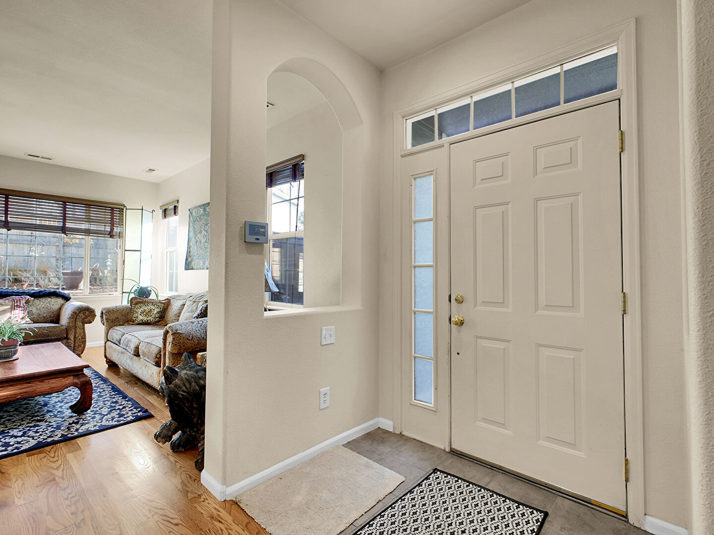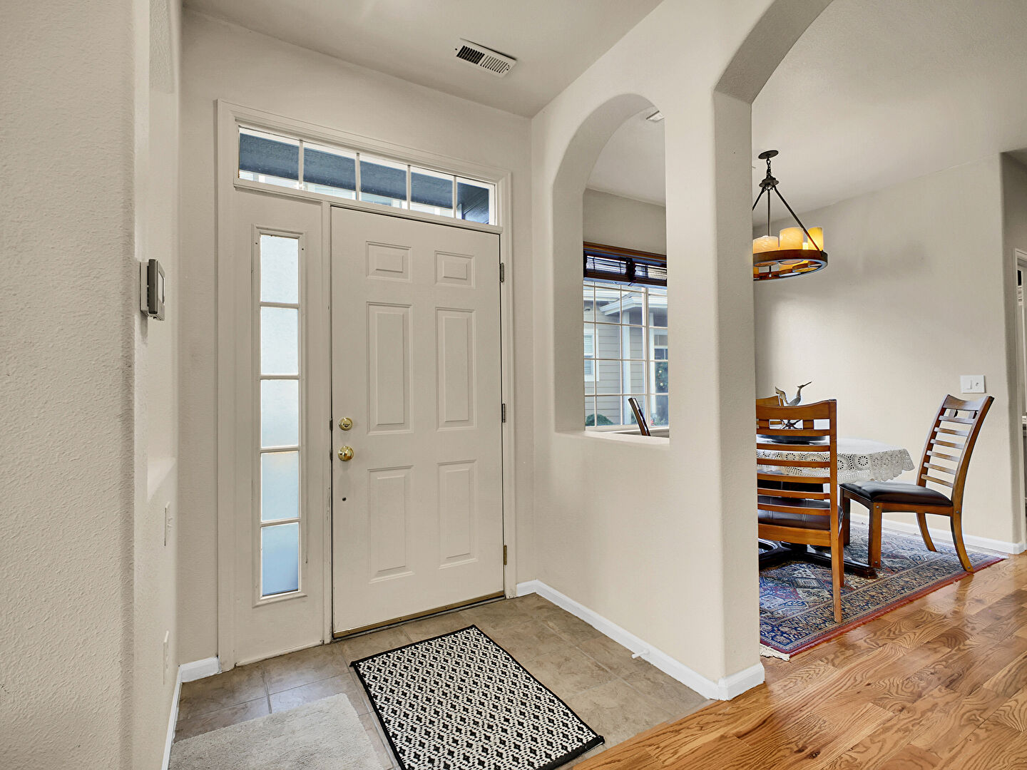 Arched Walkways, Baseboards Wall, Drywall, Natural Light, Vent, Wood Finish Floor, Drywall, Tile Floor