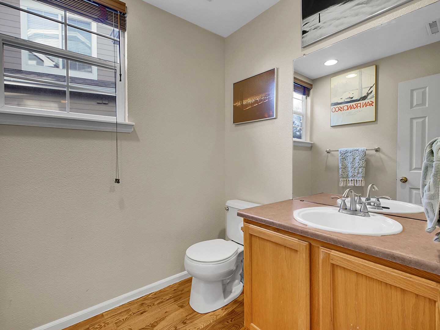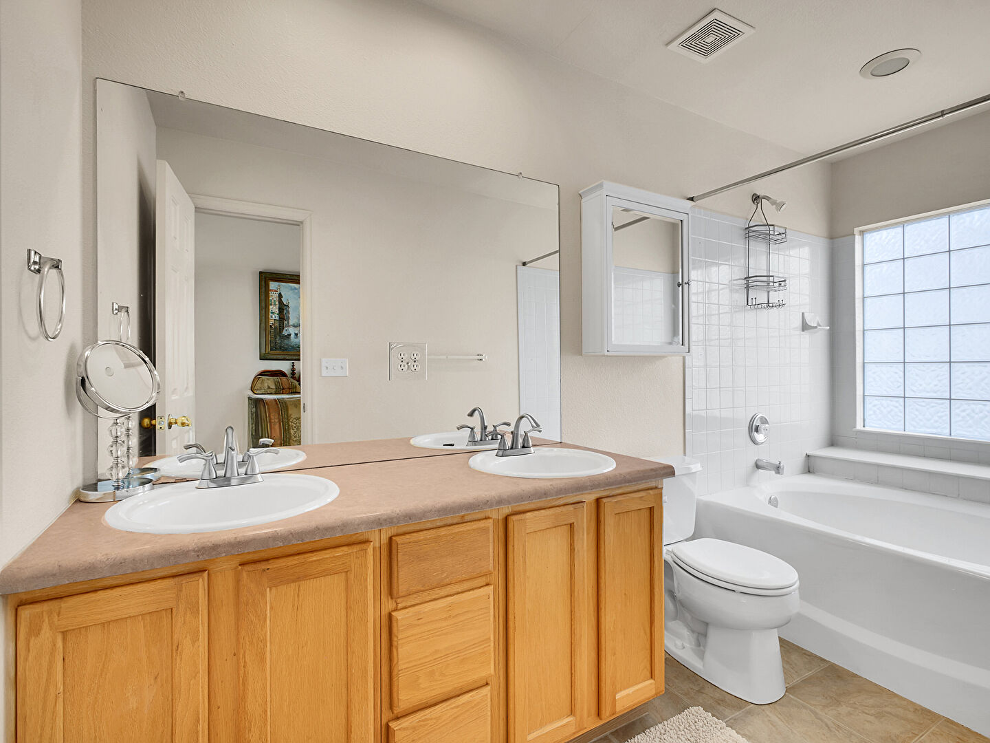 Baseboards Wall, Combined Bath Shower, Double Vanity, Drywall, Full Bathroom, Half Bathroom, Natural Light, Tile Floor, Vanity, Vent, Wood Finish Floor, Combined Bath Shower, Natural Light, Textured Wall, Vanity