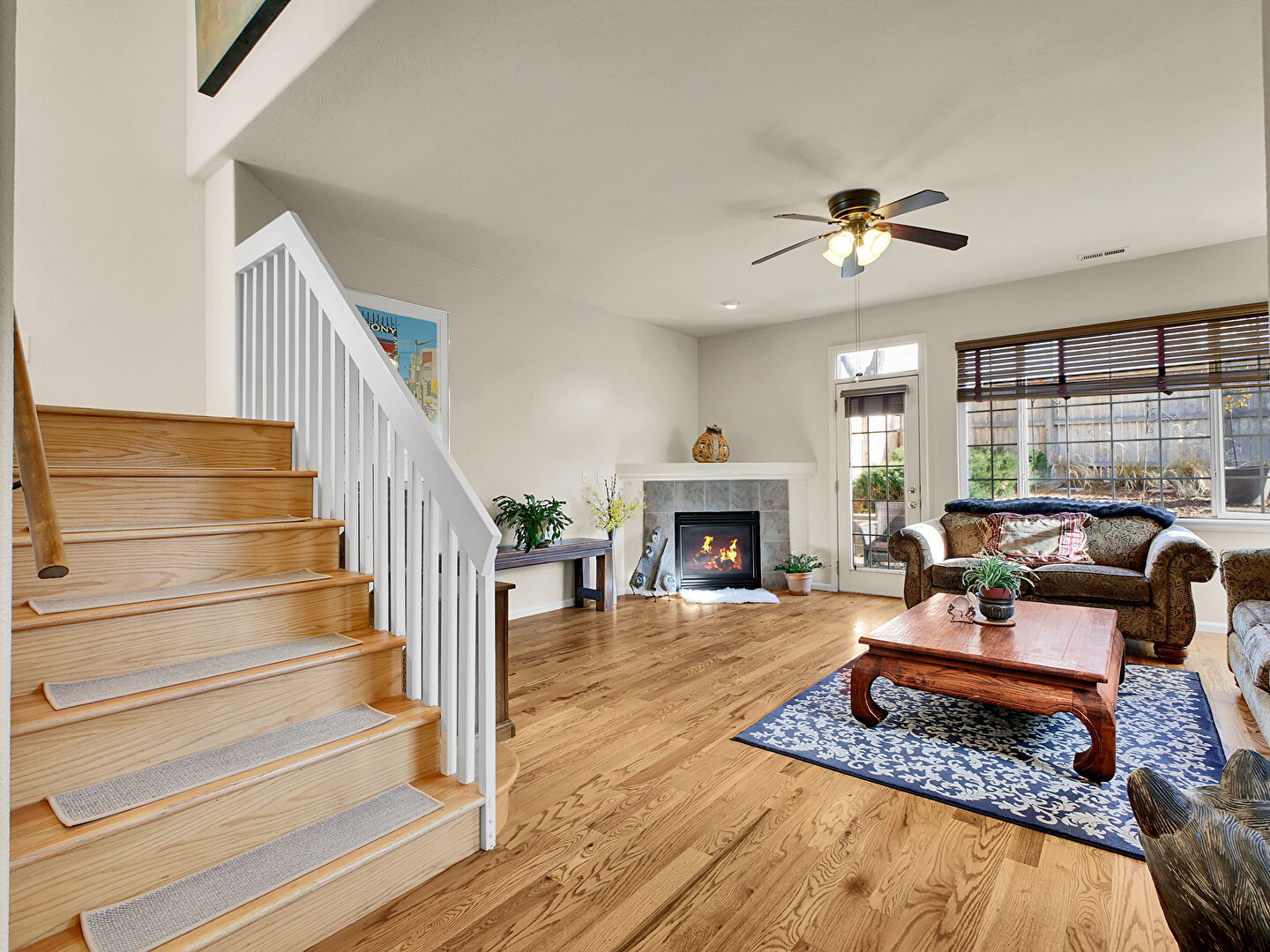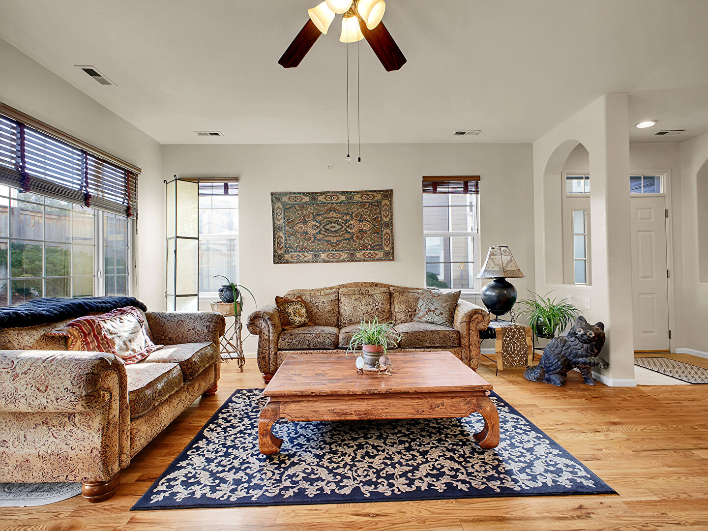 Arched Walkways, Baseboards Wall, Ceiling Fan, Drywall, Fireplace, Natural Light, Recessed Lighting, Stairs, Vent, Wood Finish Floor, Baseboards Wall, Ceiling Fan, Natural Light, Recessed Lighting, Stairs, Wood Finish Floor