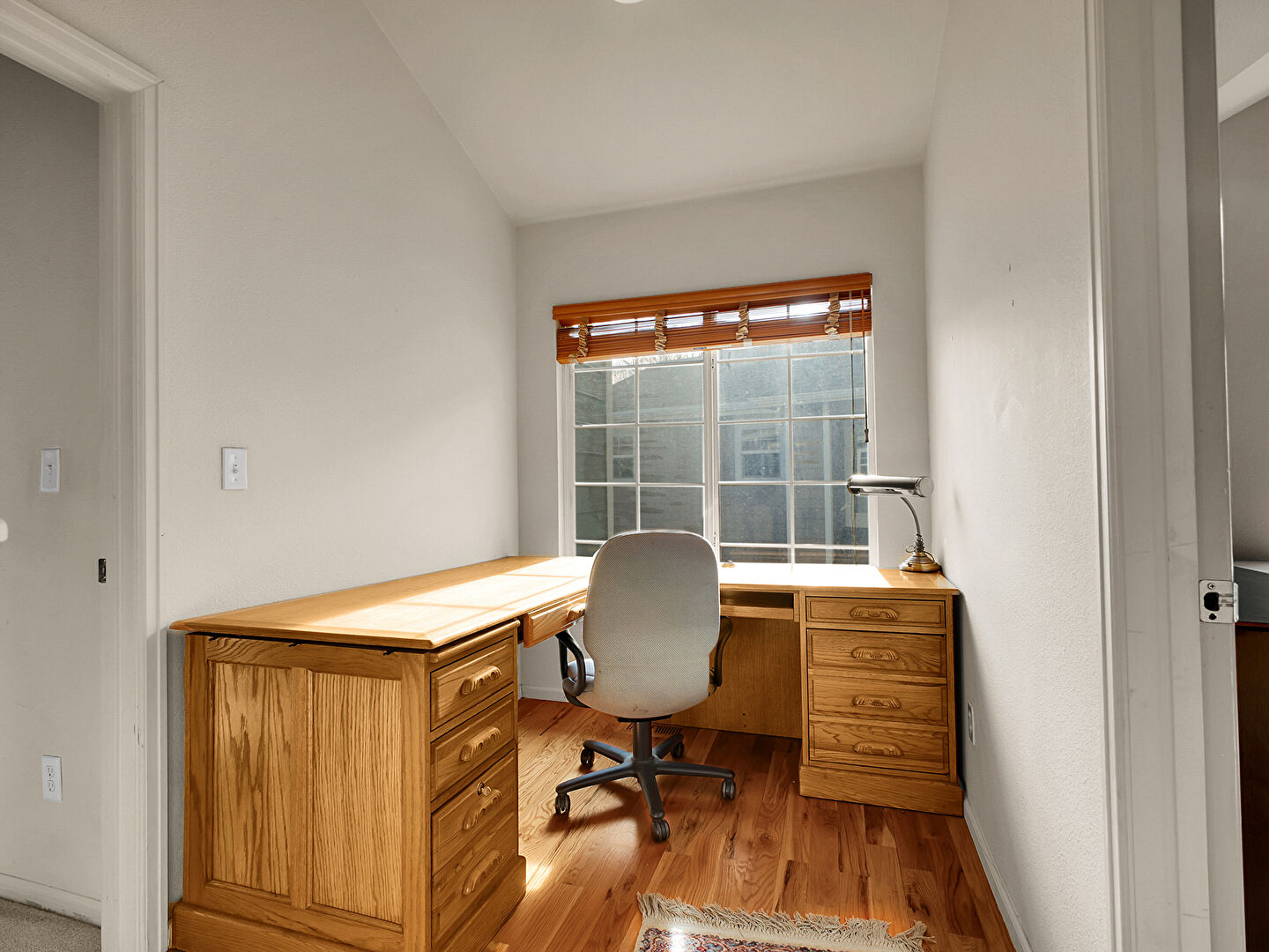 Drywall, Natural Light, Office Area, Vaulted Ceiling, Wood Finish Floor, Baseboards Wall