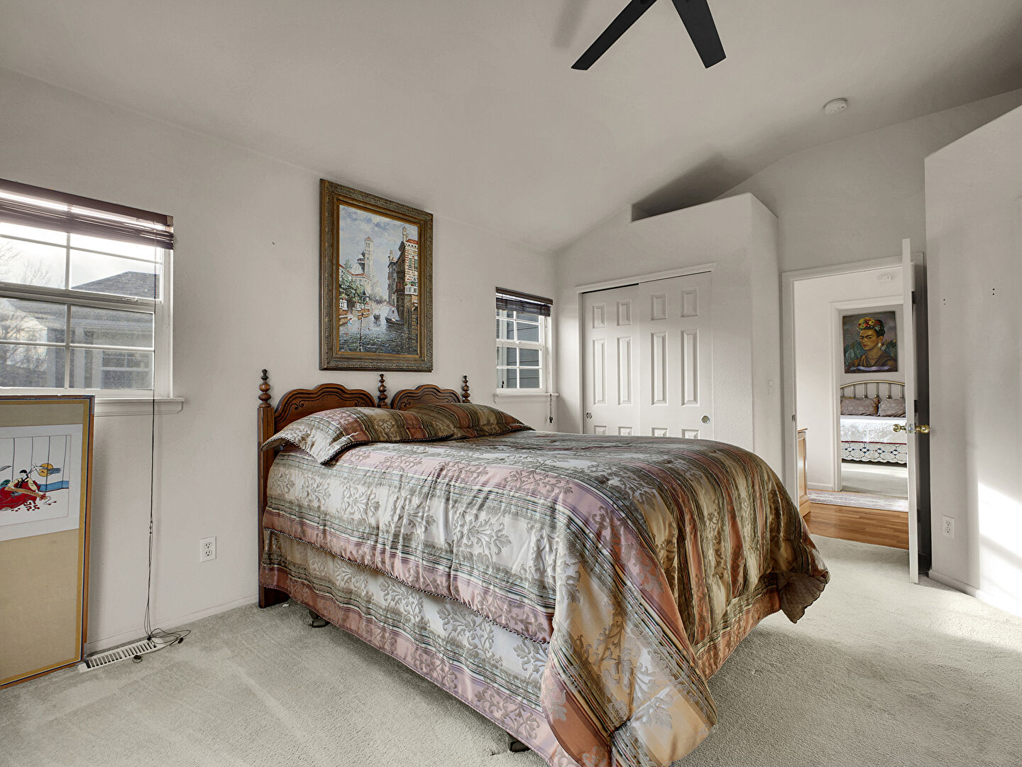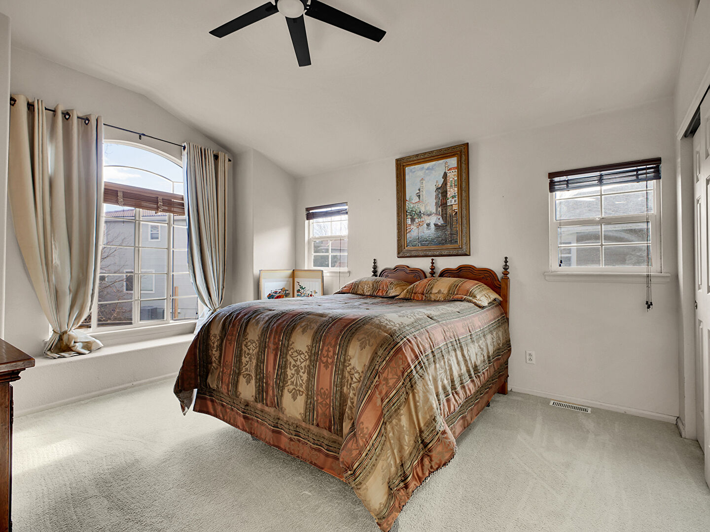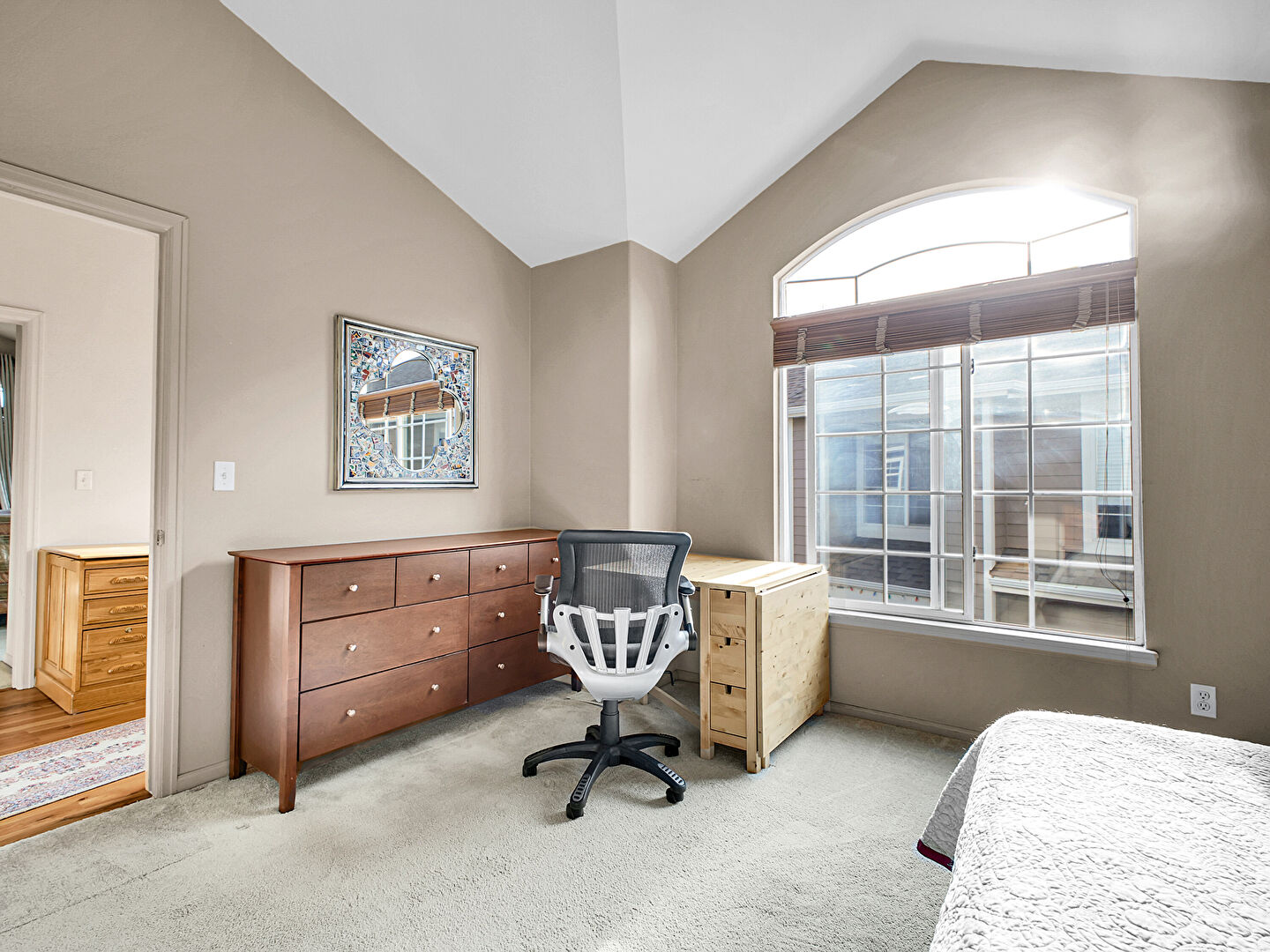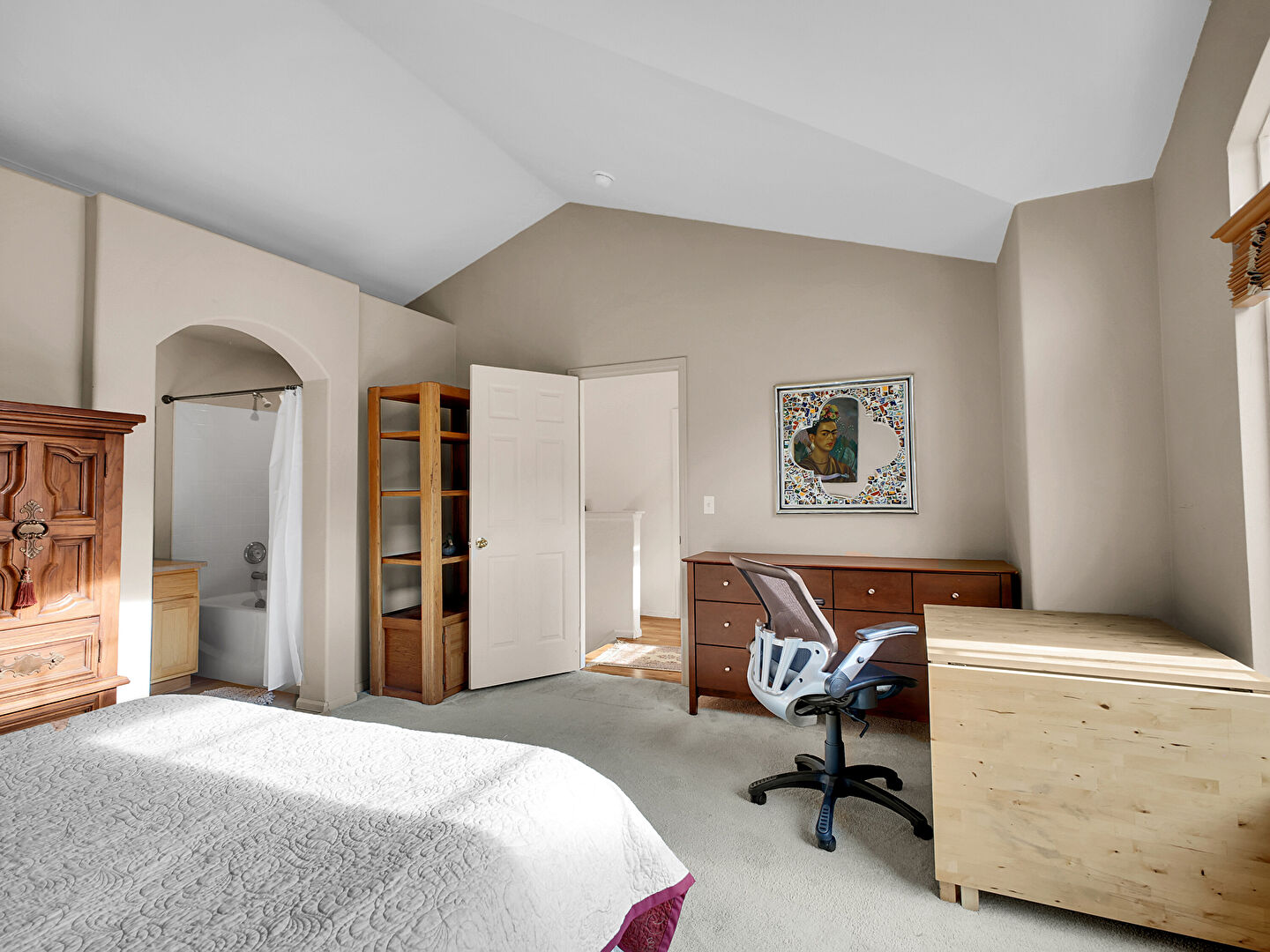 Arched Walkways, Baseboards Wall, Carpet, Cathedral Ceiling, Ceiling Fan, Closet, Drywall, Ensuite Bathroom, Natural Light, Office Area, Vaulted Ceiling, Vent, Arched Walkways, Carpet, Ceiling Fan, Natural Light, Office Area, Vaulted Ceiling, Vent