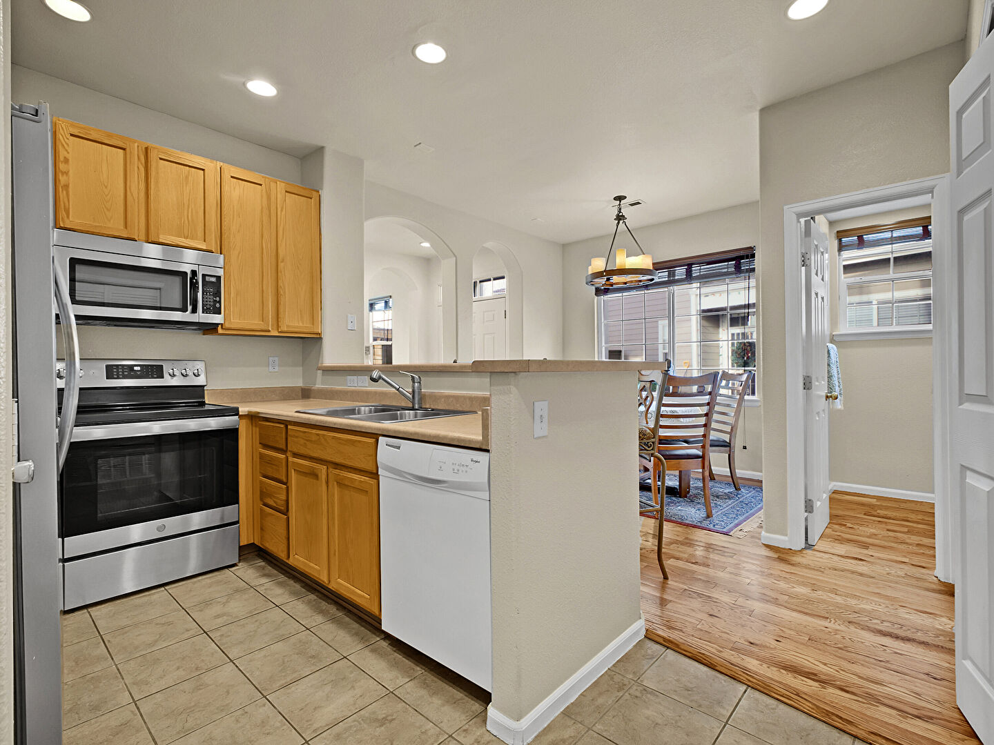 Arched Walkways, Baseboards Wall, Ceiling Fan, Drywall, Kitchen Bar, Kitchen Peninsula, L Shaped Kitchen, Medium Brown Cabinets, Natural Light, Notable Chandelier, Opens To Living Area, Pendant Lighting, Recessed Lighting, Shaker Cabinets, Tile Floor, Vent, Wood Finish Floor, Kitchen Bar, Kitchen Peninsula, Natural Light, Shaker Cabinets, Tile Floor