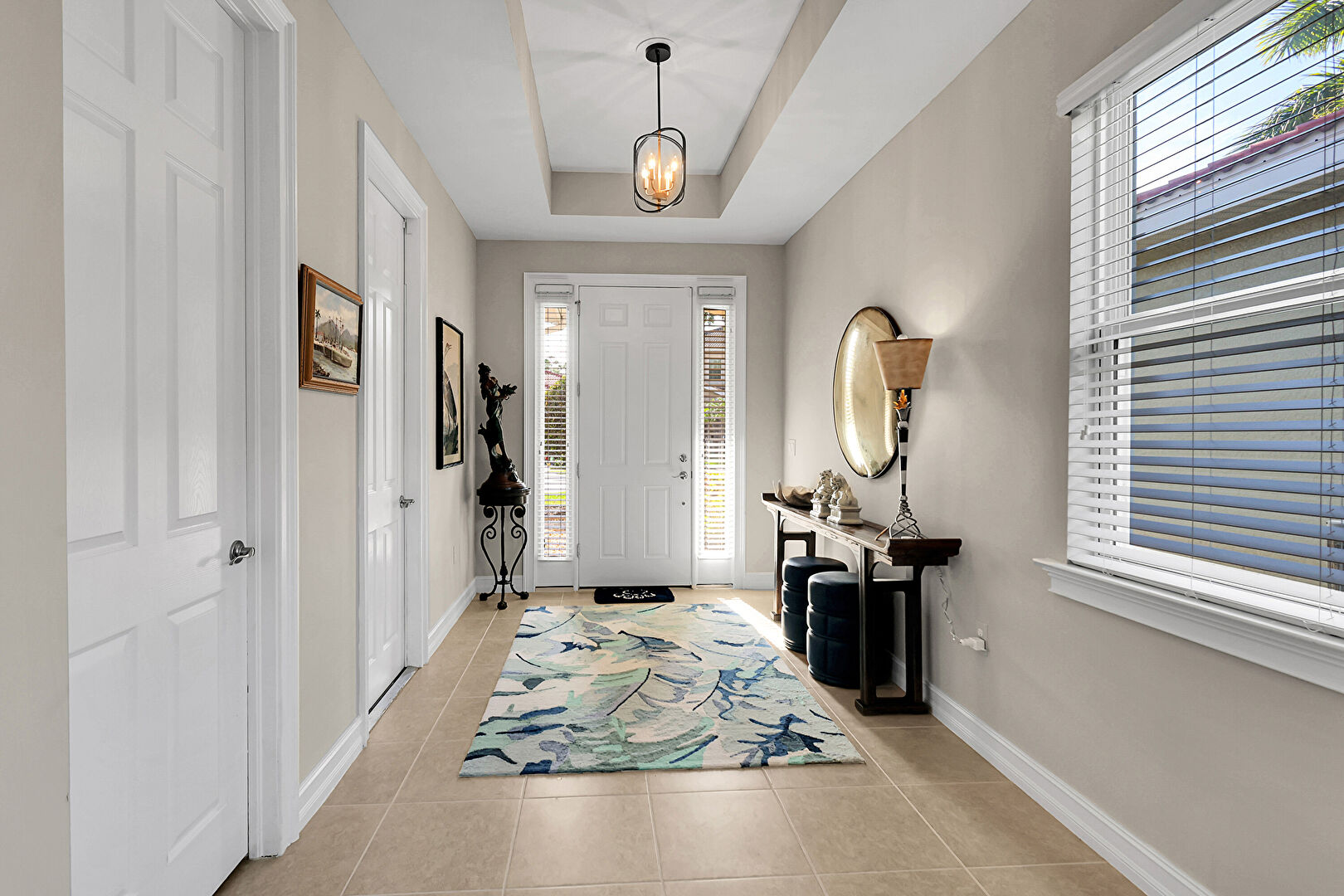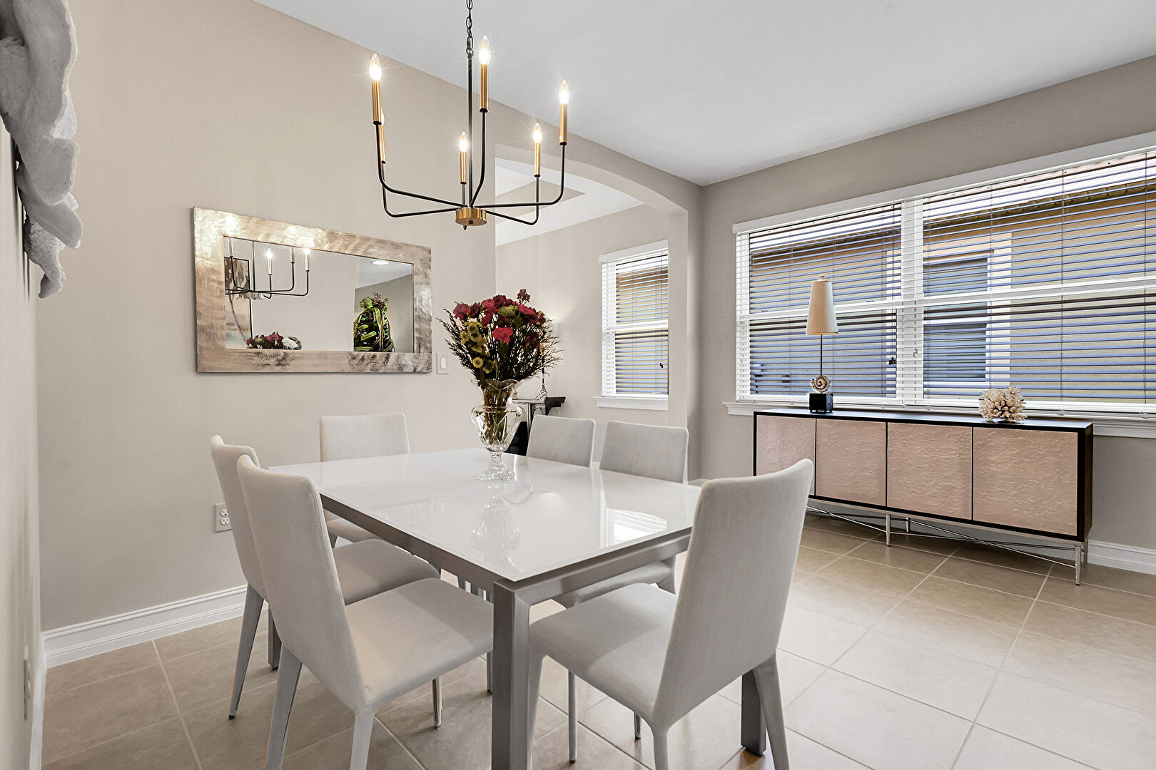 Baseboards Wall, Drywall, Natural Light, Tile Floor, Tray Ceiling, Notable Chandelier
