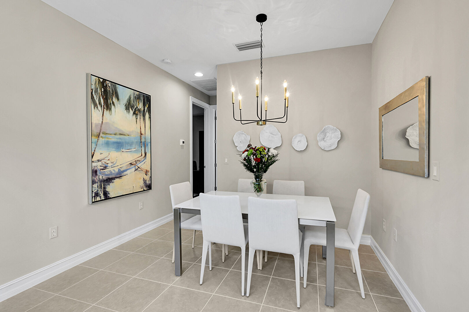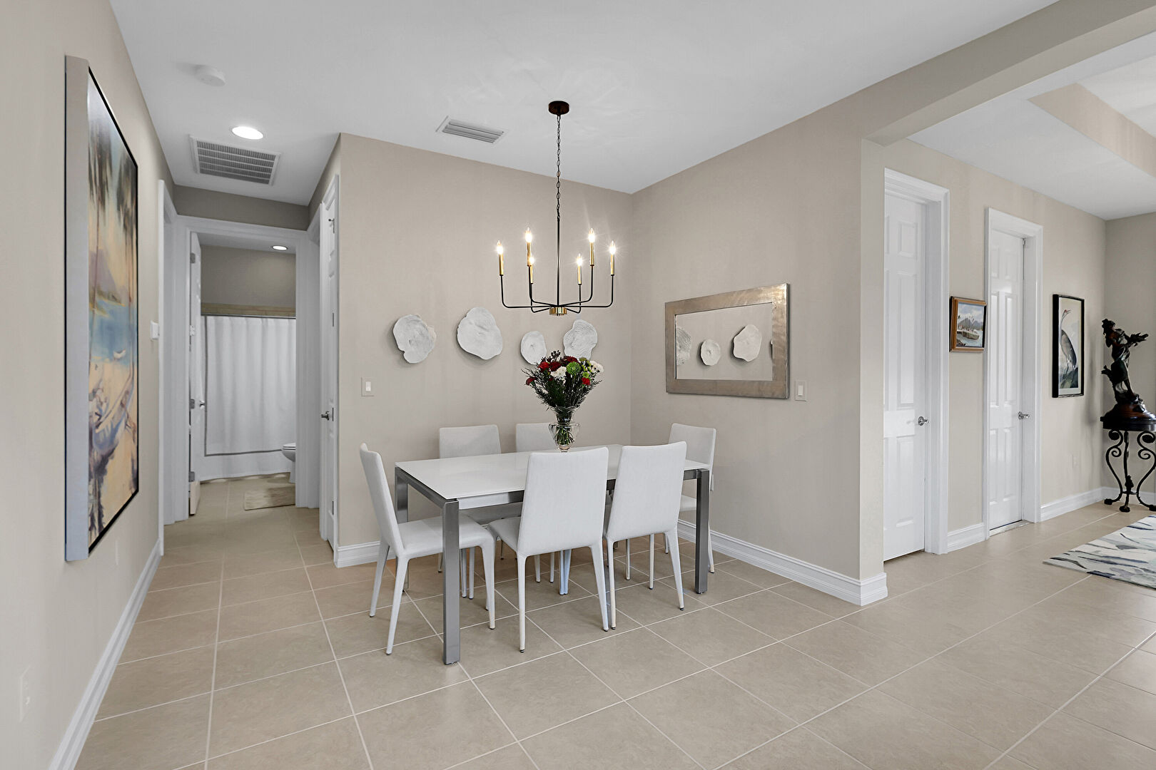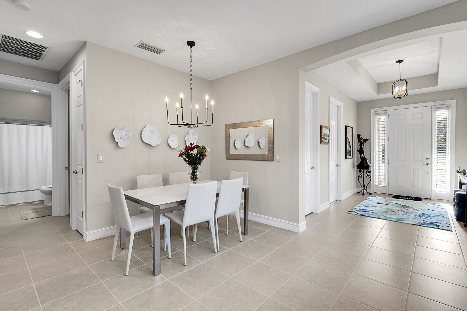Baseboards Wall, Drywall, Natural Light, Notable Chandelier, Recessed Lighting, Tile Floor, Tray Ceiling, Vent, Drywall, Notable Chandelier, Recessed Lighting, Vent