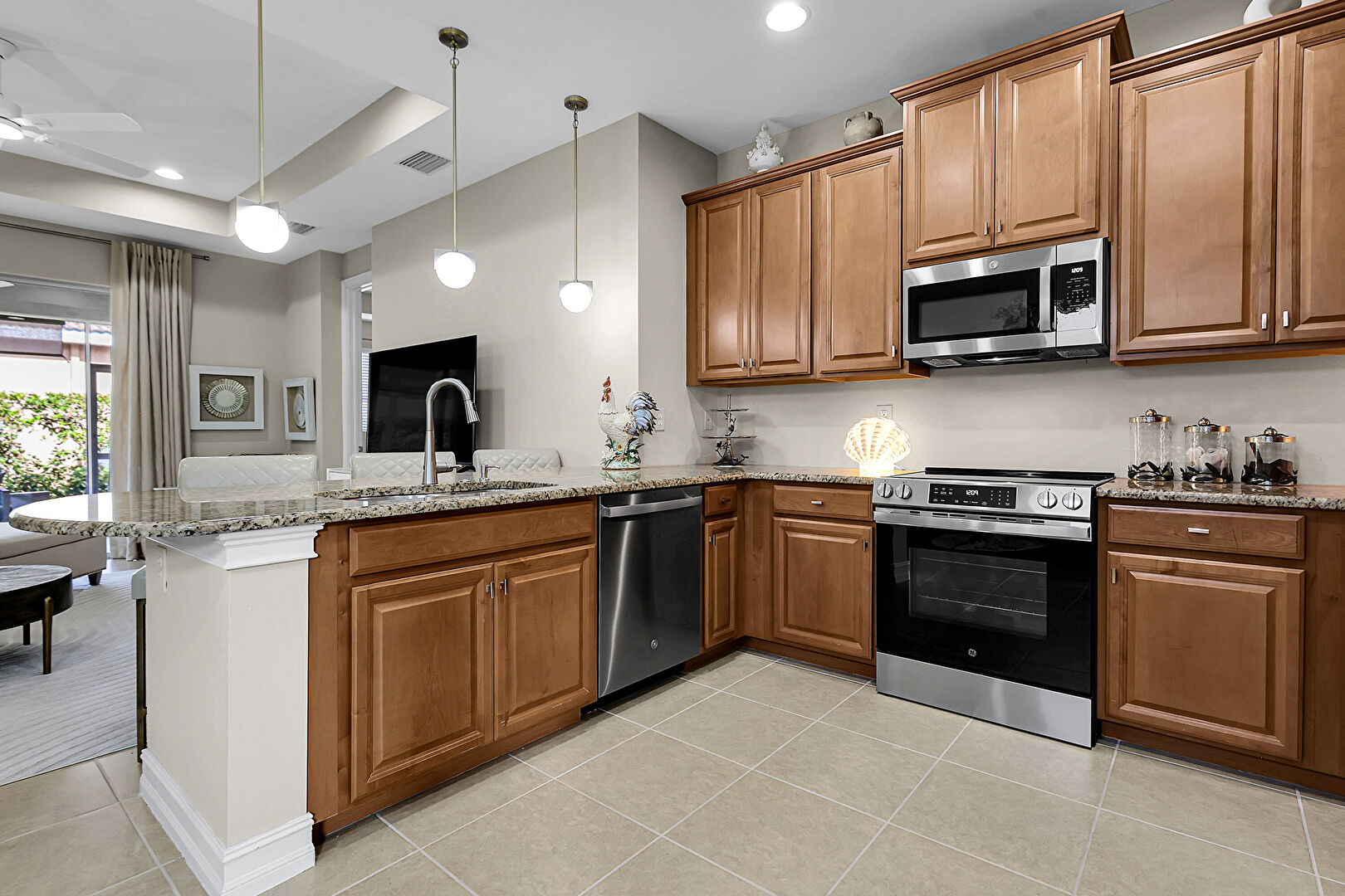 Baseboards Wall, Ceiling Fan, Crown Molding Cabinets, Drywall, Kitchen Bar, Kitchen Peninsula, Medium Brown Cabinets, Natural Light, Opens To Living Area, Pendant Lighting, Raised Cabinets, Recessed Lighting, Stone Countertops, Tile Floor, Tray Ceiling, U Shaped Kitchen, Vent, Kitchen Peninsula, Medium Brown Cabinets, Tray Ceiling, U Shaped Kitchen, Vent